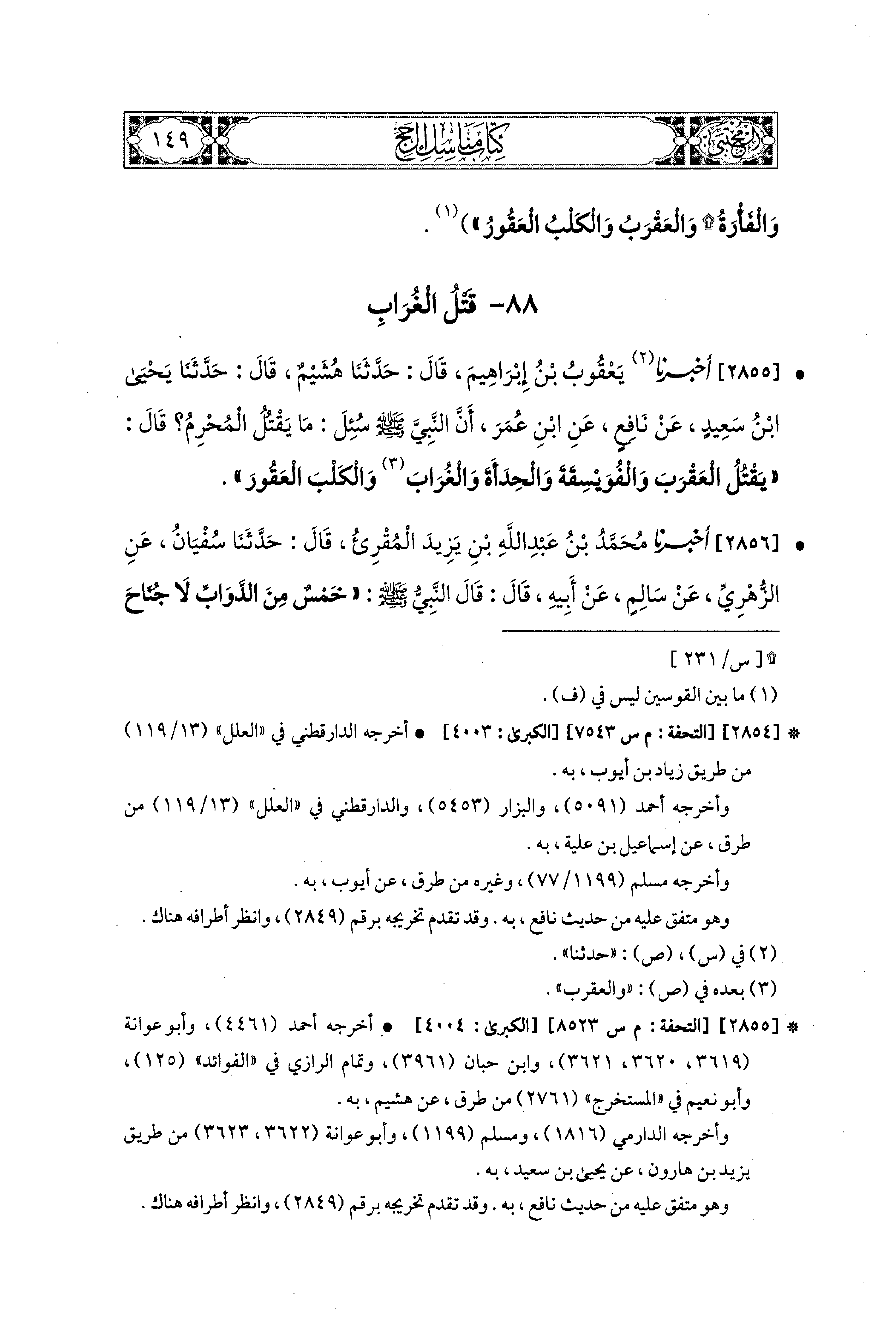 2855 - أَخبَرَنا يَعقُوبُ بْنُ إِبراهِيمَ، قال: حَدثنا هُشَيْمٌ، قال: حَدثنا يَحيَى بْنُ سَعيدٍ، عَن نَافِعٍ، عَنِ ابنِ عُمَرَ، أَنَّ النَّبيَّ صَلى الله عَليه وسَلم سُئِلَ مَا يَقْتُلُ المُحْرِمُ؟ قَالَ: يَقْتُلُ العَقْرَبَ، وَالفُوَيْسِقَةَ، وَالحِدَأَةَ، وَالغُرَابَ، وَالكَلْبَ العَقُورَ.