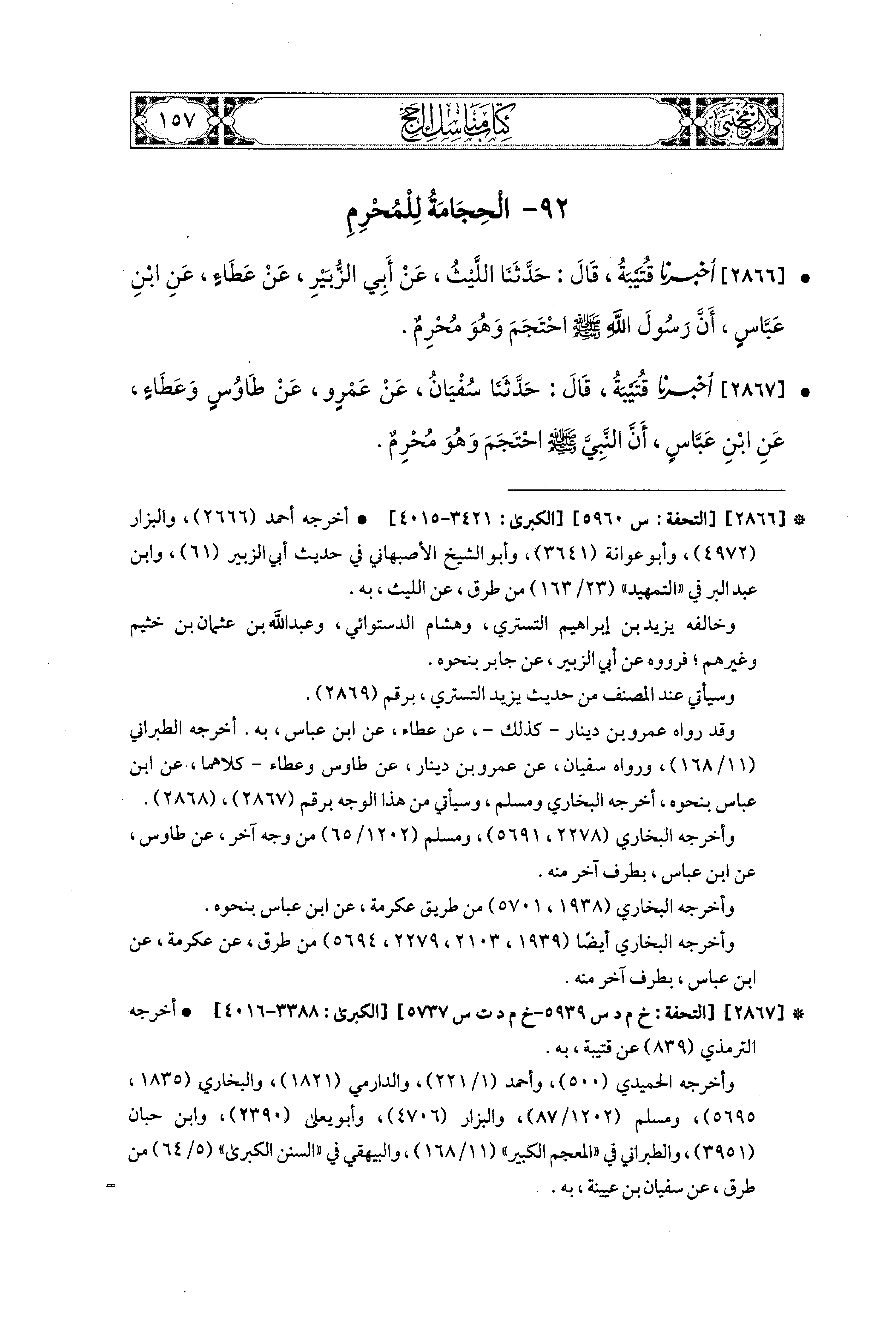 2867 - أَخبَرَنا قُتَيبَةُ، قال: حَدثنا سُفيَانُ، عَن عَمْرٍو، عَن طَاوُوسٍ، وَعَطَاءٌ، عَنِ ابنِ عَبَّاسٍ أَنَّ النَّبيَّ صَلى الله عَليه وسَلم احْتَجَمَ، وَهُوَ مُحْرِمٌ.