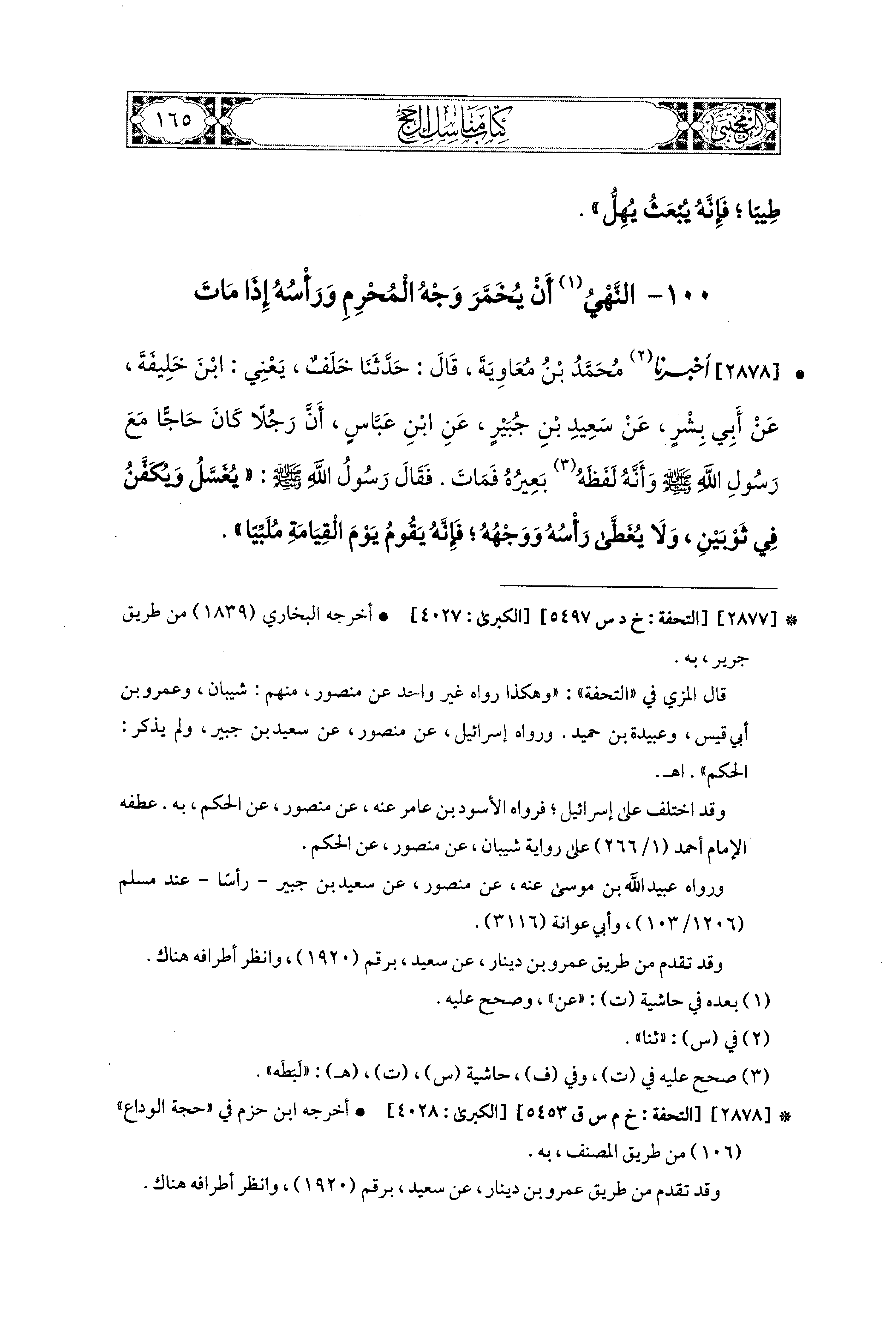 2878 - أَخبَرَنا مُحَمد بْنُ مُعَاوِيَةَ، قال: حَدثنا خَلَفٌ، يَعْني ابنَ خَلِيفَةَ، عَن أَبي بِشْرٍ، عَن سَعيدِ بْنِ جُبَيْرٍ، عَنِ ابنِ عَبَّاسٍ، أَنَّ رَجُلاً كَانَ حَاجًّا مَعَ رَسُولِ اللهِ صَلى الله عَليه وسَلم، وَأَنَّهُ لَفَظَهُ بَعِيرُهُ فَمَاتَ، فَقَالَ رَسُولُ اللهِ صَلى الله عَليه وسَلم: يُغَسَّلُ، وَيُكَفَّنُ فِي ثَوْبَيْنِ، وَلاَ يُغَطَّى رَأْسُهُ، وَوَجْهُهُ، فَإِنَّهُ يَقُومُ يَوْمَ القِيَامَةِ مُلَبِّيًا.