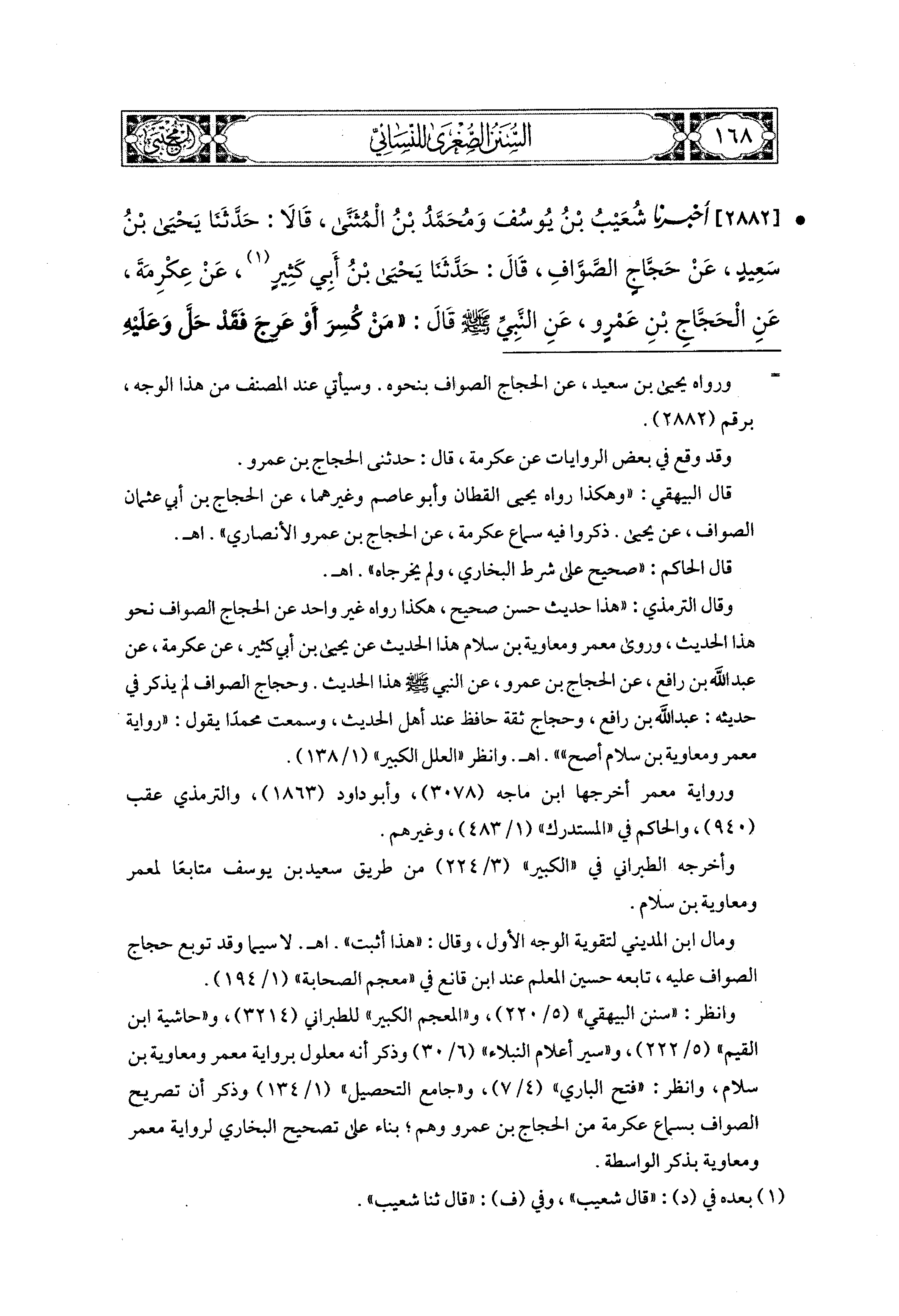 2882 - أَخبَرَنا شُعَيبُ بْنُ يُوسُفَ، وَمُحَمدُ بْنُ المُثَنَّى، قَالاَ: حَدَّثَنَا يَحيَى بْنُ سَعيدٍ، عَن حَجَّاجٍ الصَّوَّافِ (1)، قال: حَدثنا يَحيَى بْنُ أَبي كَثِيرٍ، عَن عِكْرِمَةَ، عَنِ الحَجَّاجِ بْنِ عَمْرٍو، عَنِ النَّبيِّ صَلى الله عَليه وسَلم قَالَ: مَنْ كُسِرَ، أَوْ عَرِجَ فَقَدْ حَلَّ وَعَلَيهِ حَجَّةٌ أُخْرَى، فَسَأَلْتُ ابنَ عَبَّاسٍ، وَأَبَا هُرَيرَةَ، فَقَالاَ: صَدَقَ، وَقَالَ شُعَيبٌ، فِي حَدِيثِهِ: وَعَلَيهِ الحَجُّ مِنْ قَابِلٍ.