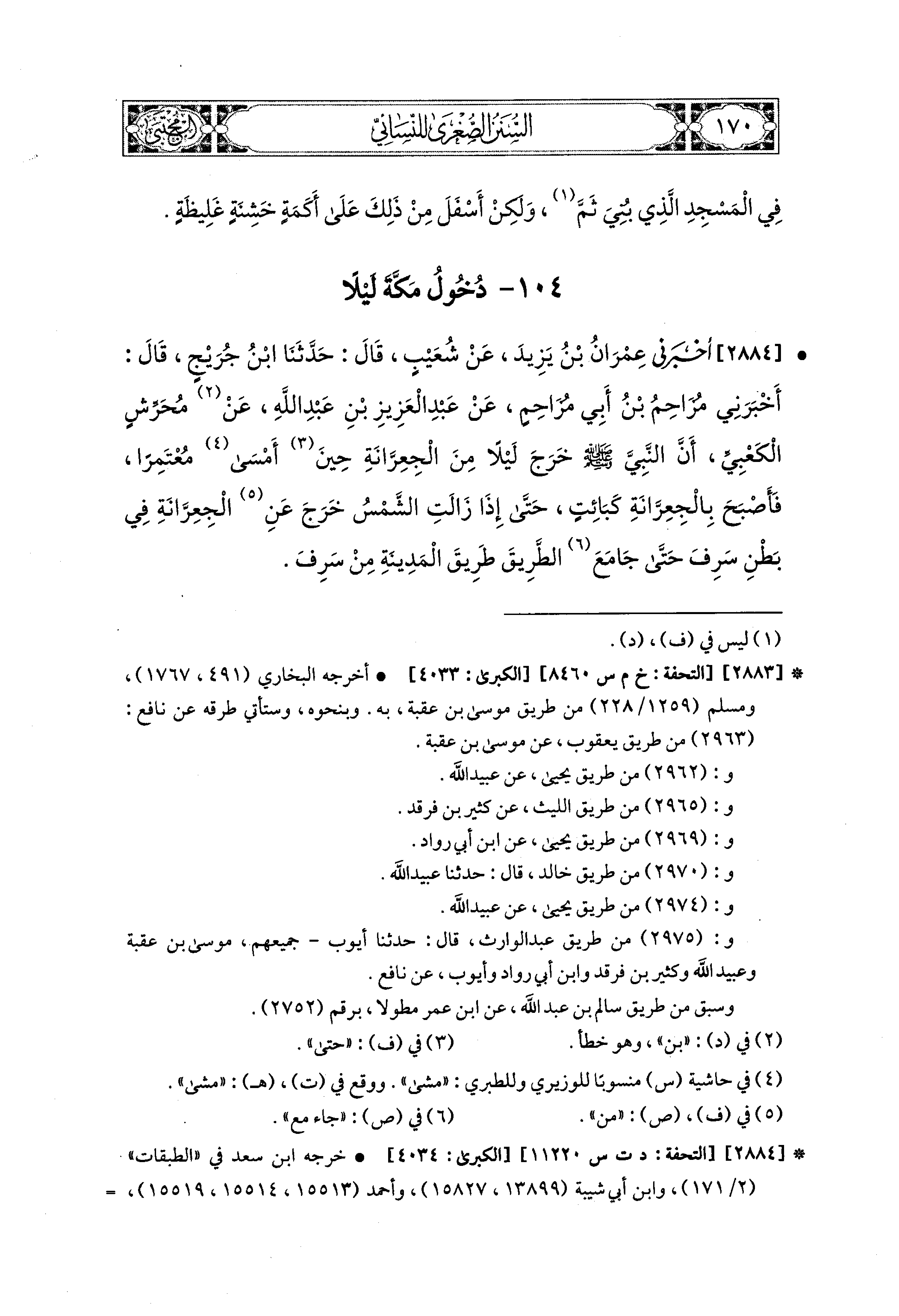 2884 - أَخبَرني عِمْرَانُ بْنُ يَزِيدَ، عَن شُعَيبٍ، قال: حَدثنا ابنُ جُرَيْجٍ، قَالَ: أَخبَرني مُزَاحِمُ بْنُ أَبي مُزَاحِمٍ، عَن عَبدِ العَزِيزِ بْنِ عَبدِ اللهِ، عَن مُحَرِّشٍ الكَعْبِيِّ أَنَّ النَّبيَّ صَلى الله عَليه وسَلم، خَرَجَ لَيْلاً مِنَ الجِعْرَانَةِ حِينَ أمسى مُعْتَمِرًا، فَأَصْبَحَ بِالجِعْرَانَةِ كَبَائِتٍ حَتَّى إِذَا زَالَتِ الشَّمْسُ، خَرَجَ عَنِ الجِعْرَانَةِ فِي بَطْنِ سَرِفَ، حَتَّى جَامَعَ الطَّرِيقَ طَرِيقَ المَدِينَةِ، مِنْ سَرِفَ.