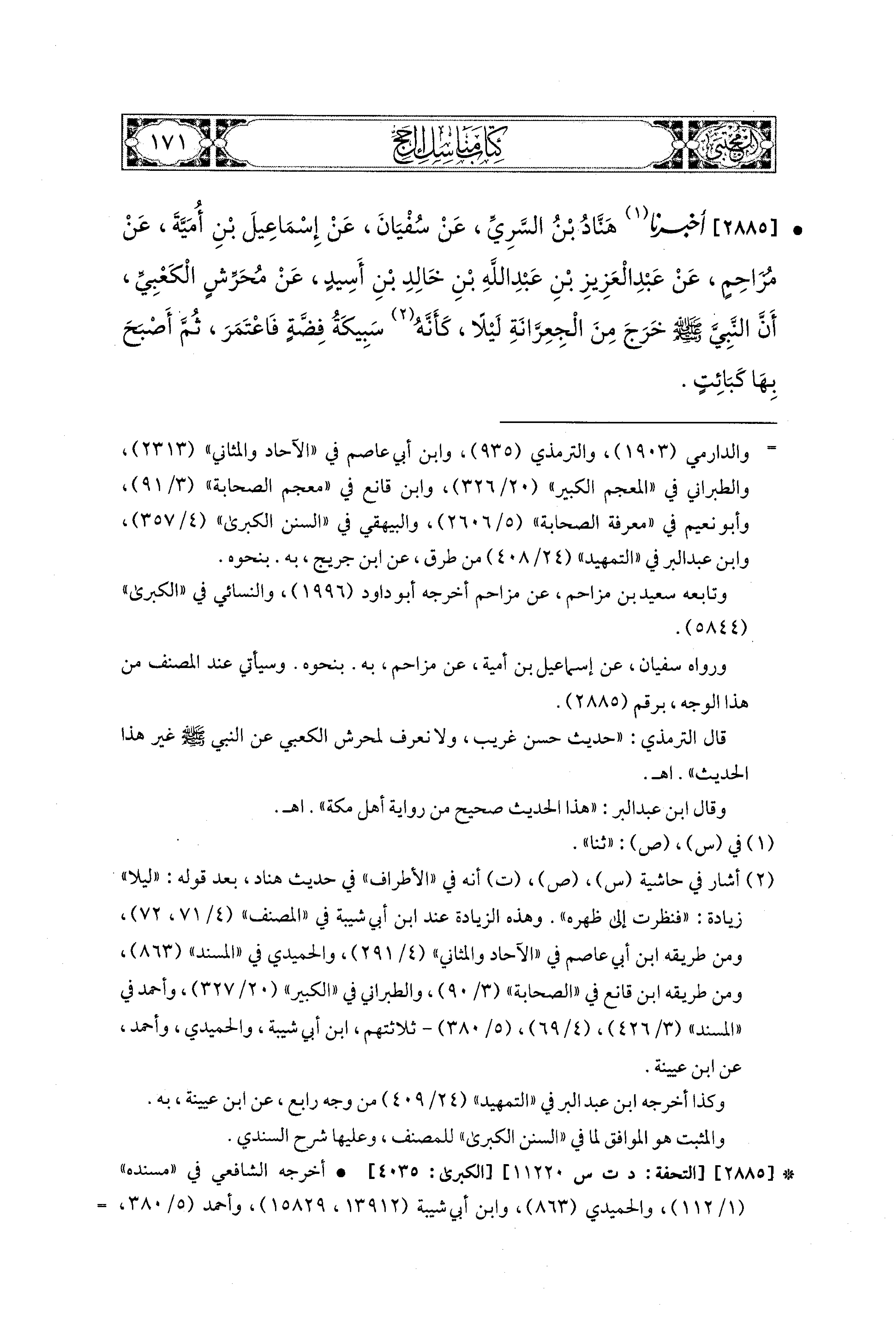 2885 - أَخبَرَنا هَنَّادُ بْنُ السَّرِيِّ، عَن سُفيَانَ، عَن إِسماعِيلَ بْنِ أُمَيَّةَ، عَن مُزَاحِمٍ، عَن عَبدِ العَزِيزِ بْنِ عَبدِ اللهِ بْنِ خَالِدِ بْنِ أُسَيْدٍ، عَن مُحَرِّشٍ الكَعْبِيِّ أَنَّ النَّبيَّ صَلى الله عَليه وسَلم خَرَجَ مِنَ الجِعْرَانَةِ لَيْلاً، كَأَنَّهُ سَبِيكَةُ فِضَّةٍ، فَاعْتَمَرَ، ثُمَّ أَصْبَحَ بِهَا كَبَائِتٍ.