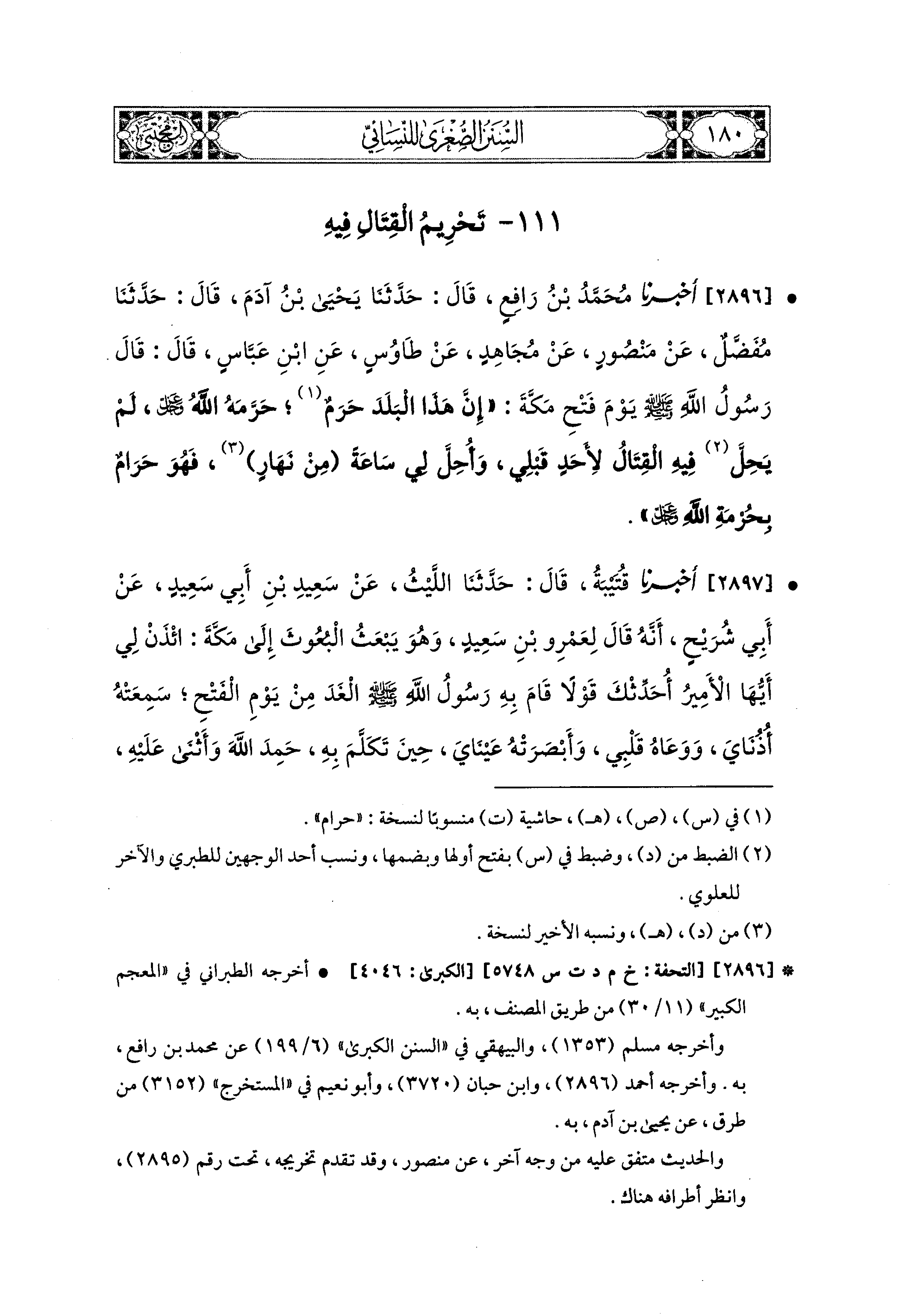 2896 - أَخبَرَنا مُحَمد بْنُ رَافِعٍ، قال: حَدثنا يَحيَى بْنُ آدَمَ، قال: حَدثنا مُفَضَّلٌ، عَن مَنْصُورٍ، عَن مُجَاهِدٍ، عَن طَاوُوسٍ، عَنِ ابنِ عَبَّاسٍ، قَالَ: قَالَ رَسُولُ اللهِ صَلى الله عَليه وسَلم يَوْمَ فَتْحِ مَكَّةَ: إِنَّ هَذَا البَلَدَ حَرَمٌ، حَرَّمَهُ اللهُ عَزَّ وَجَلَّ، لَمْ يَحِلَّ فِيهِ القِتَالُ لأَحَدٍ قَبْلِي، وَأُحِلَّ لِي سَاعَةً مِنْ نَهَارٍ، فَهُوَ حَرَامٌ بِحُرْمَةِ اللهِ عَزَّ وَجَلَّ.