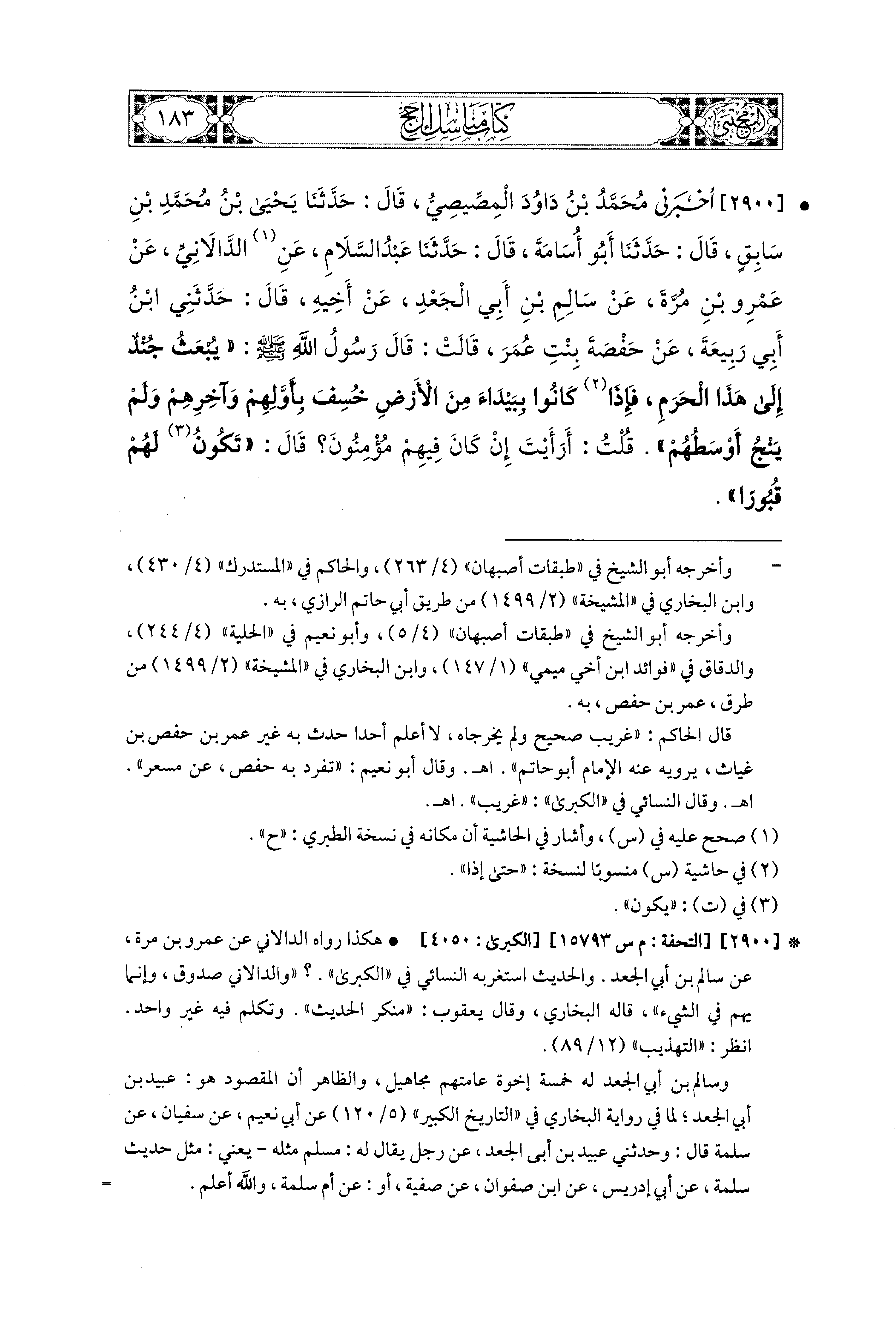 2900 - أَخبَرني مُحَمدُ بْنُ دَاوُدَ المِصِّيصِيُّ، قال: حَدثنا يَحيَى بْنُ مُحَمدِ بْنِ سَابِقٍ، قال: حَدثنا أَبو أُسَامَةَ، قال: حَدثنا عَبدُ السَّلاَمِ، عَنِ الدَّالاَنيِّ، عَن عَمْرِو بْنِ مُرَّةَ، عَن سَالِمِ بْنِ أَبي الجَعْدِ، عَن أَخِيهِ، قَالَ: حَدَّثَني ابنُ أَبي رَبِيعَةَ، عَن حَفْصَةَ بِنْتِ عُمَرَ، قَالَتْ: قَالَ رَسُولُ اللهِ صَلى الله عَليه وسَلم: يُبْعَثُ جُنْدٌ إِلَى هَذَا الحَرَمِ فَإِذَا كَانُوا بِبَيْدَاءَ مِنَ الأَرضِ، خُسِفَ بِأَوَّلِهِمْ وَآخِرِهِمْ، وَلَمْ يَنْجُ أَوْسَطُهُمْ، قُلْتُ: أَرَأَيْتَ إِنْ كَانَ فِيهِمْ مُؤْمِنُونَ، قَالَ: تَكُونُ لَهُمْ قُبُورًا.