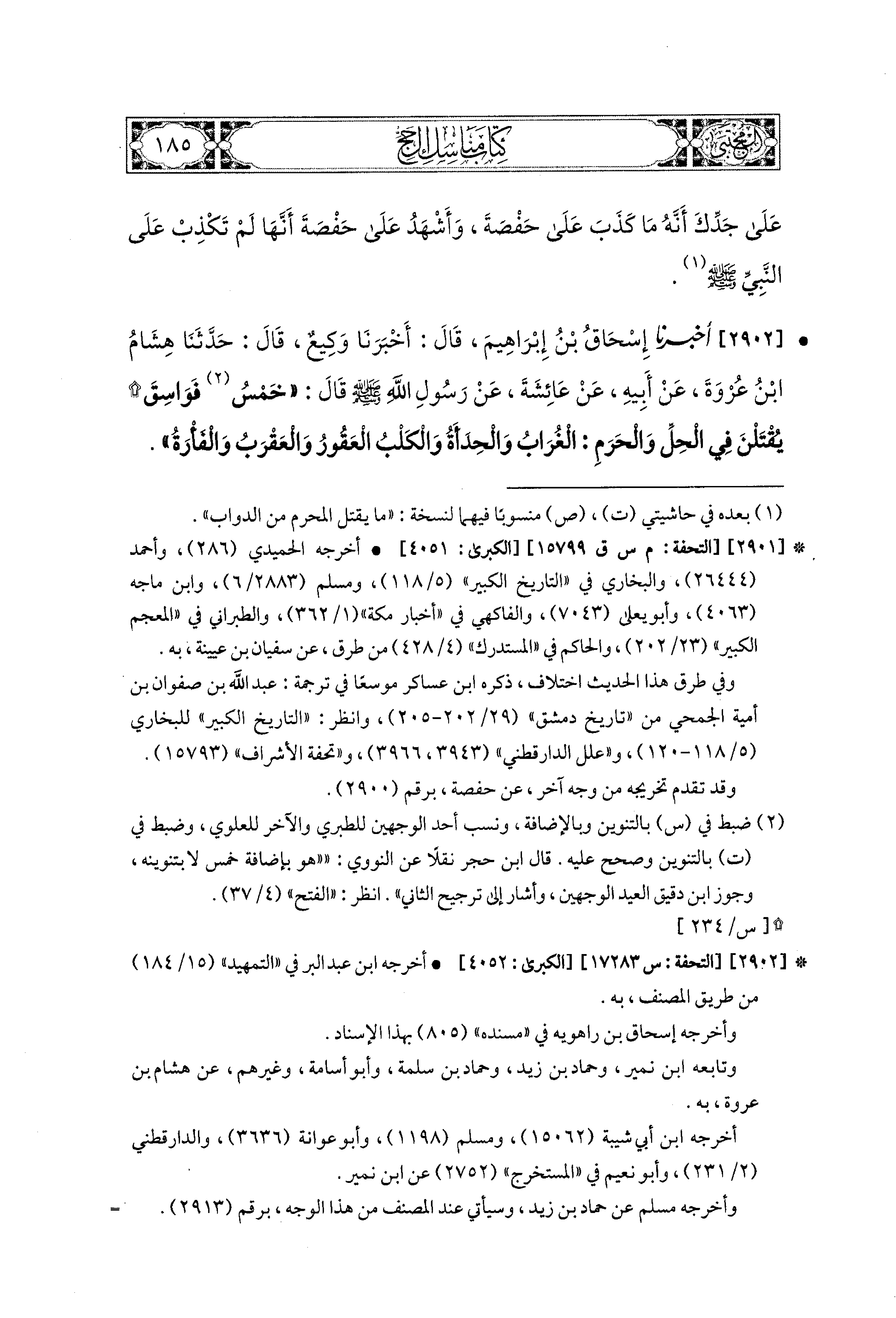 2902 - أَخبَرَنا إِسحَاقُ بْنُ إِبراهِيمَ، قَالَ: أَخبَرنا وَكِيعٌ، قال: حَدثنا هِشَامُ بْنُ عُرْوَةَ، عَن أَبيهِ، عَن عَائِشَةَ، عَن رَسُولِ اللهِ صَلى الله عَليه وسَلم قَالَ: خَمْسُ فَوَاسِقَ يُقْتَلْنَ فِي الحِلِّ وَالحَرَمِ: الغُرَابُ، وَالحِدَأَةُ، وَالكَلْبُ العَقُورُ، وَالعَقْرَبُ، وَالفَأْرَةُ.