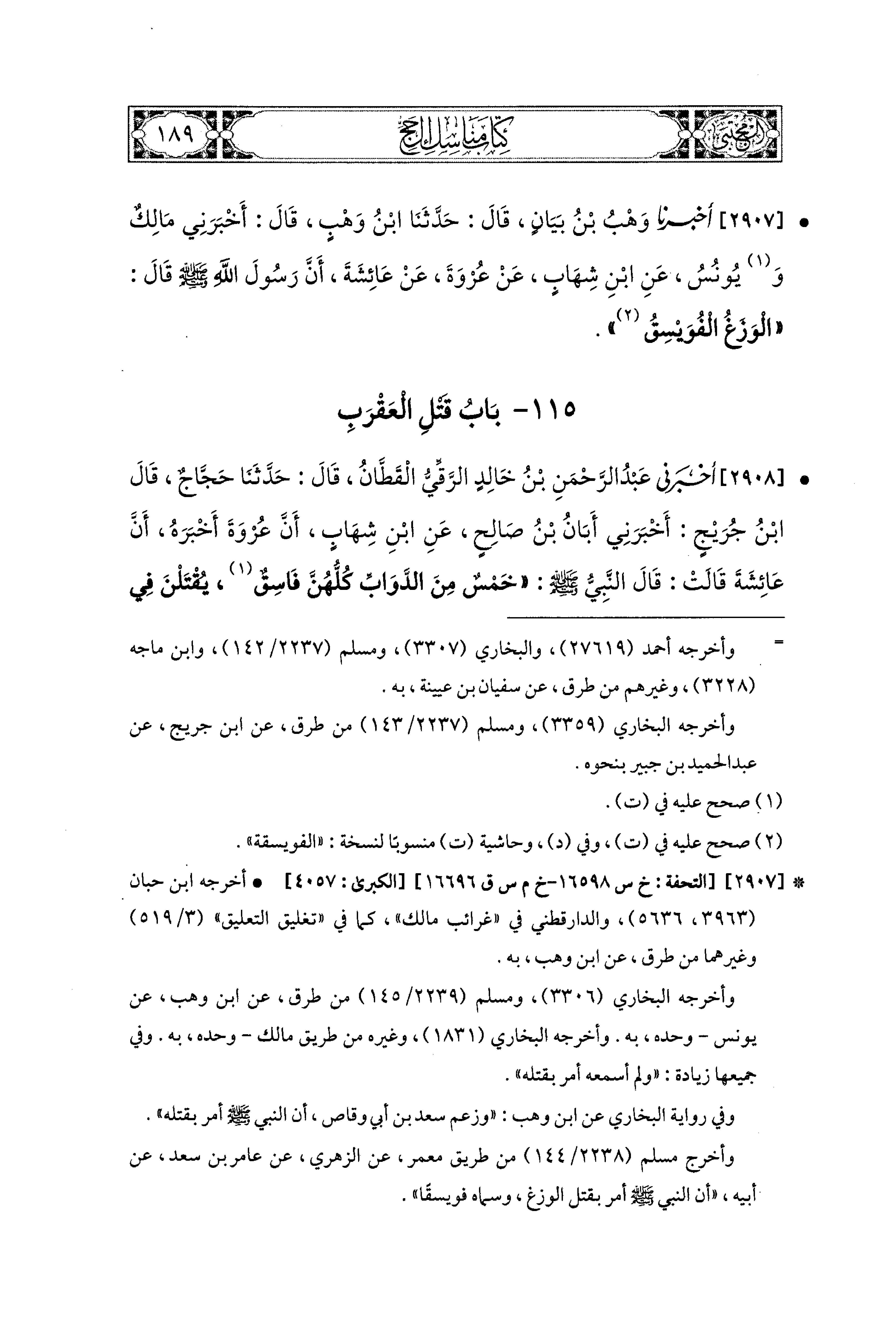 2908 - أَخبَرني عَبدُ الرَّحمَنِ بْنُ خَالِدٍ الرَّقِّيُّ القَطَّانُ، قال: حَدثنا حَجَّاجٌ، قَالَ ابنُ جُرَيْجٍ: أَخبَرني أَبَانُ بْنُ صَالِحٍ، عَنِ ابنِ شِهَابٍ، أَنَّ عُرْوَةَ أَخْبَرَهُ، أَنَّ عَائِشَةَ قَالَتْ: قَالَ النَّبيُّ صَلى الله عَليه وسَلم: خَمْسٌ مِنَ الدَّوَابِّ كُلُّهُنَّ فَاسِقٌ يُقْتَلْنَ فِي الحِلِّ وَالحَرَمِ: الكَلْبُ العَقُورُ، وَالغُرَابُ، وَالحِدَأَةُ، وَالعَقْرَبُ، وَالفَأْرَةُ.