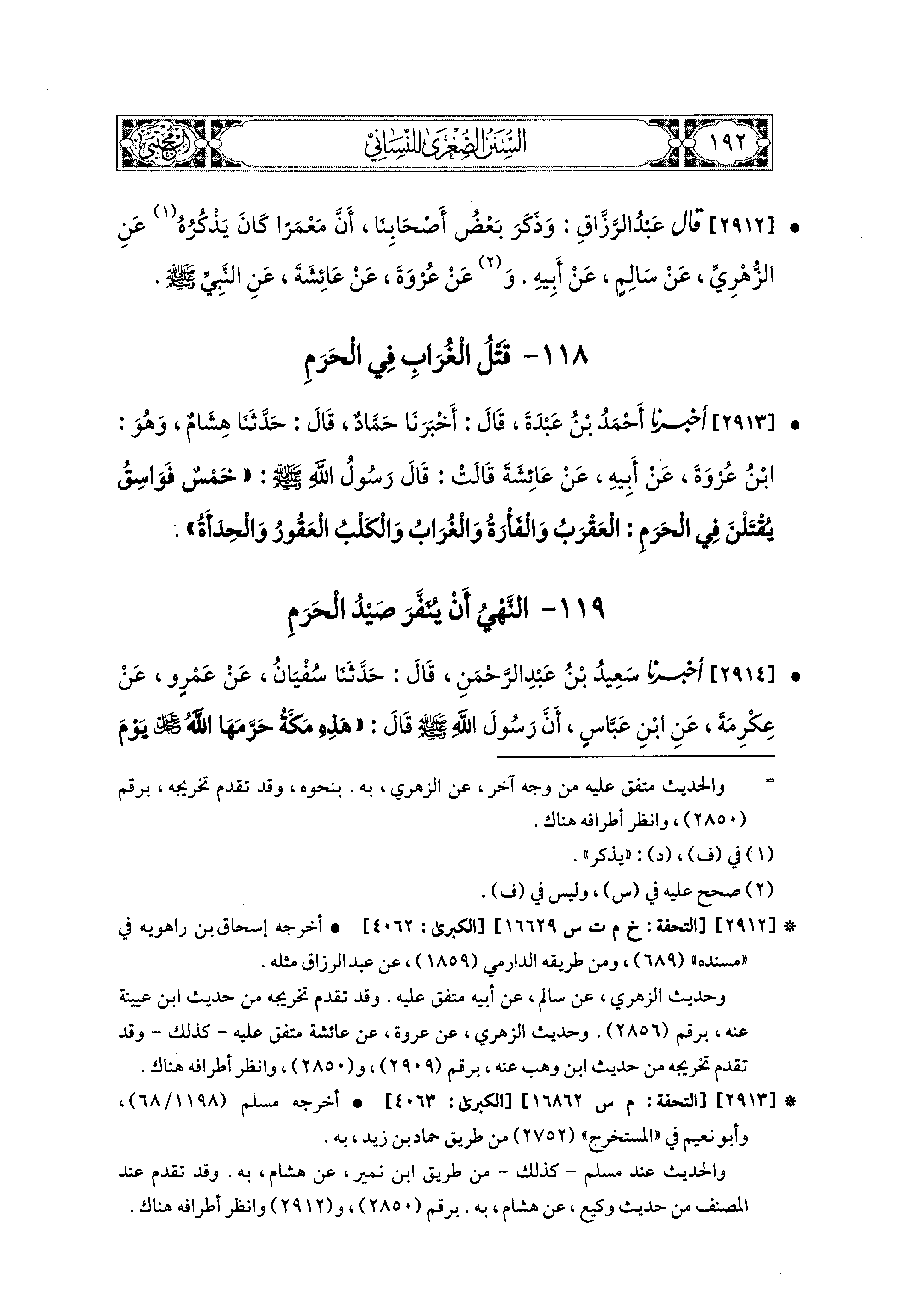2913 - أَخبَرَنا أَحْمَدُ بْنُ عَبدَةَ، قَالَ: أَخبَرنا حَمَّادٌ، قال: حَدثنا هِشَامٌ، وَهُوَ ابنُ عُرْوَةَ، عَن أَبيهِ، عَن عَائِشَةَ، قَالَتْ: قَالَ رَسُولُ اللهِ صَلى الله عَليه وسَلم: خَمْسُ فَوَاسِقَ يُقْتَلْنَ فِي الحَرَمِ: العَقْرَبُ، وَالفَأْرَةُ، وَالغُرَابُ، وَالكَلْبُ العَقُورُ، وَالحِدَأَةُ.