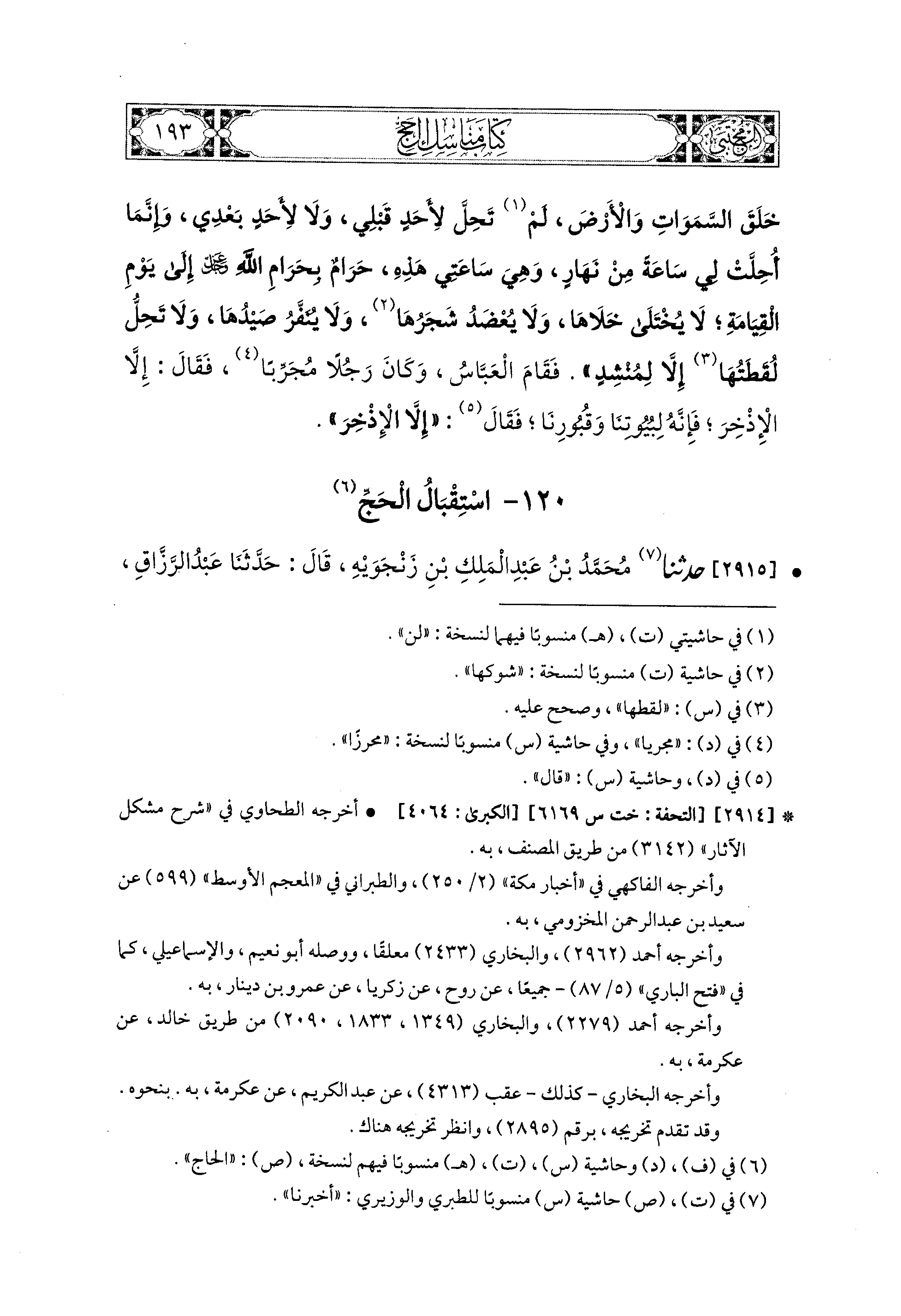 2915 - حَدثنا مُحَمد بْنُ عَبدِ المَلِكِ بْنِ زَنْجُوَيْهِ (1)، قال: حَدثنا عَبدُ الرَّزَّاقِ، قال: حَدثنا جَعْفَرُ بْنُ سُلَيمَانَ، عَن ثَابِتٍ، عَن أَنَسٍ، قَالَ: دَخَلَ النَّبيُّ صَلى الله عَليه وسَلم مَكَّةَ فِي عُمْرَةِ القَضَاءِ وَابنُ رَوَاحَةَ بَيْنَ يَدَيْهِ يَقُولُ: