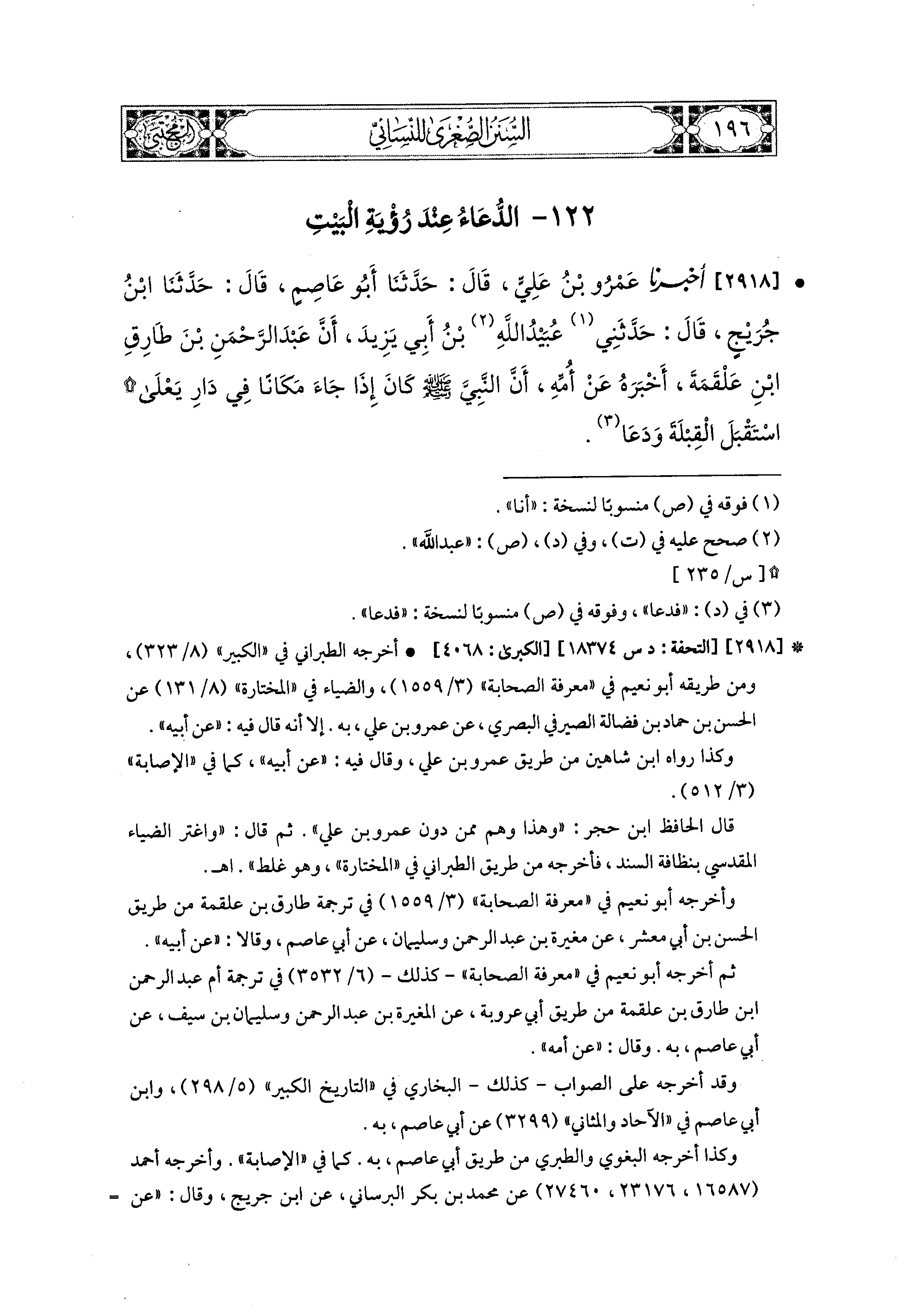 2918 - أَخبَرَنا عَمْرُو بْنُ عَلِيٍّ، قال: حَدثنا أَبو عَاصِمٍ، قال: حَدثنا ابنُ جُرَيْجٍ، قَالَ: حَدَّثَني عُبَيدُ اللهِ بْنُ أَبي يَزِيدَ، أَنَّ عَبدَ الرَّحمَنِ بْنَ طَارِقِ بْنِ عَلْقَمَةَ، أَخْبَرَهُ عَن أُمِّهِ أَنَّ النَّبيَّ صَلى الله عَليه وسَلم، كَانَ إِذَا جَاءَ مَكَانًا فِي دَارِ يَعْلَى، اسْتَقْبَلَ القِبْلَةَ وَدَعَا.