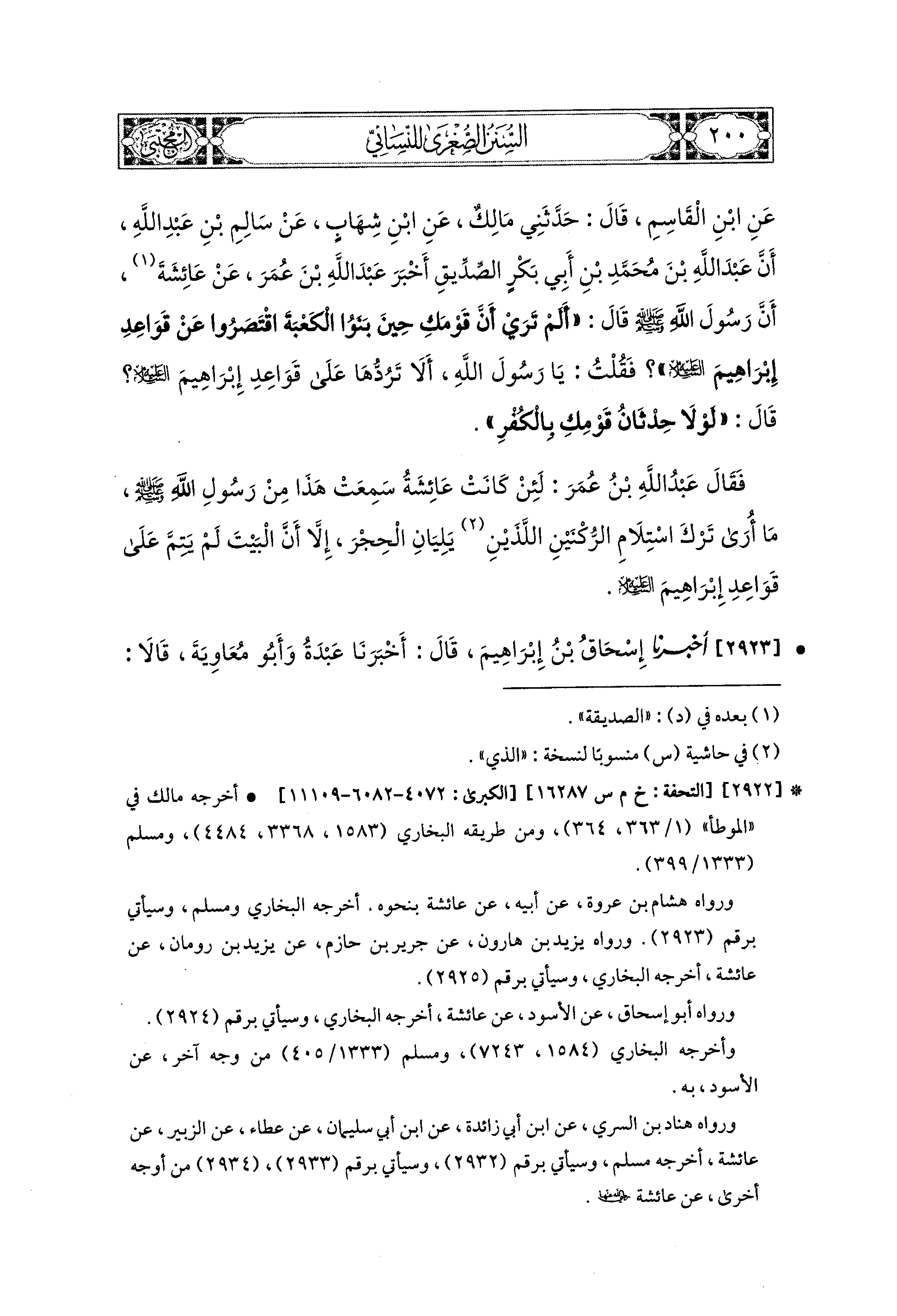 2923 - أَخبَرَنا إِسحَاقُ بْنُ إِبراهِيمَ، قَالَ: أَخبَرنا عَبدَةُ، وَأَبو مُعَاوِيَةَ قَالاَ: حَدَّثَنَا هِشَامُ بْنُ عُرْوَةَ، عَن أَبيهِ، عَن عَائِشَةَ، قَالَتْ: قَالَ رَسُولُ اللهِ صَلى الله عَليه وسَلم: لَوْلاَ حَدَاثَةُ عَهْدِ قَوْمِكِ بِالكُفْرِ، لَنَقَضْتُ البَيْتَ فَبَنَيْتُهُ عَلَى أَسَاسِ إِبراهِيمَ عَلَيهِ السَّلاَمُ، وَجَعَلْتُ لَهُ خَلْفًا فَإِنَّ قُرَيْشًا لَمَّا بَنَتِ البَيْتَ اسْتَقْصَرَتْ.