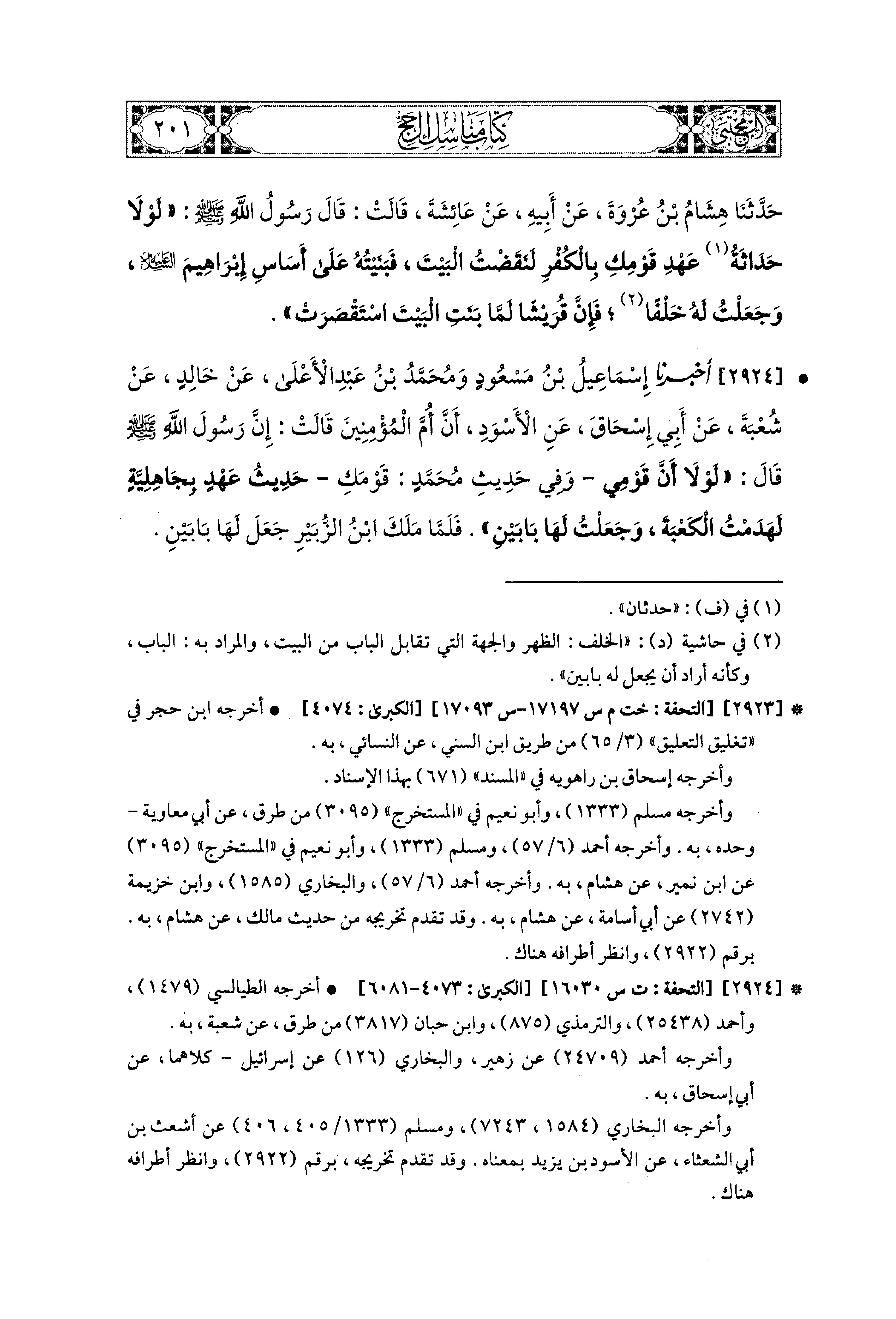 2924 - أَخبَرَنا إِسماعِيلُ بْنُ مَسْعُودٍ، وَمُحَمدُ بن عَبدِ الأَعلَى، عَن خَالِدٍ، عَن شُعبَةَ، عَن أَبي إِسحَاقَ، عَنِ الأَسْوَدِ، أَنَّ أُمَّ المُؤْمِنينَ، قَالَتْ: إِنَّ رَسُولَ اللهِ صَلى الله عَليه وسَلم قَالَ: لَوْلاَ أَنَّ قَوْمي، وَفِي حَدِيثِ مُحَمدٍ قَوْمَكِ، حَدِيثُ عَهْدٍ بِجَاهِلِيَّةٍ لَهَدَمْتُ الكَعْبَةَ، وَجَعَلْتُ لَهَا بَابَيْنِ فَلَمَّا مَلَكَ ابنُ الزُّبَيْرِ، جَعَلَ لَهَا بَابَيْنِ.