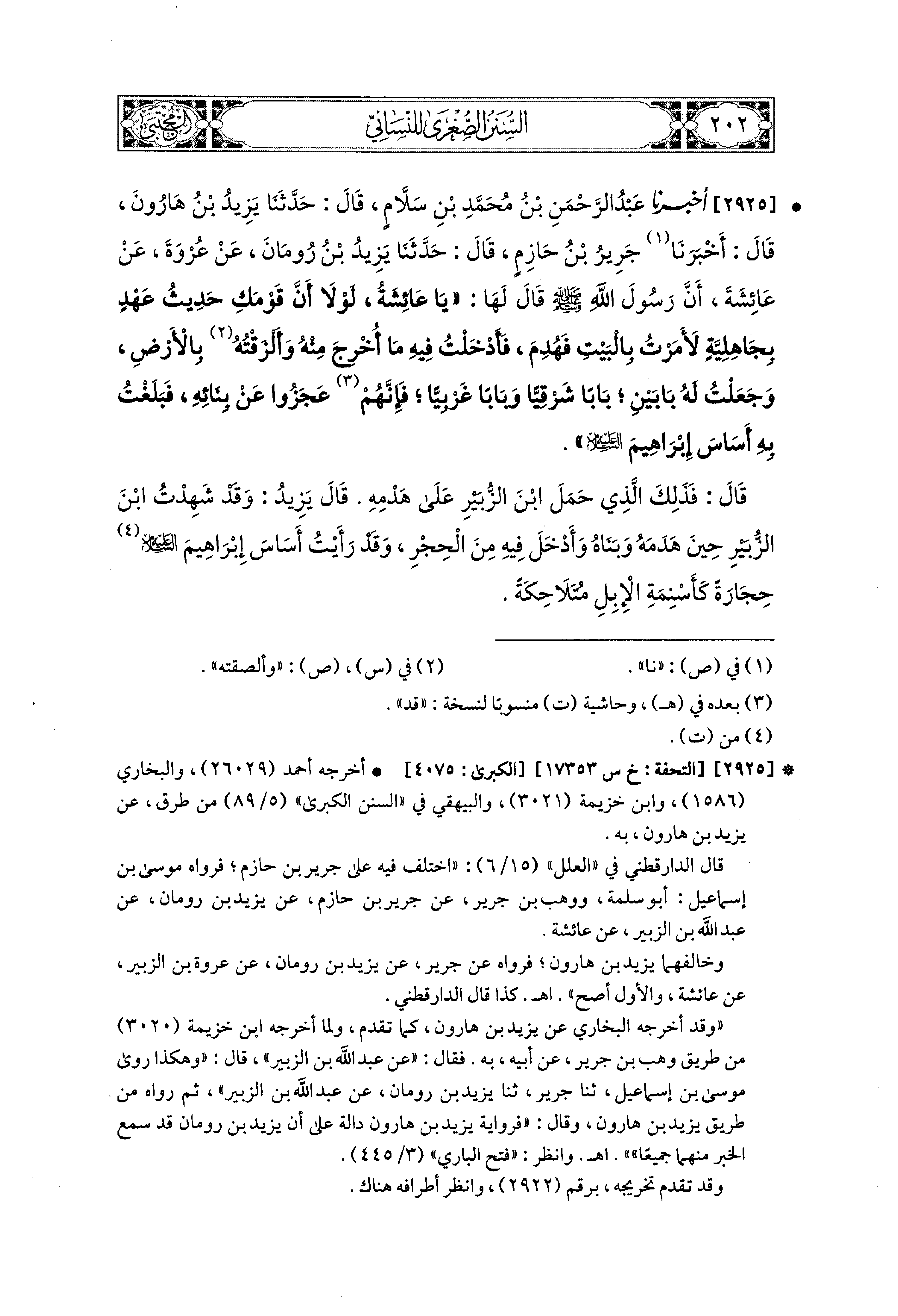 2925 - أَخبَرَنا عَبدُ الرَّحمَنِ بْنُ مُحَمدِ بْنِ سَلاَّمٍ، قال: حَدثنا يَزِيدُ بْنُ هَارُونَ، قَالَ: أَخبَرنا جَرِيرُ بْنُ حَازِمٍ، قال: حَدثنا يَزِيدُ بْنُ رُومَانَ، عَن عُرْوَةَ، عَن عَائِشَةَ، أَنَّ رَسُولَ اللهِ صَلى الله عَليه وسَلم قَالَ لَهَا: يَا عَائِشَةُ، لَوْلاَ أَنَّ قَوْمَكِ حَدِيثُ عَهْدٍ بِجَاهِلِيَّةٍ، لأَمَرْتُ بِالبَيْتِ، فَهُدِمَ فَأَدْخَلْتُ فِيهِ مَا أُخْرِجَ مِنْهُ، وَأَلْزَقْتُهُ بِالأَرضِ، وَجَعَلْتُ لَهُ بَابَيْنِ: بَابًا شَرْقِيًّا، وَبَابًا غَرْبِيًّا، فَإِنَّهُمْ عَجَزُوا عَن بِنَائِهِ، فَبَلَغْتُ بِهِ أَسَاسَ إِبراهِيمَ عَلَيهِ السَّلاَمُ، قَالَ: فَذَلِكَ الَّذِي حَمَلَ ابنَ الزُّبَيْرِ عَلَى هَدْمِهِ، قَالَ يَزِيدُ: وَقَدْ شَهِدْتُ ابنَ الزُّبَيْرِ حِينَ هَدَمَهُ وَبَنَاهُ، وَأَدْخَلَ فِيهِ مِنَ الحِجْرِ وَقَدْ رَأَيْتُ أَسَاسَ إِبراهِيمَ عَلَيهِ السَّلاَمُ حِجَارَةً كَأَسْنِمَةِ الإِبِلِ مُتَلاَحِكَةٌ.