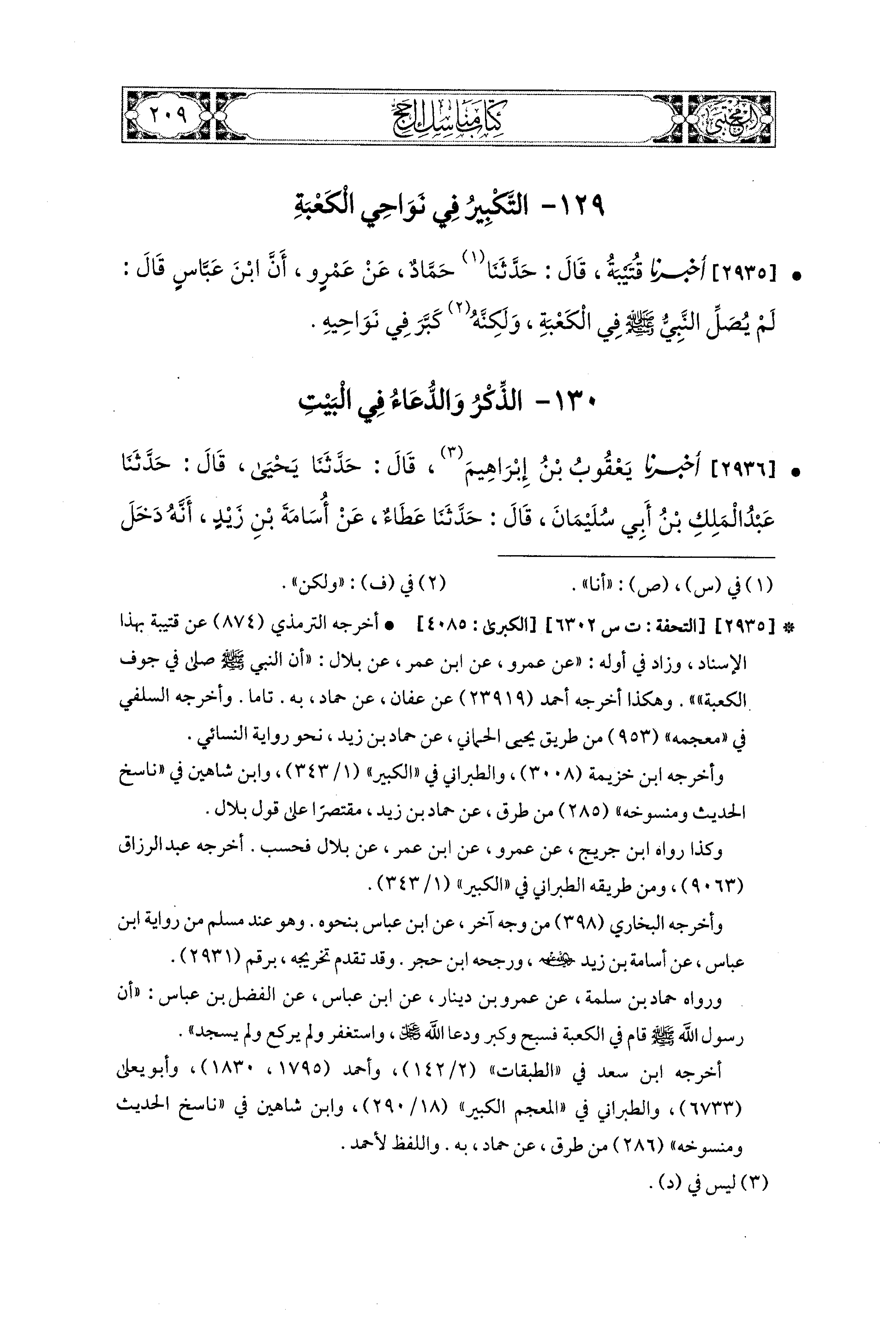 2935 - أَخبَرَنا قُتَيبَةُ، قال: حَدثنا حَمَّادٌ، عَن عَمْرٍو، أَنَّ ابنَ عَبَّاسٍ، قَالَ: لَمْ يُصَلِّ النَّبيُّ صَلى الله عَليه وسَلم فِي الكَعْبَةِ، وَلَكِنَّهُ كَبَّرَ فِي نَوَاحِيهَا (1).