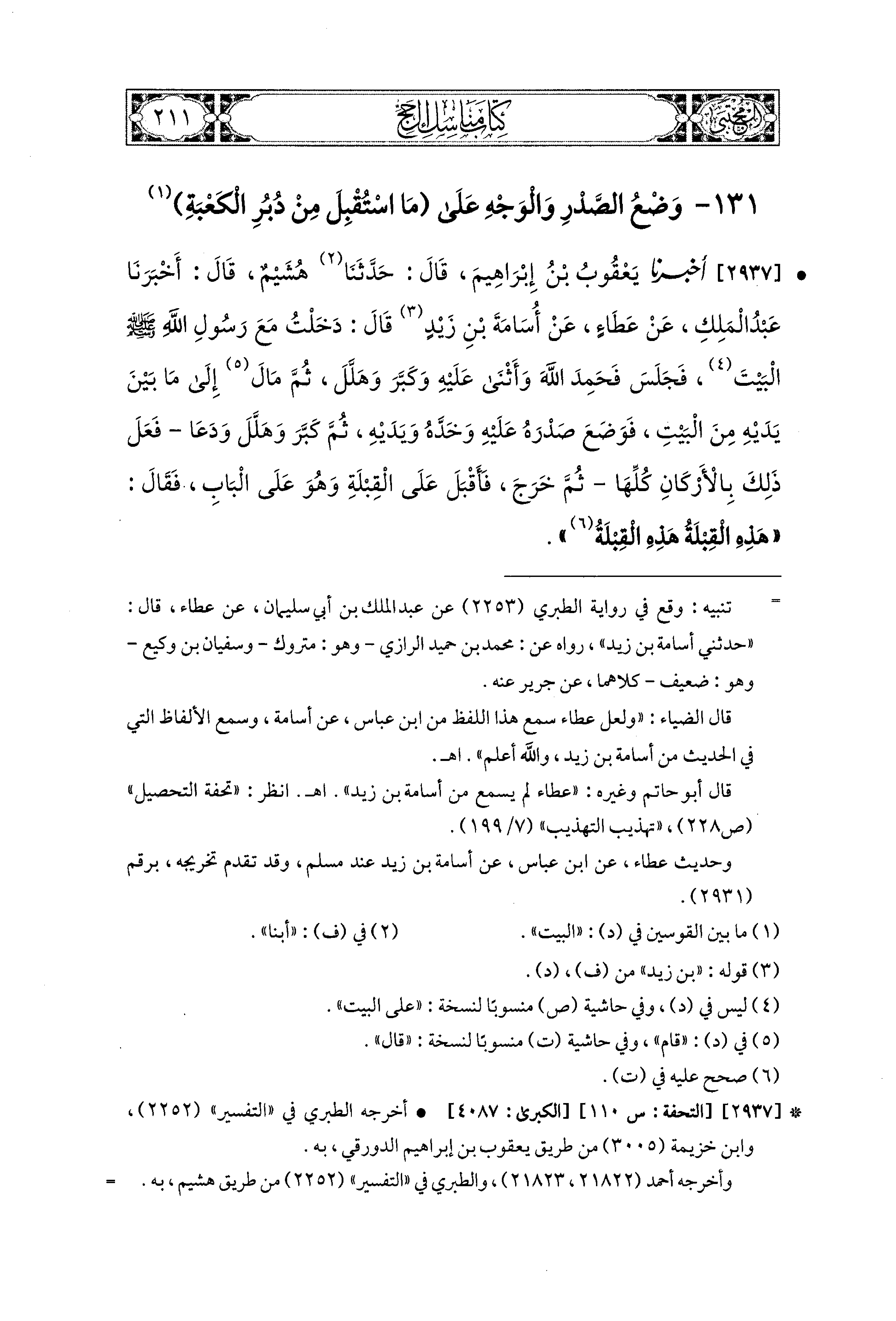 131 - وَضْعُ الصَّدْرِ، وَالوَجْهِ عَلَى مَا اسْتُقْبِلَ مِنْ دُبُرِ الكَعْبَةِ.