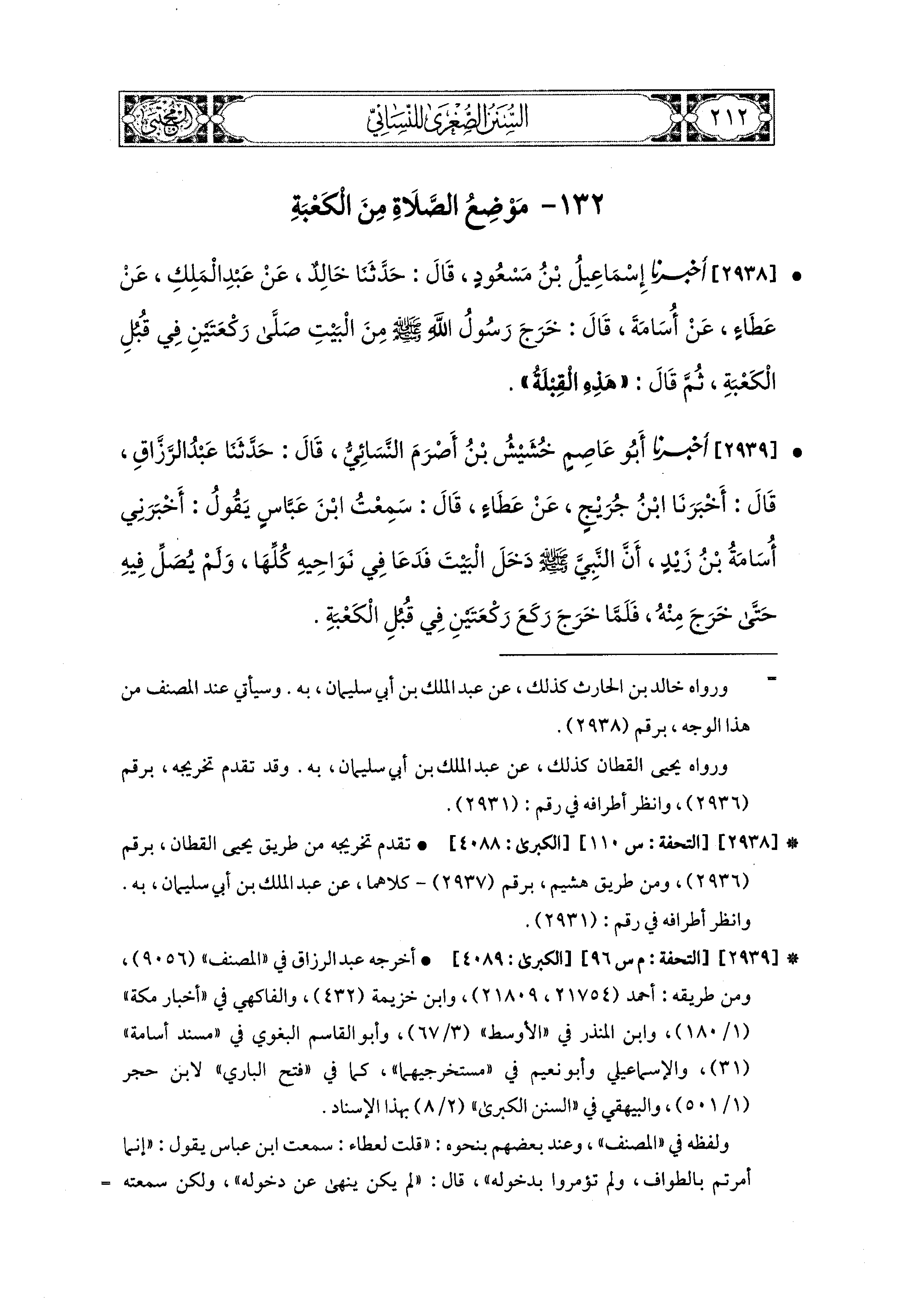 2938 - أَخبَرَنا إِسماعِيلُ بْنُ مَسْعُودٍ، قال: حَدثنا خَالِدٌ، عَن عَبدِ المَلِكِ، عَن عَطَاءٍ، عَن أُسَامَةَ، قَالَ: خَرَجَ رَسُولُ اللهِ صَلى الله عَليه وسَلم مِنَ البَيْتِ صَلَّى رَكْعَتَيْنِ فِي قُبُلِ الكَعْبَةِ، ثُمَّ قَالَ: هَذِهِ القِبْلَةُ.
