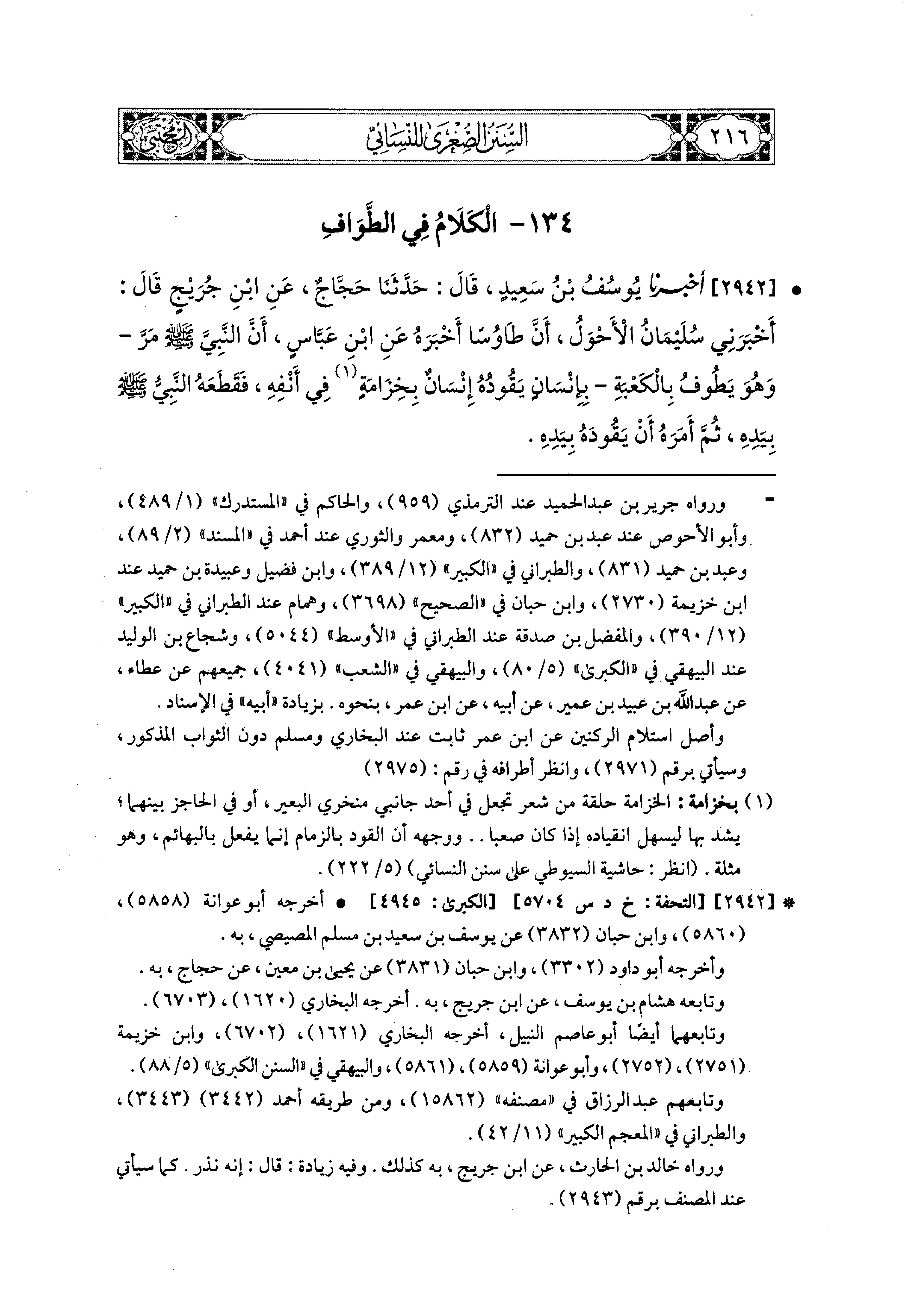 2942 - أَخبَرَنا يُوسُفُ بْنُ سَعيدٍ، قال: حَدثنا حَجَّاجٌ، عَنِ ابنِ جُرَيْجٍ، قَالَ: أَخبَرني سُلَيمَانُ الأَحْوَلُ، أَنَّ طَاوُوسًا، أَخْبَرَهُ، عَنِ ابنِ عَبَّاسٍ، أَنَّ النَّبيَّ صَلى الله عَليه وسَلم مَرَّ وَهُوَ يَطُوفُ بِالكَعْبَةِ بِإِنْسَانٍ، يَقُودُهُ إِنْسَانٌ بِخِزَامَةٍ فِي أَنْفِهِ، فَقَطَعَهُ النَّبيُّ صَلى الله عَليه وسَلم بِيَدِهِ، ثُمَّ أَمَرَهُ أَنْ يَقُودَهُ بِيَدِهِ.