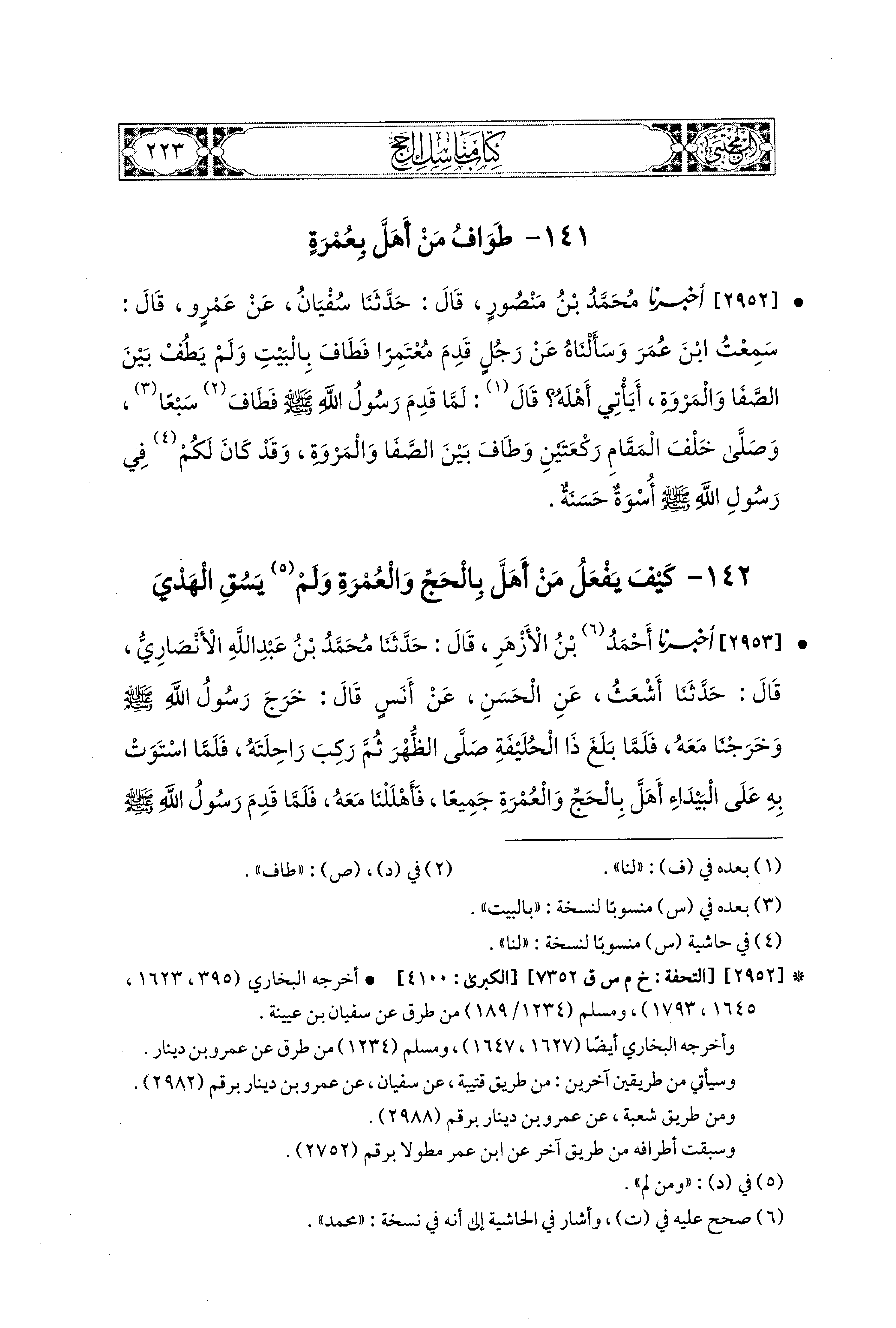 2952 - أَخبَرَنا مُحَمد بْنُ مَنْصُورٍ، قال: حَدثنا سُفيَانُ، عَن عَمْرٍو، قَالَ: سَمِعْتُ ابنَ عُمَرَ، وَسَأَلْنَاهُ عَن رَجُلٍ قَدِمَ مُعْتَمِرًا، فَطَافَ بِالبَيْتِ، وَلَمْ يَطُفْ بَيْنَ الصَّفَا، وَالمَرْوَةِ، أَيَأْتِي أَهْلَهُ؟ قَالَ: لَمَّا قَدِمَ رَسُولُ اللهِ صَلى الله عَليه وسَلم، فَطَافَ سَبْعًا، وَصَلَّى خَلْفَ المَقَامِ رَكْعَتَيْنِ، وَطَافَ بَيْنَ الصَّفَا وَالمَرْوَةِ، وَقَدْ كَانَ لَكُمْ فِي رَسُولِ اللهِ صَلى الله عَليه وسَلم أُسْوَةٌ حَسَنَةٌ.
