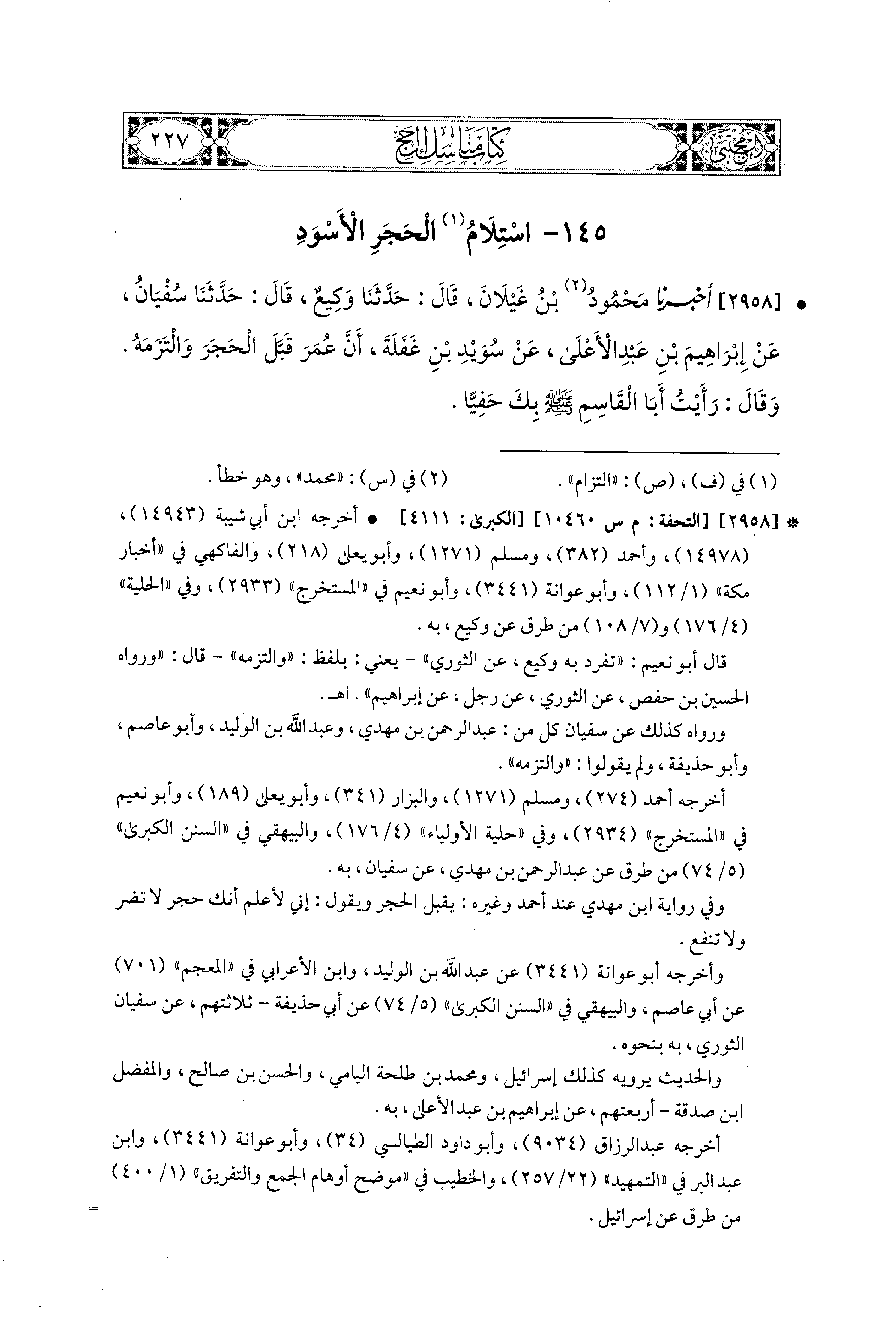 2958 - أَخبَرَنا مَحْمُودُ بْنُ غَيْلاَنَ، قال: حَدثنا وَكِيعٌ، قال: حَدثنا سُفيَانُ، عَن إِبراهِيمَ بْنِ عَبدِ الأَعْلَى، عَن سُوَيْدِ بْنِ غَفَلَةَ، أَنَّ عُمَرَ قَبَّلَ الحَجَرَ وَالتَزَمَهُ، وَقَالَ: رَأَيْتُ أَبَا القَاسِمِ صَلى الله عَليه وسَلم بِكَ حَفِيًّا.