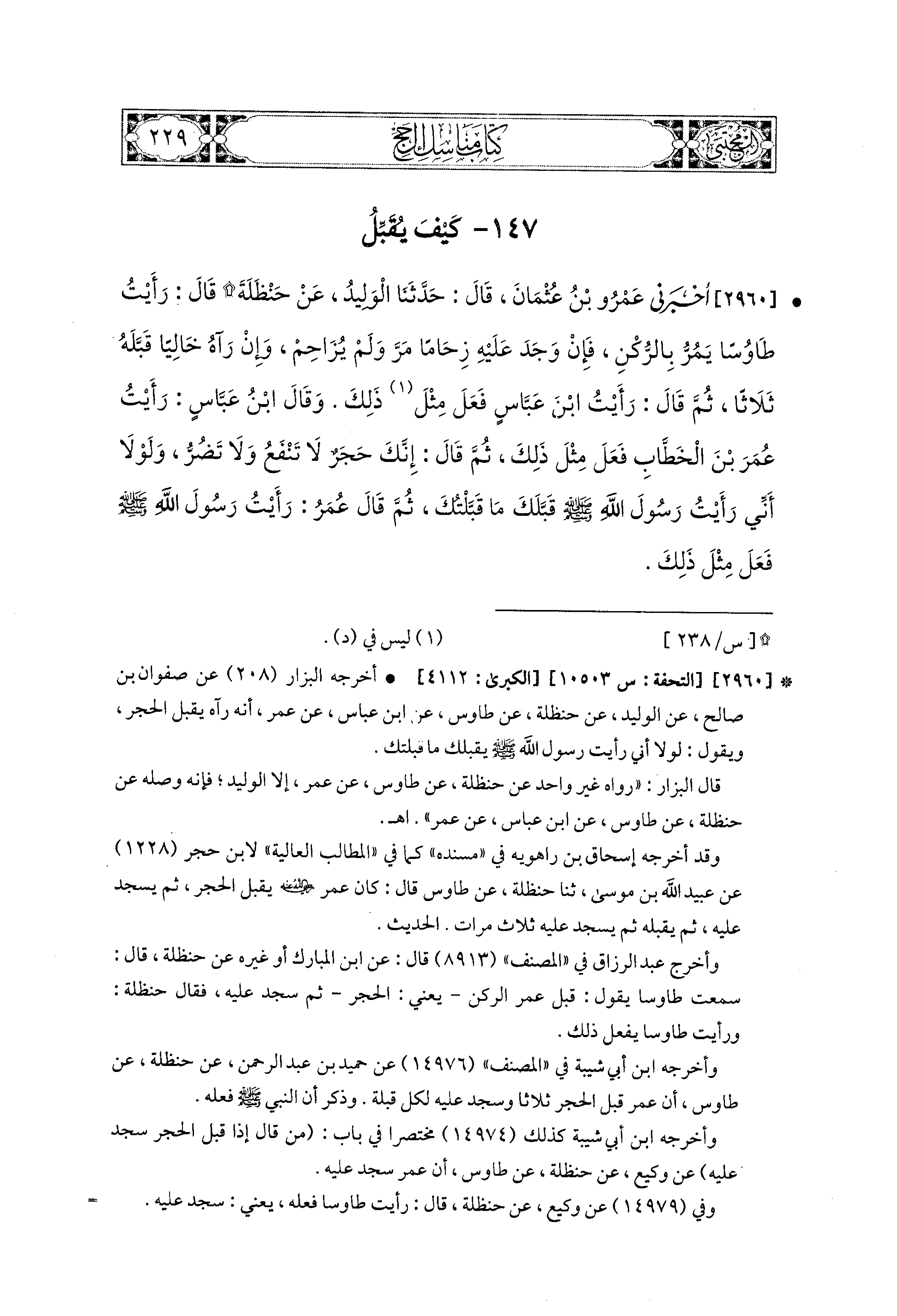 2960 - أَخْبَرَنِي عَمْرُو بْنُ عُثمَانَ، قال: حَدثنا الوَلِيدُ، عَن حَنْظَلَةَ، قَالَ: رَأَيْتُ طَاوُوسًا يَمُرُّ بِالرُّكْنِ، فَإِنْ وَجَدَ عَلَيهِ زِحَامًا مَرَّ، وَلَمْ يُزَاحِمْ، وَإِنْ رَآهُ خَالِيًا، قَبَّلَهُ ثَلاَثًا، ثُمَّ قَالَ: رَأَيْتُ ابنَ عَبَّاسٍ فَعَلَ مِثْلَ ذَلِكَ، وَقَالَ ابنُ عَبَّاسٍ: رَأَيْتُ عُمَرَ بْنَ الخَطَّابِ فَعَلَ مِثْلَ ذَلِكَ، ثُمَّ قَالَ: إِنَّكَ حَجَرٌ لاَ تَنْفَعُ وَلاَ تَضُرُّ، وَلَوْلاَ أَنِّي رَأَيْتُ رَسُولَ اللهِ صَلى الله عَليه وسَلم قَبَّلَكَ مَا قَبَّلْتُكَ، ثُمَّ قَالَ عُمَرُ: رَأَيْتُ رَسُولَ اللهِ صَلى الله عَليه وسَلم فَعَلَ مِثْلَ ذَلِكَ.