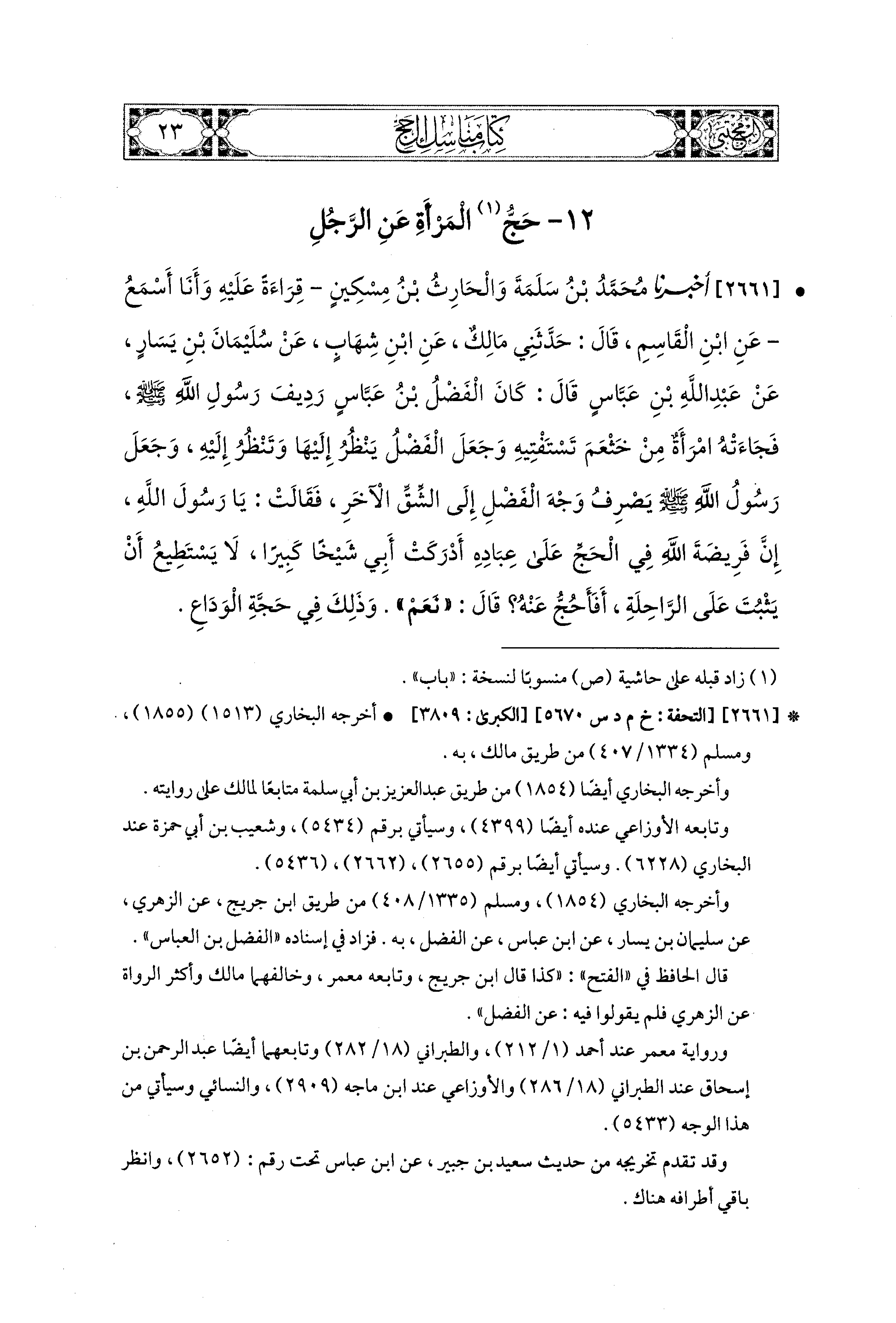 2661 - أَخبَرَنا مُحَمد بْنُ سَلَمَةَ، وَالحَارِثُ بْنُ مِسكينٍ، قِرَاءَةً عَلَيهِ وَأَنَا أَسْمَعُ، عَنِ ابنِ القَاسِمِ، قَالَ: حَدَّثَني مَالِكٌ، عَنِ ابنِ شِهَابٍ، عَن سُلَيمَانَ بْنِ يَسَارٍ، عَن عَبد اللهِ بن عَبَّاسٍ، قَالَ: كَانَ الفَضْلُ بْنُ عَبَّاسٍ رَدِيفَ رَسُولِ اللهِ صَلى الله عَليه وسَلم، فَجَاءَتْهُ امْرَأَةٌ مِنْ خَثْعَمَ تَسْتَفْتِيهِ، وَجَعَلَ الفَضْلُ يَنْظُرُ إِلَيْهَا، وَتَنْظُرُ إِلَيْهِ، وَجَعَلَ رَسُولُ اللهِ صَلى الله عَليه وسَلم، يَصْرِفُ وَجْهَ الفَضْلِ إِلَى الشِّقِّ الآخَرِ، فَقَالَتْ: يَا رَسُولَ اللهِ، إِنَّ فَرِيضَةَ اللهِ فِي الحَجِّ عَلَى عِبَادِهِ أَدْرَكَتْ أَبي شَيْخًا كَبِيرًا، لاَ يَسْتَطِيعُ أَنْ يَثْبُتَ عَلَى الرَّاحِلَةِ، أَفَأَحُجُّ عَنهُ؟ قَالَ: نَعَمْ، وَذَلِكَ فِي حَجَّةِ الوَدَاعِ.