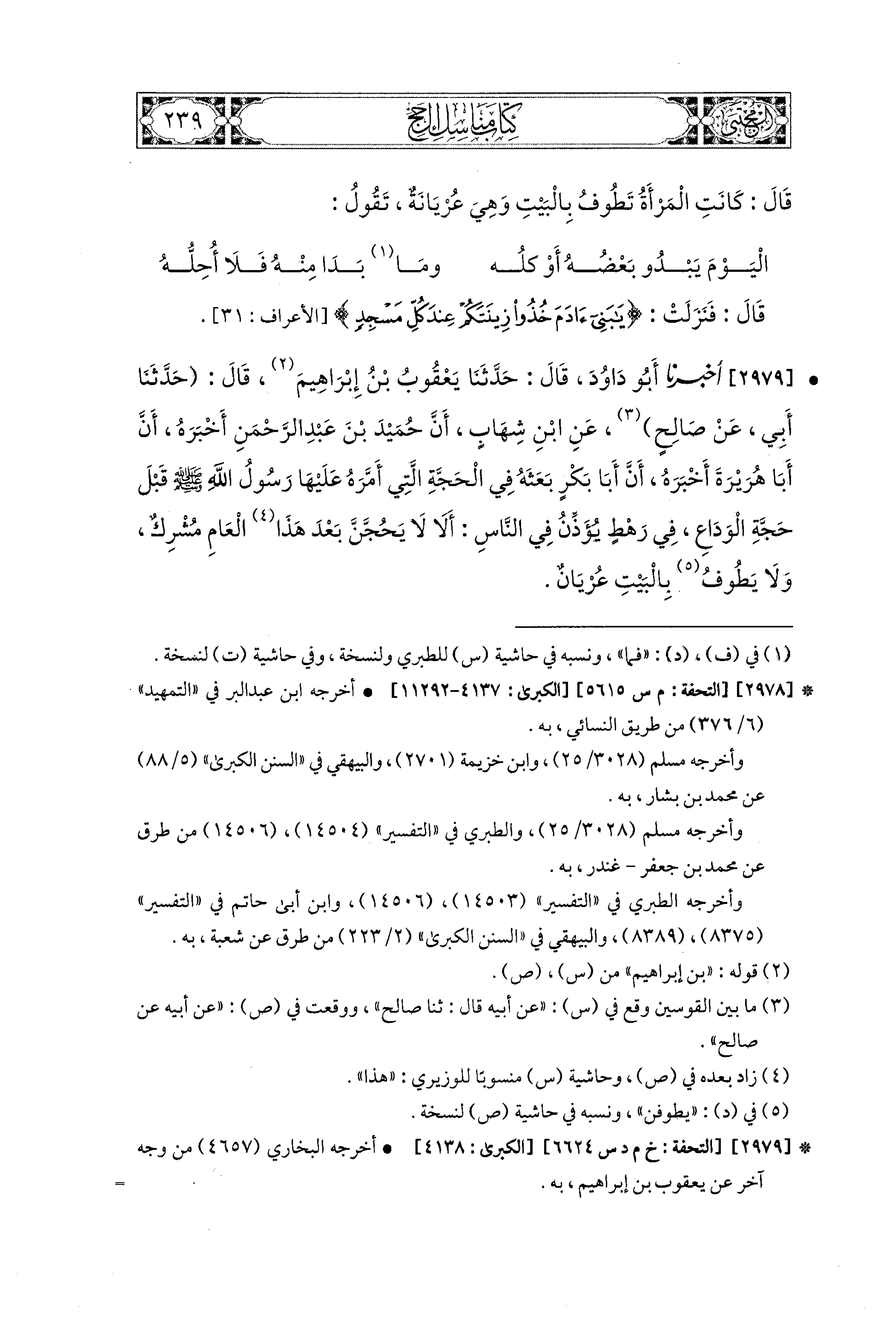 2979 - أَخبَرَنا أَبو دَاوُدَ، قال: حَدثنا يَعقُوبُ بن إبراهيم، قال: حَدثنا أَبي، عَن صَالِحٍ، عَنِ ابنِ شِهَابٍ، أَنَّ حُمَيدَ بْنَ عَبدِ الرَّحمَنِ أَخْبَرَهُ، أَنَّ أَبَا هُرَيرَةَ أَخْبَرَهُ، أَنَّ أَبَا بَكْرٍ بَعَثَهُ فِي الحَجَّةِ الَّتِي أَمَّرَهُ عَلَيهَا رَسُولُ اللهِ صَلى الله عَليه وسَلم، قَبْلَ حَجَّةِ الوَدَاعِ فِي رَهْطٍ يُؤَذِّنُ فِي النَّاسِ، أَلاَ لاَ يَحُجَّنَّ بَعْدَ هذا العَامِ مُشْرِكٌ، وَلاَ يَطُوفُ بِالبَيْتِ عُرْيَانٌ.
