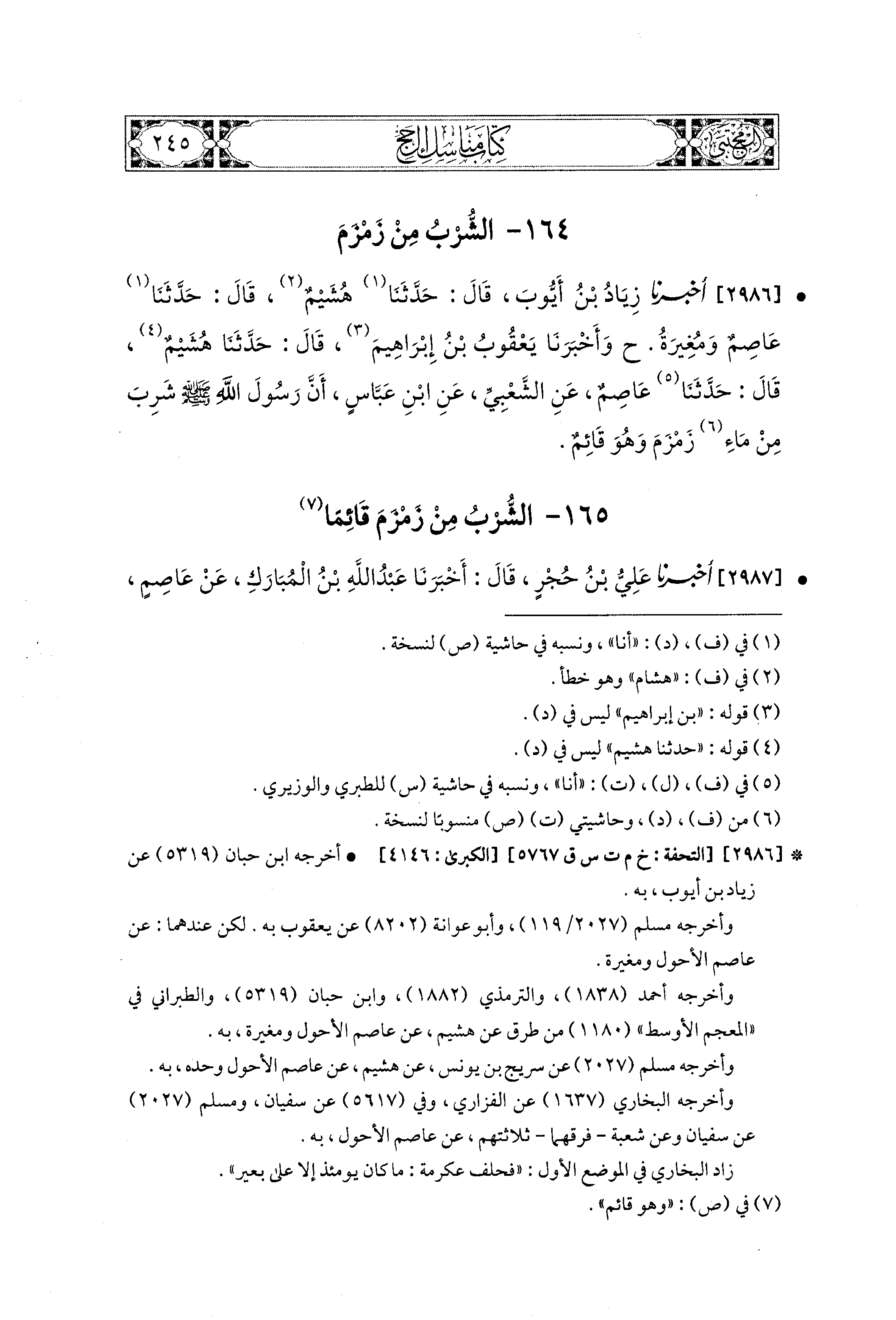 2986 - أَخبَرَنا زِيَادُ بْنُ أَيُّوبَ، قال: حَدثنا هُشَيْمٌ، قَالَ: حَدثنا عَاصِمٌ، وَمُغِيرَةُ (ح) وَأَخبَرنا يَعقُوبُ بْنُ إِبراهِيمَ، قال: حَدثنا هُشَيْمٌ، قَالَ: حَدثنا عَاصِمٌ، عَنِ الشَّعْبِيِّ، عَنِ ابنِ عَبَّاسٍ أَنَّ رَسُولَ اللهِ صَلى الله عَليه وسَلم، شَرِبَ مِنْ مَاءِ زَمْزَمَ وَهُوَ قَائِمٌ.