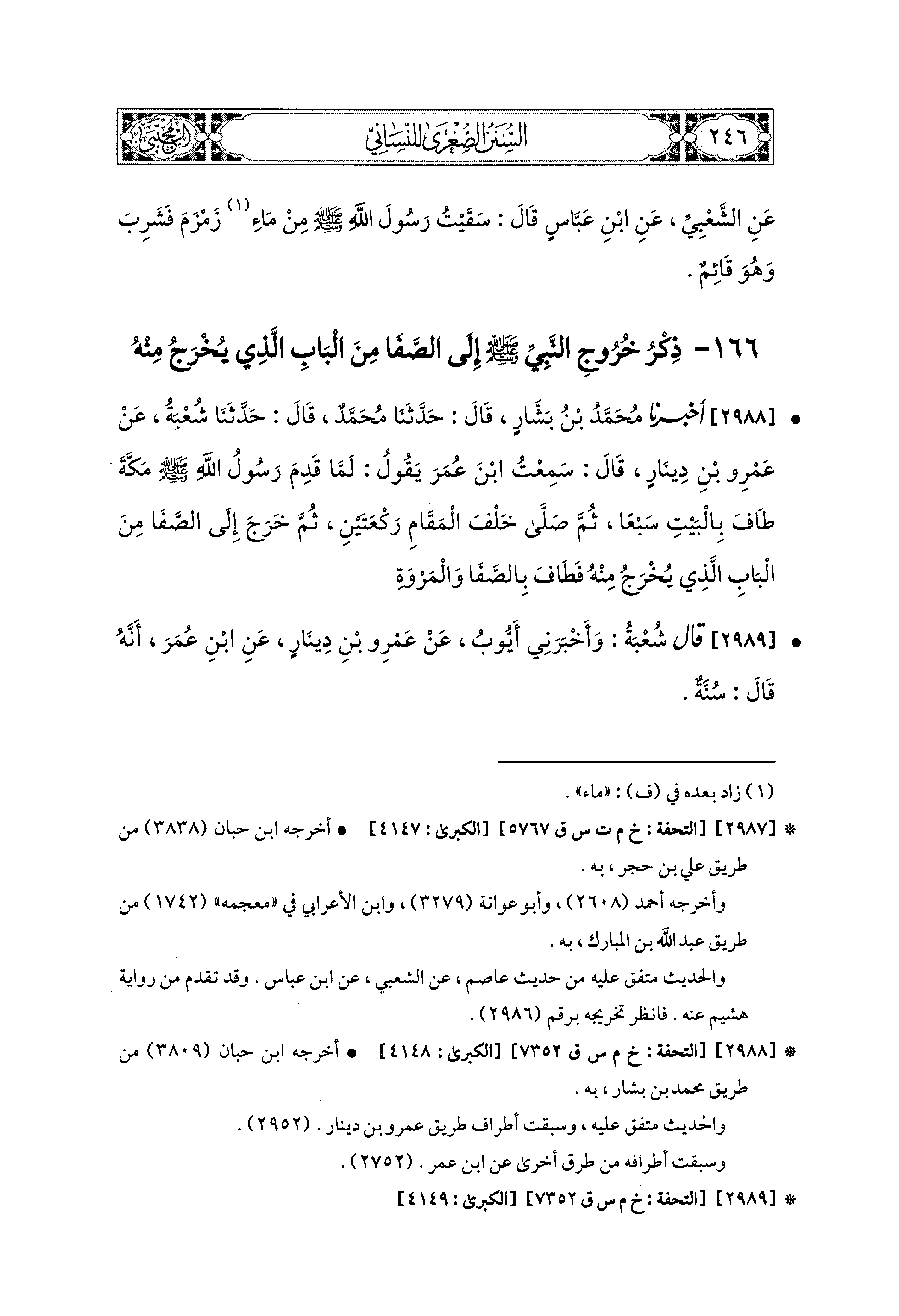 2988 - أَخبَرَنا مُحَمد بْنُ بَشَّارٍ، قال: حَدثنا مُحَمدٌ، قال: حَدثنا شُعبَةُ، عَن عَمرِو بن دِينارٍ، قَالَ: سَمِعْتُ ابنَ عُمَرَ، يَقُولُ: لَمَّا قَدِمَ رَسُولُ اللهِ صَلى الله عَليه وسَلم مَكَّةَ، طَافَ بِالبَيْتِ سَبْعًا، ثُمَّ صَلَّى خَلْفَ المَقَامِ رَكْعَتَيْنِ، ثُمَّ خَرَجَ إِلَى الصَّفَا مِنَ البَابِ الَّذِي يُخْرَجُ مِنْهُ، فَطَافَ بِالصَّفَا وَالمَرْوَةِ.
