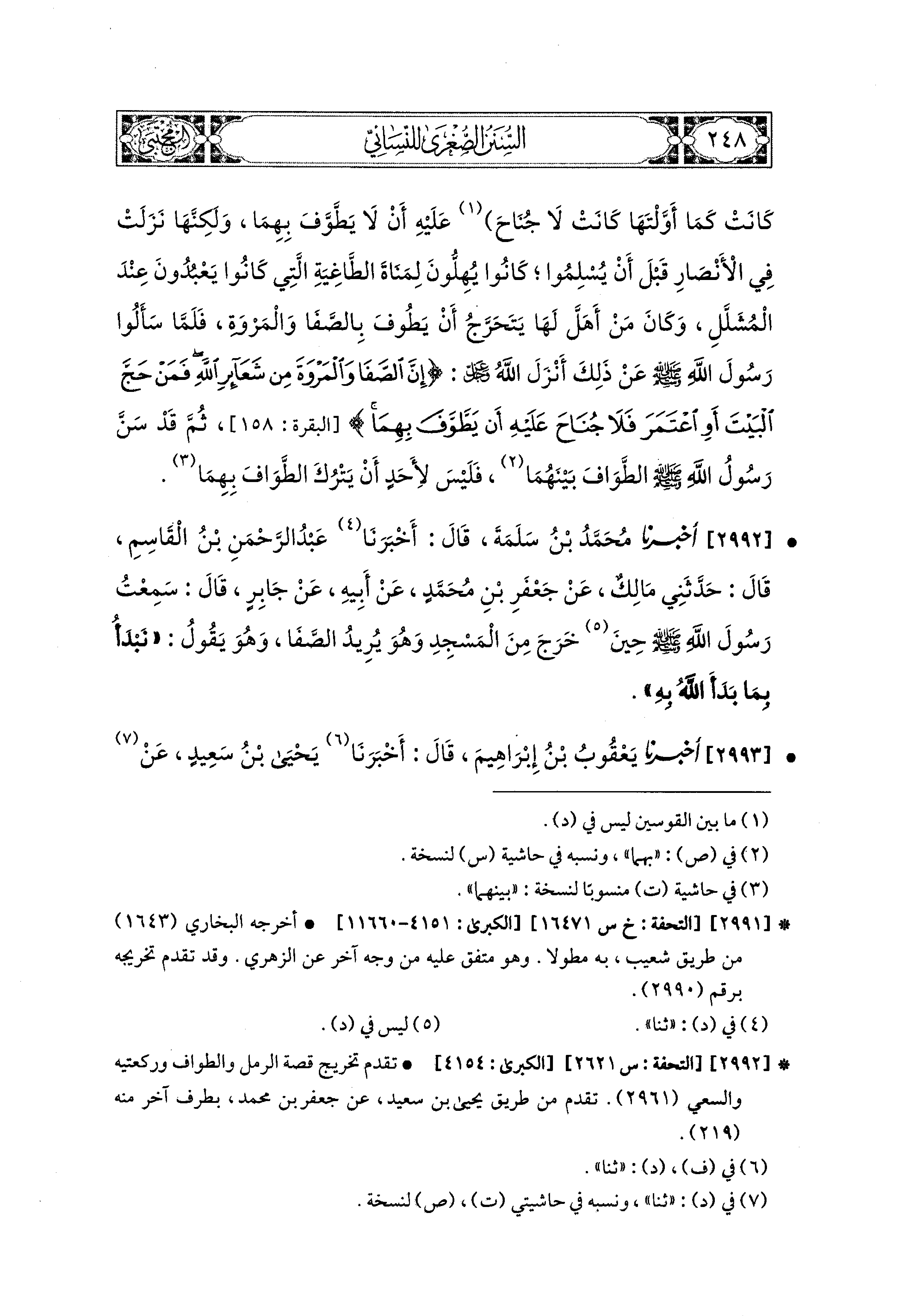 2992 - أَخبَرَنا مُحَمد بْنُ سَلَمَةَ، قَالَ: أَخبَرنا عَبدُ الرَّحمَنِ بْنُ القَاسِمِ، قَالَ: حَدَّثَني مَالِكٌ، عَن جَعْفَرِ بْنِ مُحَمدٍ، عَن أَبيهِ، عَن جَابِرٍ، قَالَ: سَمِعْتُ رَسُولَ اللهِ صَلى الله عَليه وسَلم حِينَ خَرَجَ مِنَ المَسْجِدِ وَهُوَ يُرِيدُ الصَّفَا، وَهُوَ يَقُولُ: نَبْدَأُ بِمَا بَدَأَ اللهُ بِهِ.