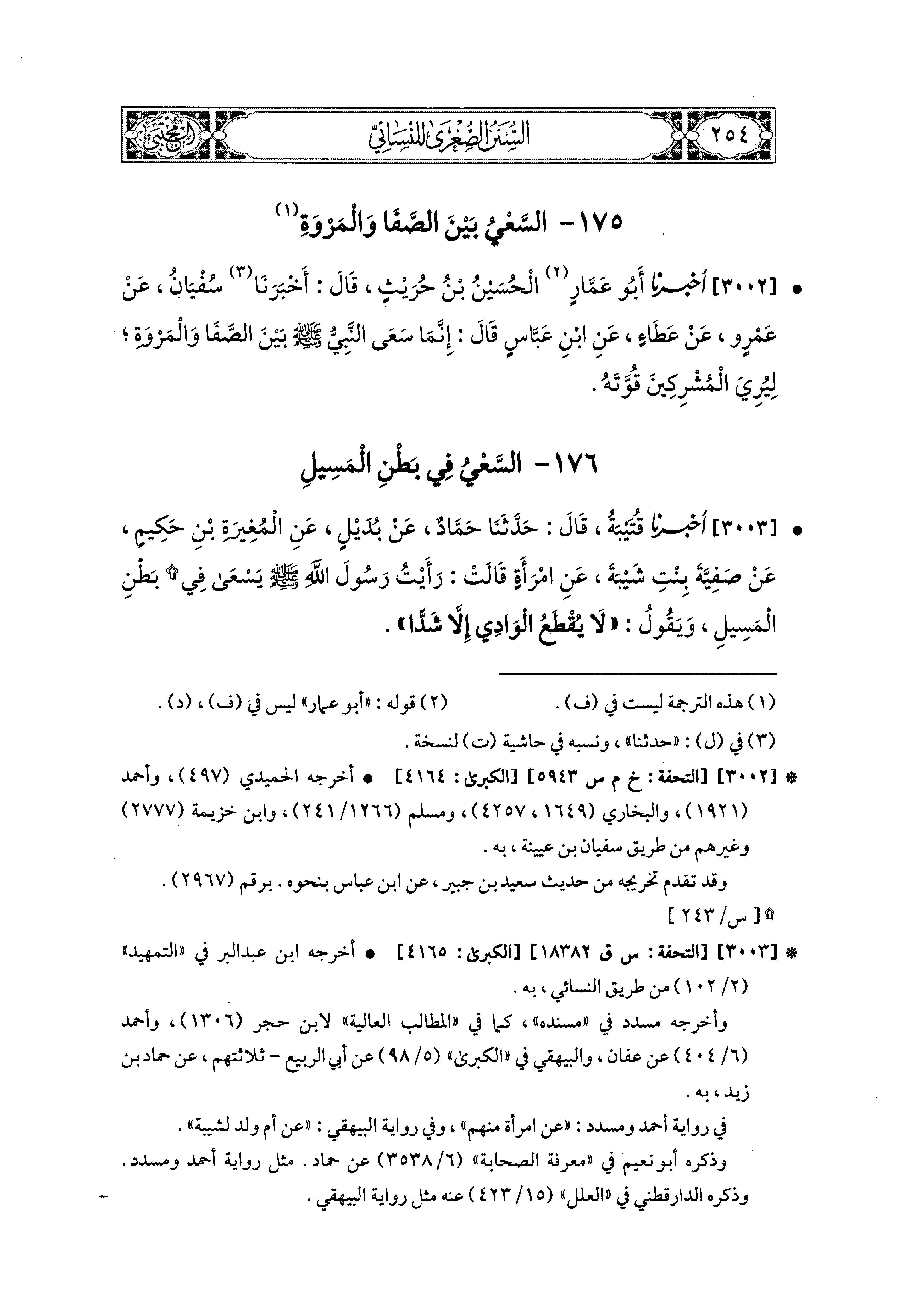 3003 - أَخبَرَنا قُتَيبَةُ، قال: حَدثنا حَمَّادٌ، عَن بُدَيْلٍ، عَنِ المُغِيرَةِ بْنِ حَكِيمٍ، عَن صَفِيَّةَ بِنْتِ شَيْبَةَ، عَنِ امْرَأَةٍ قَالَتْ: رَأَيْتُ رَسُولَ اللهِ صَلى الله عَليه وسَلم، يَسْعَى فِي بَطْنِ المَسِيلِ، وَيَقُولُ: لاَ يُقْطَعُ الوَادِي إِلاَّ شَدًّا.