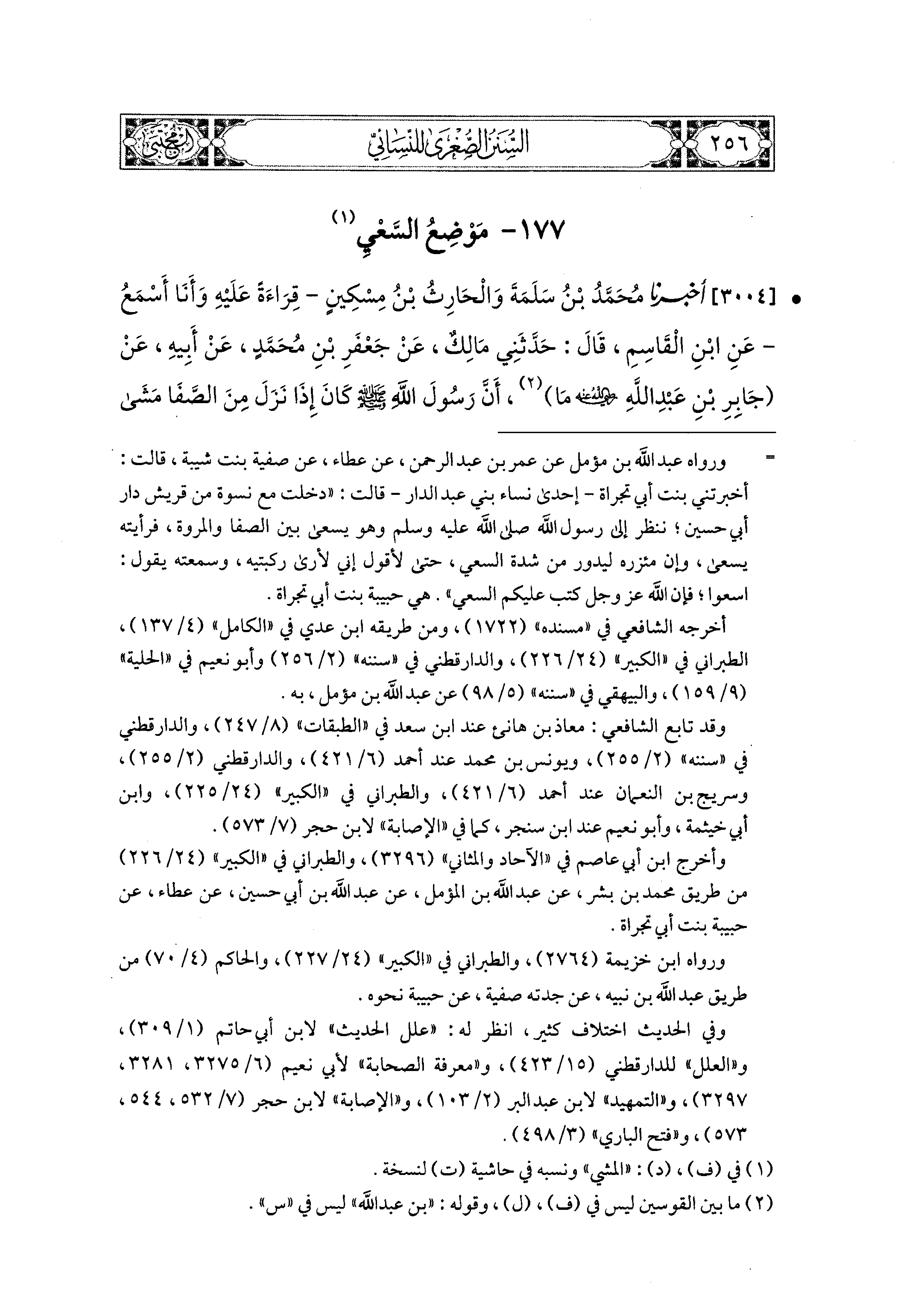 3004 - أَخبَرَنا مُحَمد بْنُ سَلَمَةَ، وَالحَارِثُ بْنُ مِسكينٍ، قِرَاءَةً عَلَيهِ وَأَنَا أَسْمَعُ، عَنِ ابنِ القَاسِمِ، قَالَ: حَدَّثَني مَالِكٌ، عَن جَعْفَرِ بْنِ مُحَمدٍ، عَن أَبيهِ، عَن جَابِرِ بْنِ عَبدِ اللهِ رَضِيَ اللهُ عَنهُ، ما أَنَّ رَسُولَ اللهِ صَلى الله عَليه وسَلم كَانَ إِذَا نَزَلَ مِنَ الصَّفَا، مَشَى حَتَّى إِذَا انْصَبَّتْ قَدَمَاهُ فِي بَطْنِ الوَادِي سَعَى حَتَّى يَخْرُجَ مِنْهُ.