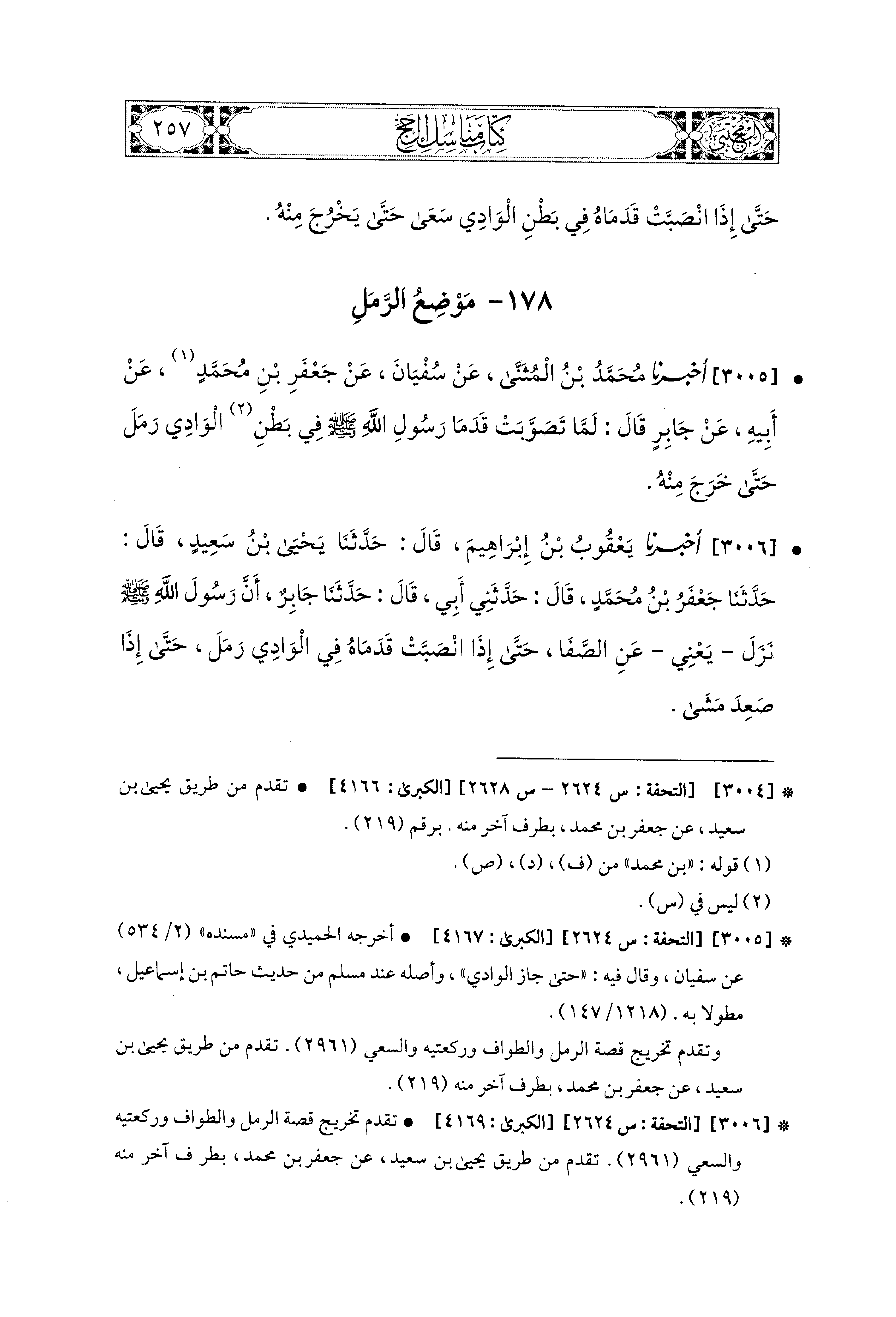 3005 - أَخبَرَنا مُحَمد بْنُ المُثَنَّى، عَن سُفيَانَ، عَن جَعْفَرِ بْنُ مُحَمد، عَن أَبيهِ، عَن جَابِرٍ، قَالَ: لَمَّا تَصَوَّبَتْ قَدَمَا رَسُولِ اللهِ صَلى الله عَليه وسَلم فِي بَطْنِ الوَادِي، رَمَلَ حَتَّى خَرَجَ مِنْهُ.