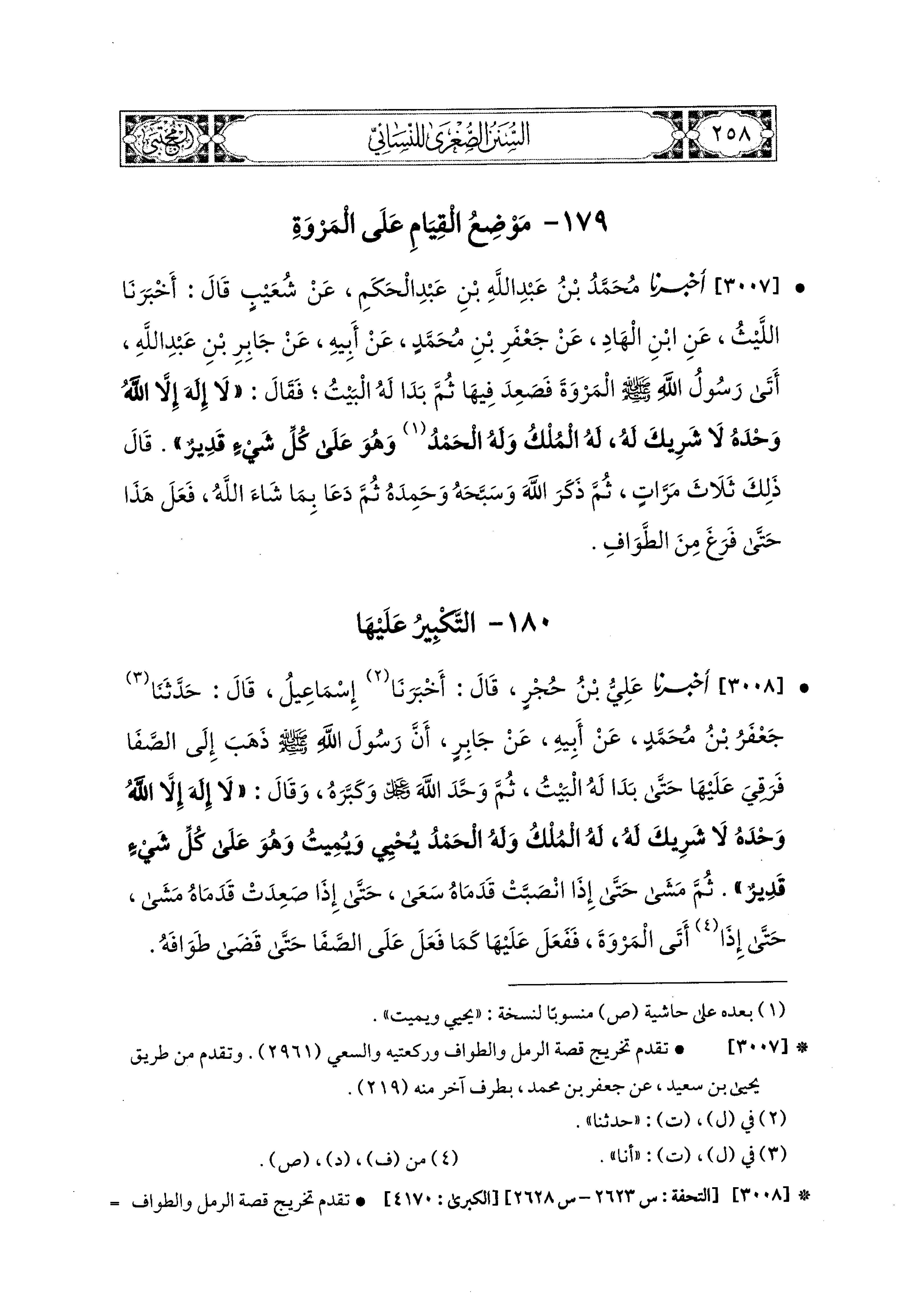 3008 - أَخبَرَنا عَلِيُّ بْنُ حُجْرٍ، قال: أَخبَرَنا إِسماعِيلُ، قَالَ: حَدَّثنا جَعْفَرُ بْنُ مُحَمدٍ، عَن أَبيهِ، عَن جَابِرٍ أَنَّ رَسُولَ اللهِ صَلى الله عَليه وسَلم ذَهَبَ إِلَى الصَّفَا فَرَقِيَ عَلَيهَا حَتَّى بَدَا لَهُ البَيْتُ، ثُمَّ وَحَّدَ اللهَ عَزَّ وَجَلَّ وَكَبَّرَهُ، وَقَالَ: لاَ إِلَهَ إِلاَّ اللهُ، وَحْدَهُ لاَ شَرِيكَ لَهُ، لَهُ المُلْكُ وَلَهُ الحَمْدُ يُحْيِي وَيُميتُ وَهُوَ عَلَى كُلِّ شَيْءٍ قَدِيرٌ، ثُمَّ مَشَى حَتَّى إِذَا انْصَبَّتْ قَدَمَاهُ، سَعَى حَتَّى إِذَا صَعِدَتْ قَدَمَاهُ مَشَى، حَتَّى أَتَى المَرْوَةَ فَفَعَلَ عَلَيهَا كَمَا فَعَلَ عَلَى الصَّفَا حَتَّى قَضَى طَوَافَهُ.