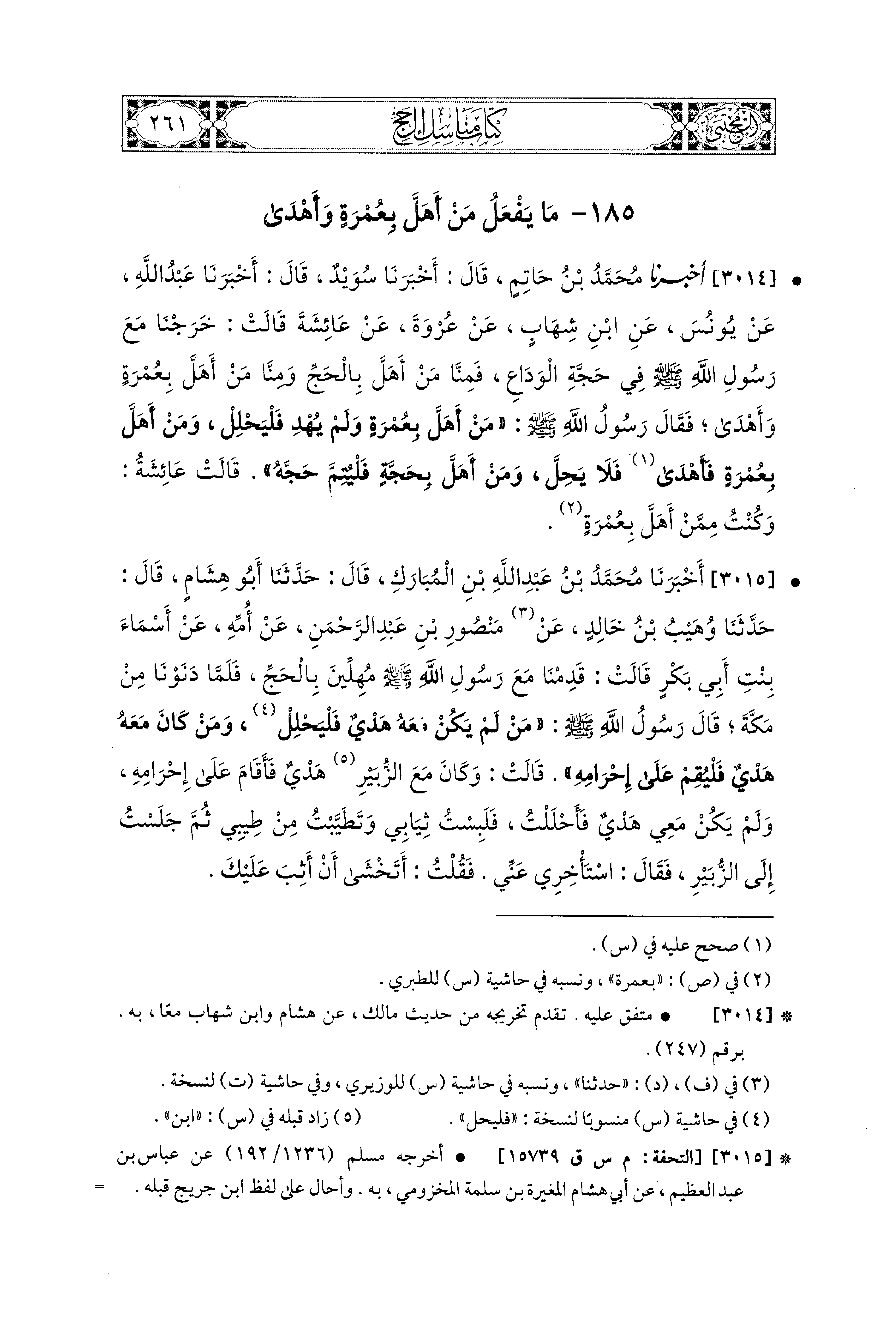 3015 - أَخبَرَنا مُحَمد بْنُ عَبدِ اللهِ بْنِ المُبَارَكِ، قال: حَدثنا أَبو هِشَامٍ، قال: حَدثنا وُهَيْبُ بْنُ خَالِدٍ، عَن مَنْصُورِ بْنِ عَبدِ الرَّحمَنِ، عَن أُمِّهِ، عَن أَسْمَاءَ بِنْتِ أَبي بَكْرٍ، قَالَتْ: قَدِمْنَا مَعَ رَسُولِ اللهِ صَلى الله عَليه وسَلم مُهِلِّينَ بِالحَجِّ، فَلَمَّا دَنَوْنَا مِنْ مَكَّةَ، قَالَ رَسُولُ اللهِ صَلى الله عَليه وسَلم: مَنْ لَمْ يَكُنْ مَعَهُ هَدْيٌ فَلْيَحْلِلْ، وَمَنْ كَانَ مَعَهُ هَدْيٌ فَلْيُقِمْ عَلَى إِحْرَامِهِ، قَالَتْ: وَكَانَ مَعَ الزُّبَيْرِ هَدْيٌ، فَأَقَامَ عَلَى إِحْرَامِهِ، وَلَمْ يَكُنْ مَعِي هَدْيٌ فَأَحْلَلْتُ، فَلَبِسْتُ ثِيَابي وَتَطَيَّبْتُ مِنْ طِيبِي، ثُمَّ جَلَسْتُ إِلَى الزُّبَيْرِ، فَقَالَ: اسْتَأْخِرِي عَنِّي، فَقُلْتُ: أَتَخْشَى أَنْ أَثِبَ عَلَيْكَ.