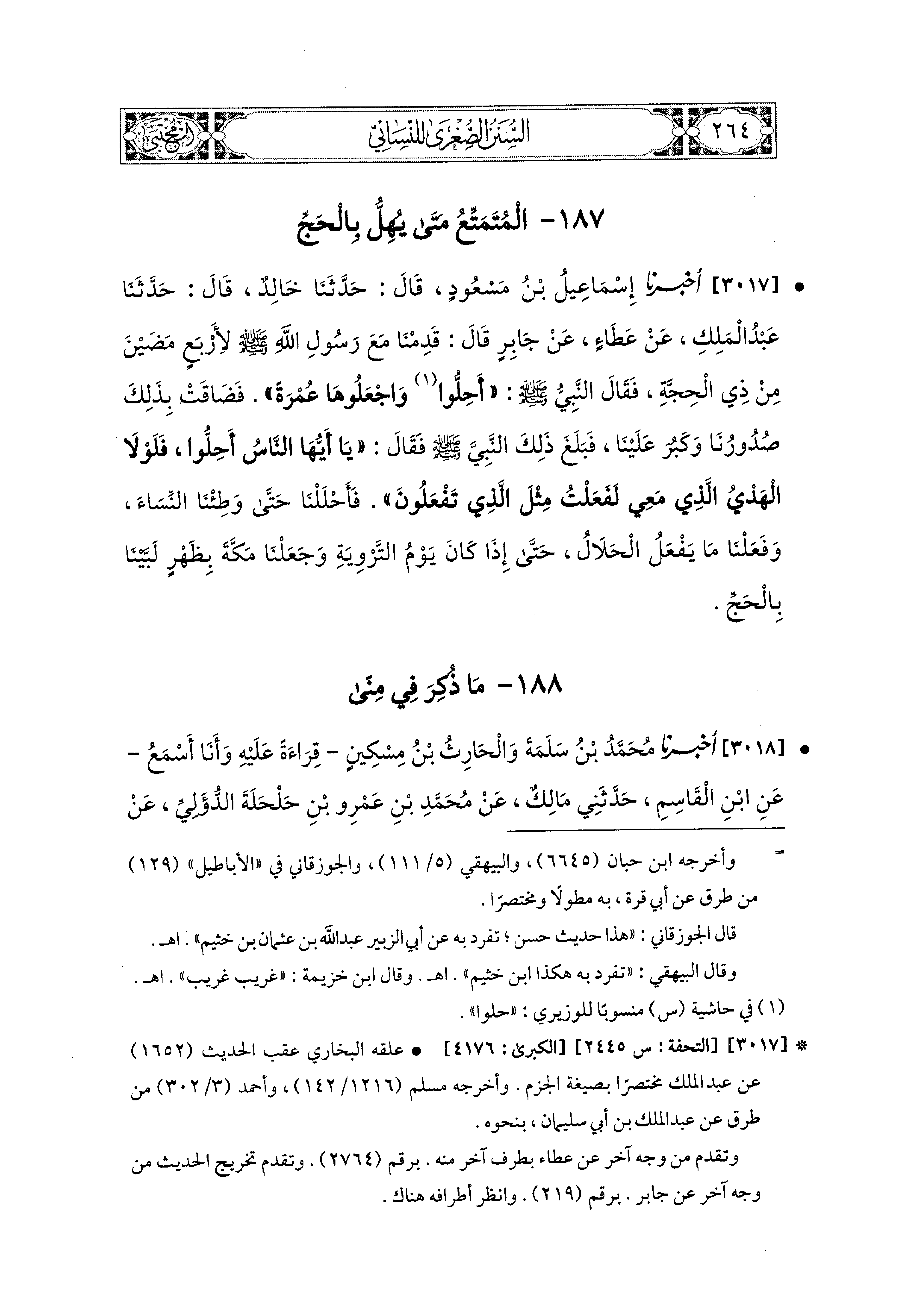 3017 - أَخبَرَنا إِسماعِيلُ بْنُ مَسْعُودٍ، قال: حَدثنا خَالِدٌ، قال: حَدثنا عَبدُ المَلِكِ، عَن عَطَاءٍ، عَن جَابِرٍ، قَالَ: قَدِمْنَا مَعَ رَسُولِ اللهِ صَلى الله عَليه وسَلم لأَرْبَعٍ مَضَيْنَ مِنْ ذِي الحِجَّةِ، فَقَالَ النَّبيُّ صَلى الله عَليه وسَلم: أَحِلُّوا وَاجْعَلُوهَا عُمْرَةً، فَضَاقَتْ بِذَلِكَ صُدُورُنَا، وَكَبُرَ عَلَيْنَا، فَبَلَغَ ذَلِكَ النَّبيَّ صَلى الله عَليه وسَلم، فَقَالَ: يَا أَيُّهَا النَّاسُ أَحِلُّوا، فَلَوْلاَ الهَدْيُ الَّذِي مَعِي لَفَعَلْتُ مِثْلَ الَّذِي تَفْعَلُونَ، فَأَحْلَلْنَا حَتَّى وَطِئْنَا النِّسَاءَ، وَفَعَلْنَا مَا يَفْعَلُ الحَلاَلُ، حَتَّى إِذَا كَانَ يَوْمُ التَّرْوِيَةِ، وَجَعَلْنَا مَكَّةَ بِظَهْرٍ لَبَّيْنَا بِالحَجِّ.