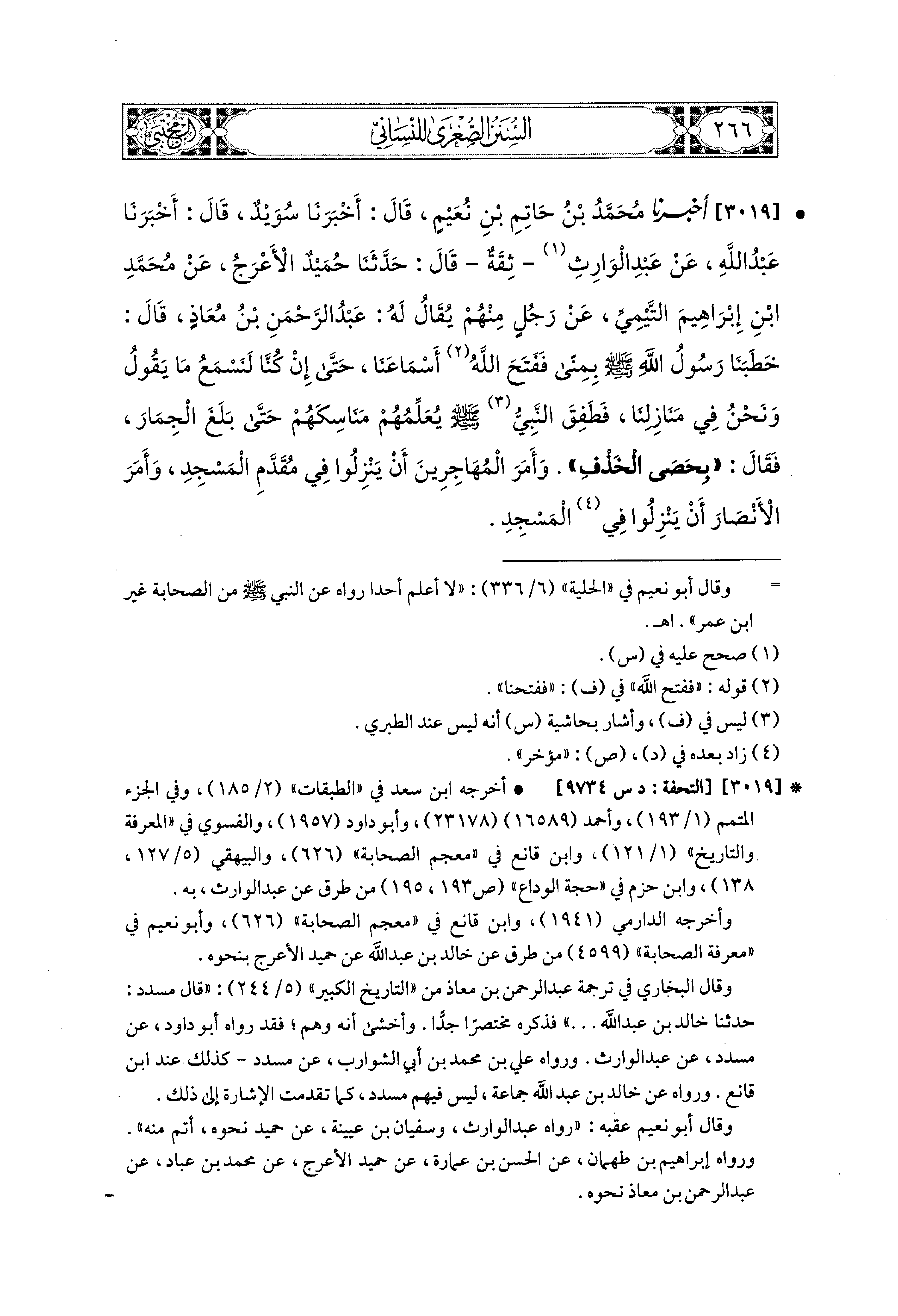 3019 - أَخبَرَنا مُحَمد بْنُ حَاتِمِ بْنِ نَعِيمٍ، قَالَ: أَخبَرنا سُوَيْدٌ، قَالَ: أَخبَرنا عَبدُ اللهِ، عَن عَبدِ الوَارِثِ ثِقَةٌ، قال: حَدثنا حُمَيدٌ الأَعْرَجُ، عَن مُحَمدِ بْنِ إِبراهِيمَ التَّيْميِّ، عَن رَجُلٍ مِنْهُمْ يُقَالُ لَهُ: عَبدُ الرَّحمَنِ بْنُ مُعَاذٍ، قَالَ: خَطَبَنَا رَسُولُ اللهِ صَلى الله عَليه وسَلم بِمِنًى، فَفَتَحَ اللهُ أَسْمَاعَنَا حَتَّى إِنْ كُنَّا لَنَسْمَعُ مَا يَقُولُ وَنَحْنُ فِي مَنَازِلِنَا، فَطَفِقَ النَّبيُّ صَلى الله عَليه وسَلم، يُعَلِّمُهُمْ مَنَاسِكَهُمْ حَتَّى بَلَغَ الجِمَارَ، فَقَالَ: بِحَصَى الخَذْفِ وَأَمَرَ المُهَاجِرِينَ أَنْ يَنْزِلُوا فِي مُقَدَّمِ المَسْجِدِ، وَأَمَرَ الأَنصَارَ أَنْ يَنْزِلُوا فِي المَسْجِدِ.