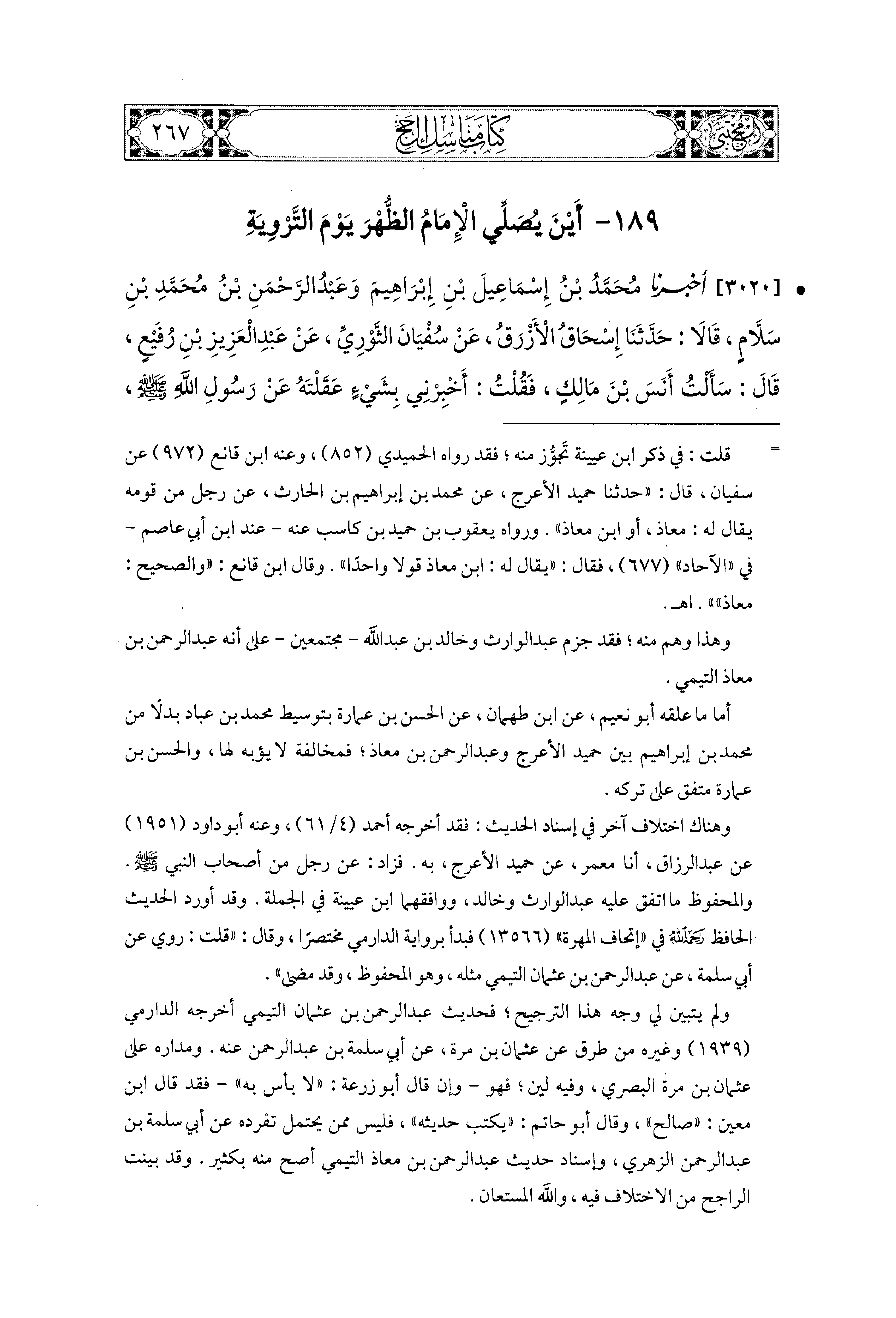 3020 - أَخبَرَنا مُحَمد بْنُ إِسماعِيلَ بْنِ إِبراهِيمَ، وَعَبدُ الرَّحمَنِ بْنُ مُحَمدِ بْنِ سَلاَّمٍ، قَالاَ: حَدَّثَنَا إِسحَاقُ الأَزْرَقُ، عَن سُفيَانَ الثَّوْرِيِّ، عَن عَبدِ العَزِيزِ بْنِ رُفَيْعٍ، قَالَ: سَأَلْتُ أَنَسَ بْنَ مَالِكٍ، فَقُلْتُ: أَخْبِرْني بِشَيْءٍ عَقَلْتَهُ عَن رَسُولِ اللهِ صَلى الله عَليه وسَلم، أَيْنَ صَلَّى الظُّهْرَ يَوْمَ التَّرْوِيَةِ؟ قَالَ: بِمِنًى، قُلْتُ: فأَيْنَ صَلَّى العَصْرَ يَوْمَ النَّفْرِ؟ قَالَ: بِالأَبْطَحِ.