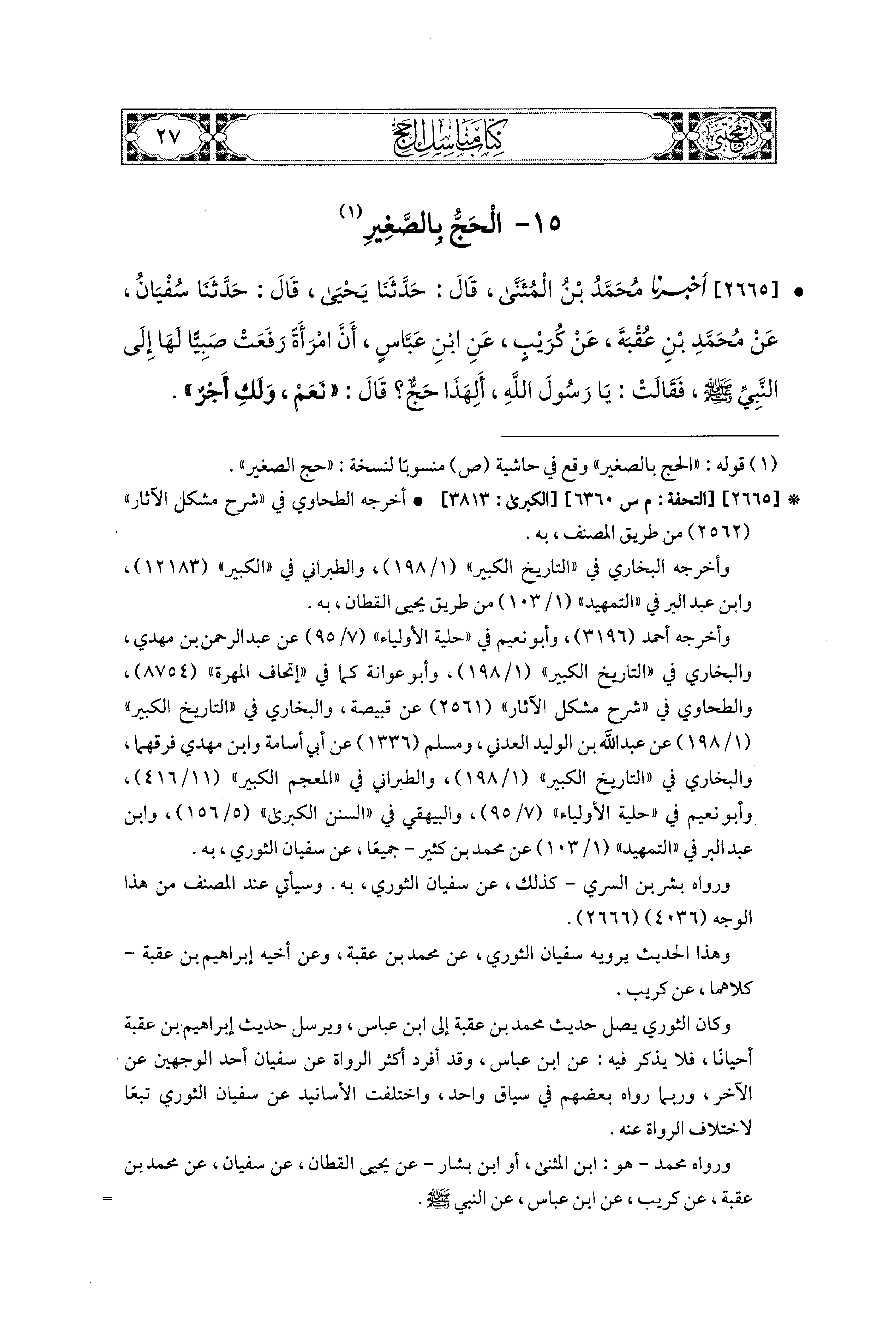 2665 - أَخبَرَنا مُحَمد بْنُ المُثَنَّى، قال: حَدثنا يَحيَى، قال: حَدثنا سُفيَانُ، عَن مُحَمدِ بْنِ عُقْبَةَ، عَن كُرَيْبٍ، عَنِ ابنِ عَبَّاسٍ، أَنَّ امْرَأَةً رَفَعَتْ صَبِيًّا لَهَا إِلَى النَّبيَّ صَلى الله عَليه وسَلم، فَقَالَتْ: يَا رَسُولَ اللهِ، أَلِهَذَا حَجٌّ؟ قَالَ: نَعَمْ، وَلَكِ أَجْرٌ.