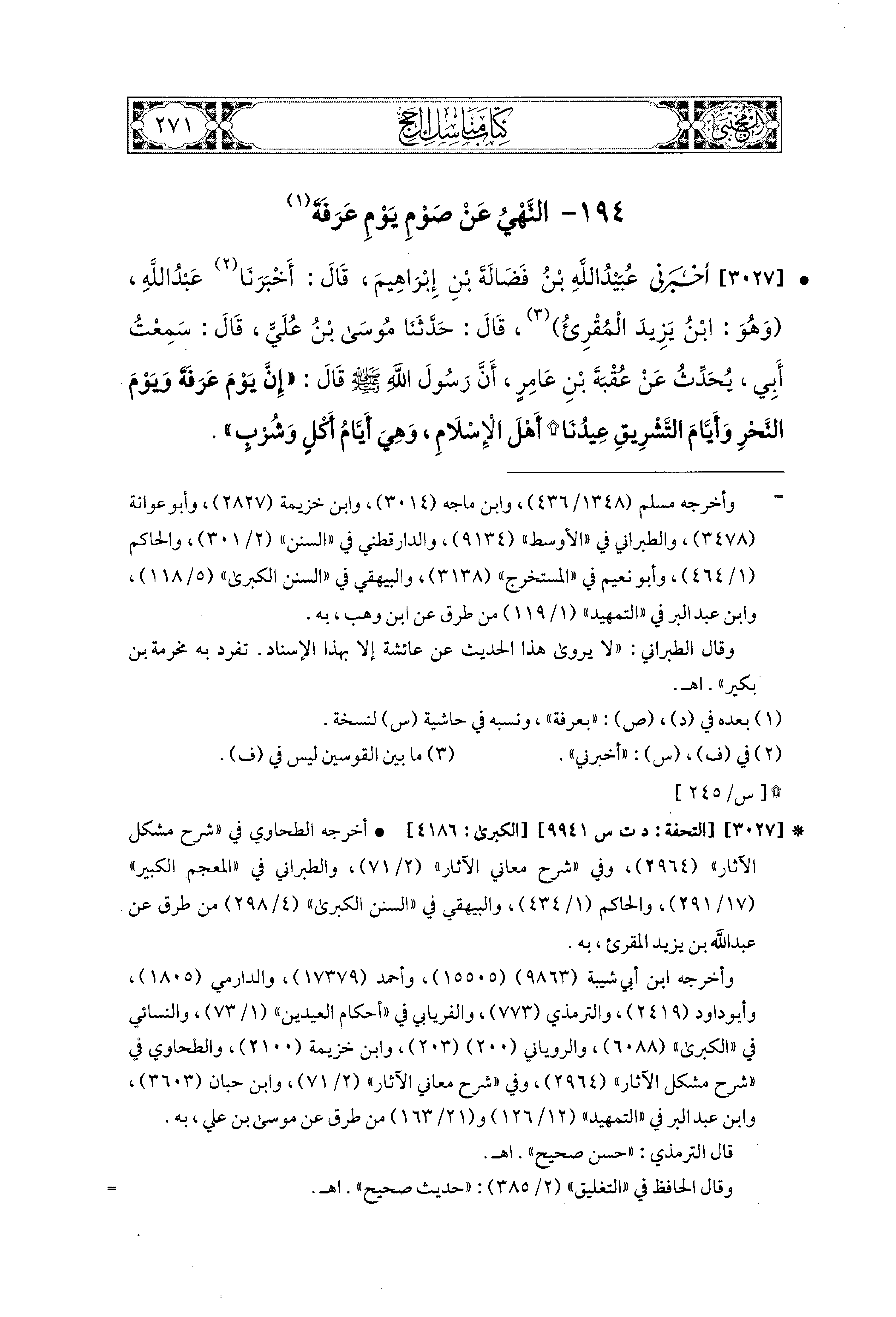 3027 - أَخبَرني عُبَيدُ اللهِ بْنُ فَضَالَةَ بْنِ إِبراهِيمَ، قَالَ: أَخبَرنا عَبدُ اللهِ، وَهُوَ ابنُ يَزِيدَ المُقْرِئ، قال: حَدثنا مُوسَى بْنُ عَلِيٍّ، قَالَ: سَمِعْتُ أَبي يُحَدِّثُ، عَن عُقْبَةَ بْنِ عَامِرٍ، أَنَّ رَسُولَ اللهِ صَلى الله عَليه وسَلم قَالَ: إِنَّ يَوْمَ عَرَفَةَ وَيَوْمَ النَّحْرِ وَأَيَّامَ التَّشْرِيقِ عيدُنَا أَهْلَ الإِسْلاَمِ، وَهِيَ أَيَّامُ أَكْلٍ وَشُرْبٍ.