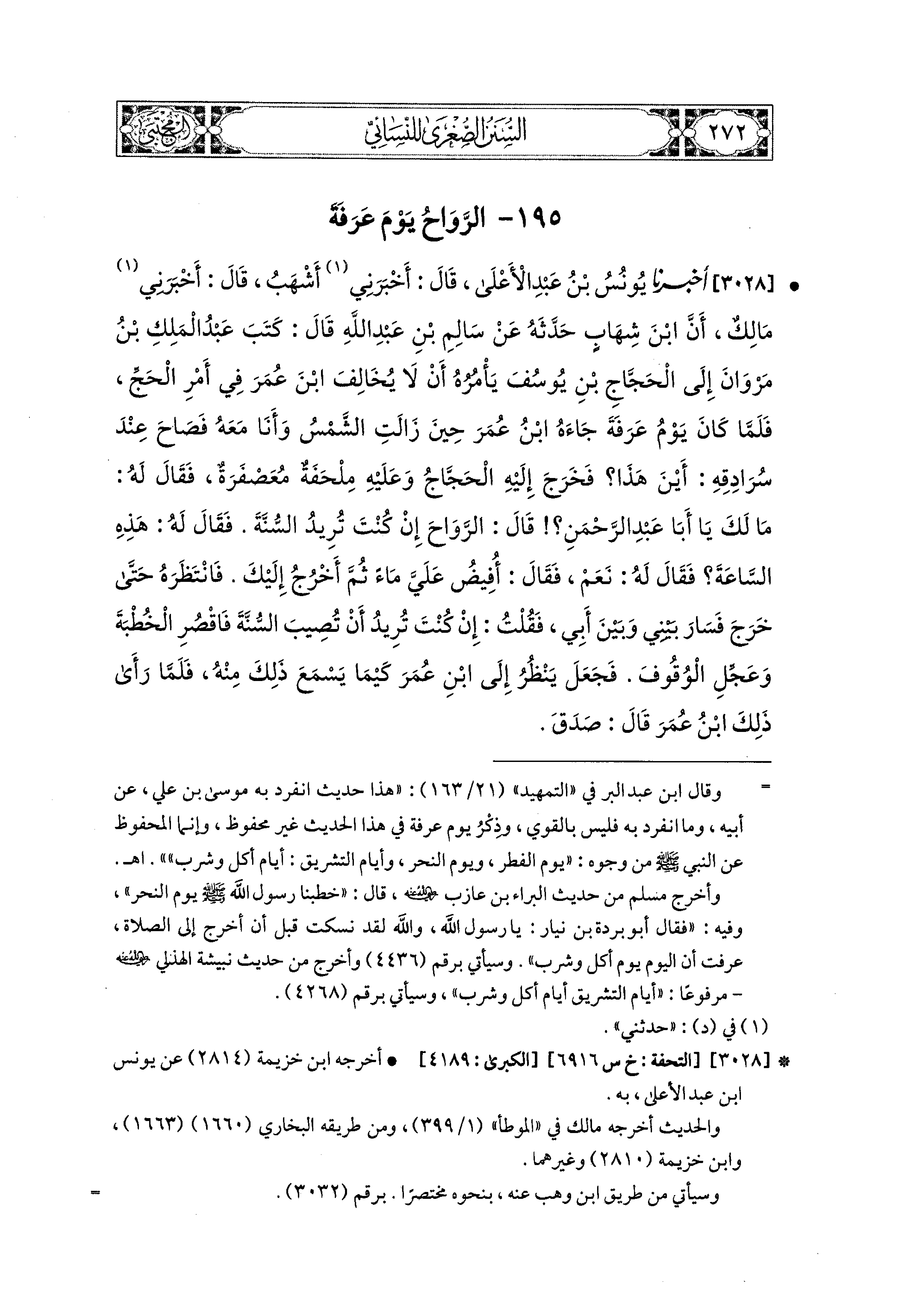 3028 - أَخبَرَنا يُونُسُ بن عَبدِ الأَعلَى، قَالَ: أَخبَرني أَشْهَبُ، قَالَ: أَخبَرني مَالِكٌ، أَنَّ ابنَ شِهَابٍ حَدَّثَهُ، عَن سَالِمِ بْنِ عَبدِ اللهِ، قَالَ: كَتَبَ عَبدُ المَلِكِ بْنُ مَرْوَانَ إِلَى الحَجَّاجِ بْنِ يُوسُفَ يَأْمُرُهُ أَنْ لاَ يُخَالِفَ ابنَ عُمَرَ فِي أَمْرِ الحَجِّ، فَلَمَّا كَانَ يَوْمُ عَرَفَةَ، جَاءَهُ ابنُ عُمَرَ، حِينَ زَالَتِ الشَّمْسُ وَأَنَا مَعَهُ، فَصَاحَ عِنْدَ سُرَادِقِهِ: أَيْنَ هَذَا؟ فَخَرَجَ إِلَيْهِ الحَجَّاجُ وَعَلَيهِ مِلْحَفَةٌ مُعَصْفَرَةٌ، فَقَالَ لَهُ: مَا لَكَ يَا أَبَا عَبدِ الرَّحمَنِ؟ قَالَ: الرَّوَاحَ إِنْ كُنْتَ تُرِيدُ السُّنَّةَ، فَقَالَ لَهُ: هَذِهِ السَّاعَةَ؟ فَقَالَ لَهُ: نَعَمْ، فَقَالَ: أُفِيضُ عَلَيَّ مَاءً ثُمَّ أَخْرُجُ إِلَيْكَ، فَانْتَظَرَهُ حَتَّى خَرَجَ فَسَارَ بَيْني وَبَيْنَ أَبي، فَقُلْتُ: إِنْ كُنْتَ تُرِيدُ أَنْ تُصِيبَ السُّنَّةَ، فَاقْصُرِ الخُطْبَةَ، وَعَجِّلِ الوُقُوفَ، فَجَعَلَ يَنْظُرُ إِلَى ابنِ عُمَرَ كَيْمَا يَسْمَعَ ذَلِكَ مِنْهُ، فَلَمَّا رَأَى ذَلِكَ ابنُ عُمَرَ، قَالَ: صَدَقَ.