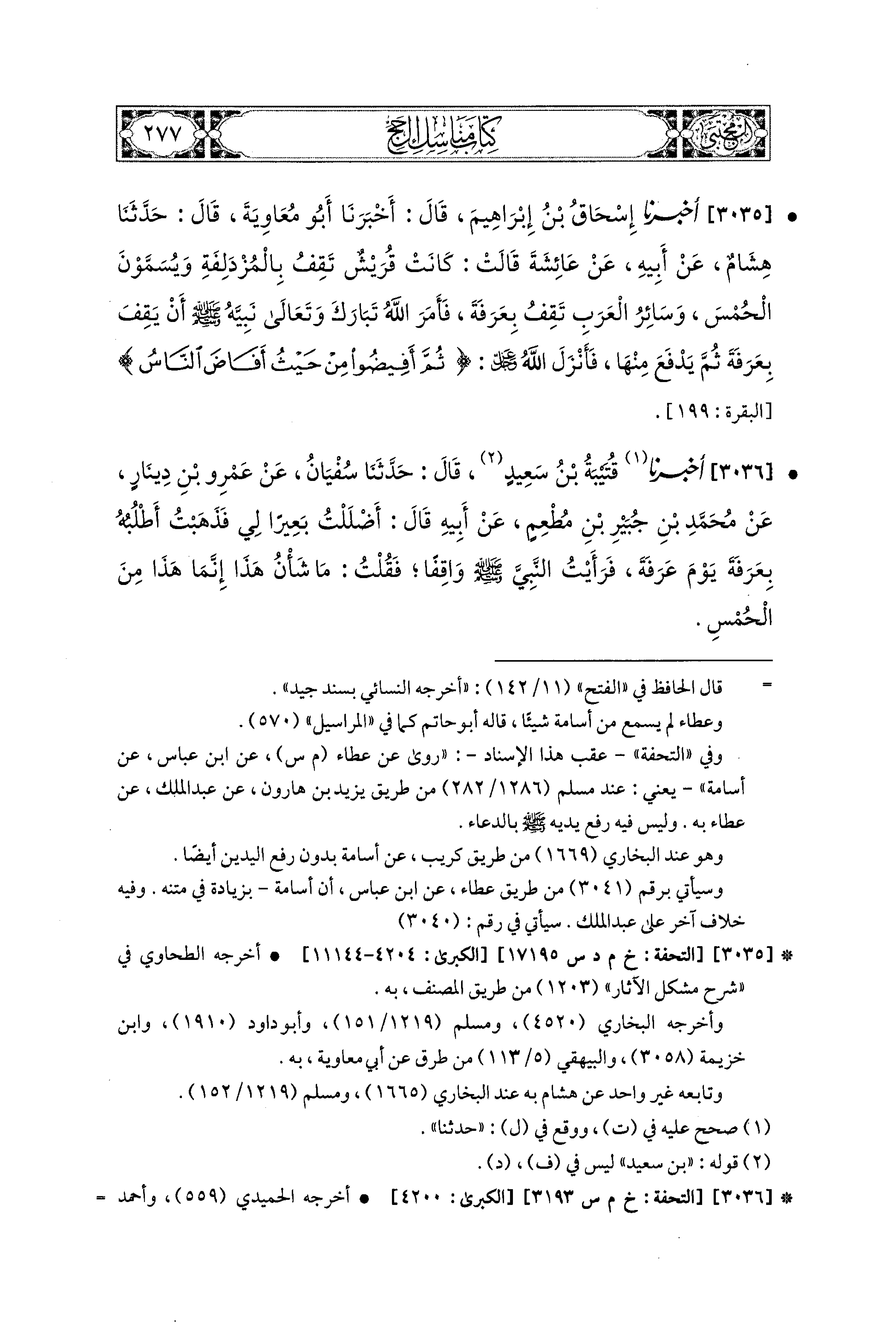 3035 - أَخبَرَنا إِسحَاقُ بْنُ إِبراهِيمَ، قَالَ: أَخبَرنا أَبو مُعَاوِيَةَ، قال: حَدثنا هِشَامٌ، عَن أَبيهِ، عَن عَائِشَةَ، قَالَتْ: كَانَتْ قُرَيْشٌ تَقِفُ بِالمُزْدَلِفَةِ، وَيُسَمَّوْنَ الحُمْسَ، وَسَائِرُ العَرَبِ تَقِفُ بِعَرَفَةَ، فَأَمَرَ اللهُ تَبَارَكَ وَتَعَالَى نَبِيَّهُ صَلى الله عَليه وسَلم أَنْ يَقِفَ بِعَرَفَةَ، ثُمَّ يَدْفَعُ مِنْهَا، فَأَنْزَلَ اللهُ عَزَّ وَجَلَّ: {ثُمَّ أَفِيضُوا مِنْ حَيْثُ أَفَاضَ النَّاسُ}.