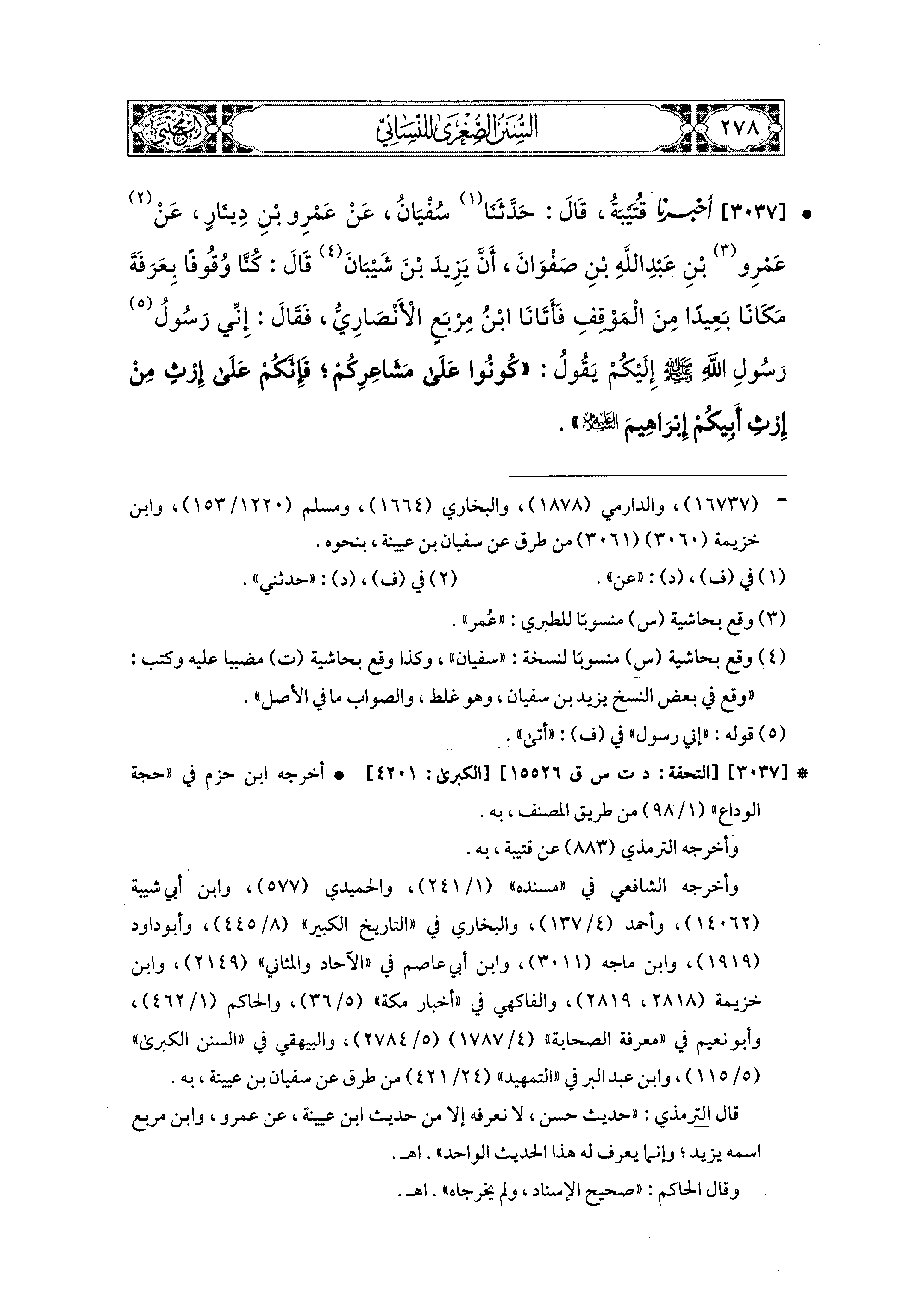 3037 - أَخبَرَنا قُتَيبَةُ، قال: حَدثنا سُفيَانُ، عَن عَمرِو بن دِينارٍ، عَن عَمْرِو بْنِ عَبدِ اللهِ بْنِ صَفْوَانَ، أَنَّ يَزِيدَ بْنَ شَيْبَانَ، قَالَ: كُنَّا وُقُوفًا بِعَرَفَةَ مَكَانًا بَعيدًا مِنَ المَوْقِفِ، فَأَتَانَا ابنُ مِرْبَعٍ الأَنصَارِيُّ، فَقَالَ: إِنِّي رَسُولُ رَسُولِ اللهِ صَلى الله عَليه وسَلم إِلَيْكُمْ، يَقُولُ: كُونُوا عَلَى مَشَاعِرِكُمْ، فَإِنَّكُمْ عَلَى إِرْثٍ مِنْ إِرْثِ أَبيكُمْ إِبراهِيمَ عَلَيهِ السَّلاَمُ.