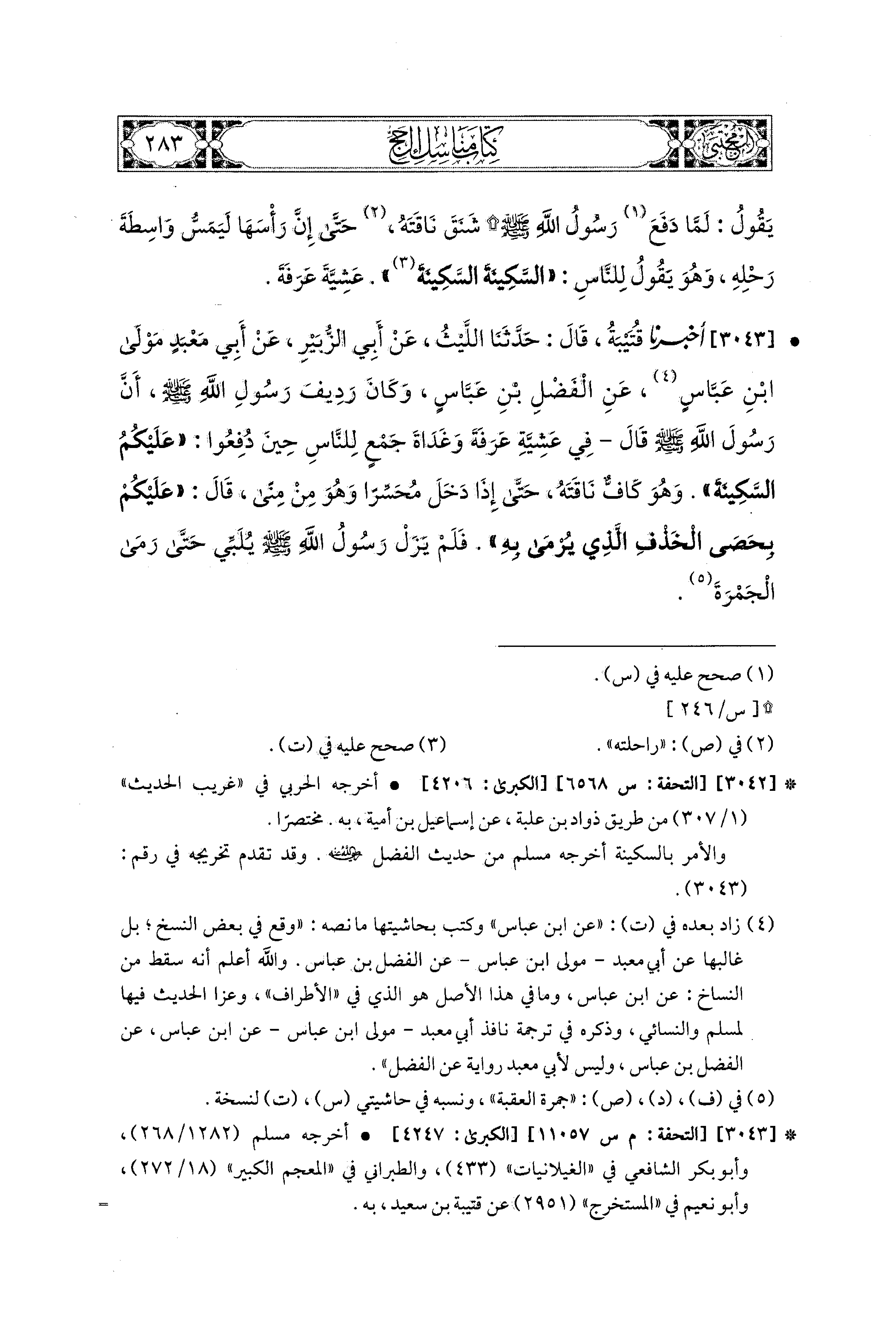 3043 - أَخبَرَنا قُتَيبَةُ، قال: حَدثنا اللَّيْثُ، عَن أَبي الزُّبَيْرِ، عَن أَبي مَعْبَدٍ، مَوْلَى ابنِ عَبَّاسٍ، عَنِ ابنِ عَبَّاسٍ (1)، عَنِ الفَضْلِ بْنِ عَبَّاسٍ، وَكَانَ رَدِيفَ رَسُولِ اللهِ صَلى الله عَليه وسَلم، أَنَّ رَسُولَ اللهِ صَلى الله عَليه وسَلم قَالَ فِي عَشِيَّةِ عَرَفَةَ وَغَدَاةِ جَمْعٍ لِلنَّاسِ حِينَ دَفَعُوا: عَلَيْكُمُ السَّكِينَةَ وَهُوَ كَافٌّ نَاقَتَهُ، حَتَّى إِذَا دَخَلَ مُحَسِّرًا، وَهُوَ مِنْ مِنًى، قَالَ: عَلَيْكُمْ بِحَصَى الخَذْفِ الَّذِي يُرْمَى بِهِ، فَلَمْ يَزَلْ رَسُولُ اللهِ صَلى الله عَليه وسَلم يُلَبِّي، حَتَّى رَمَى الجَمْرَةَ.