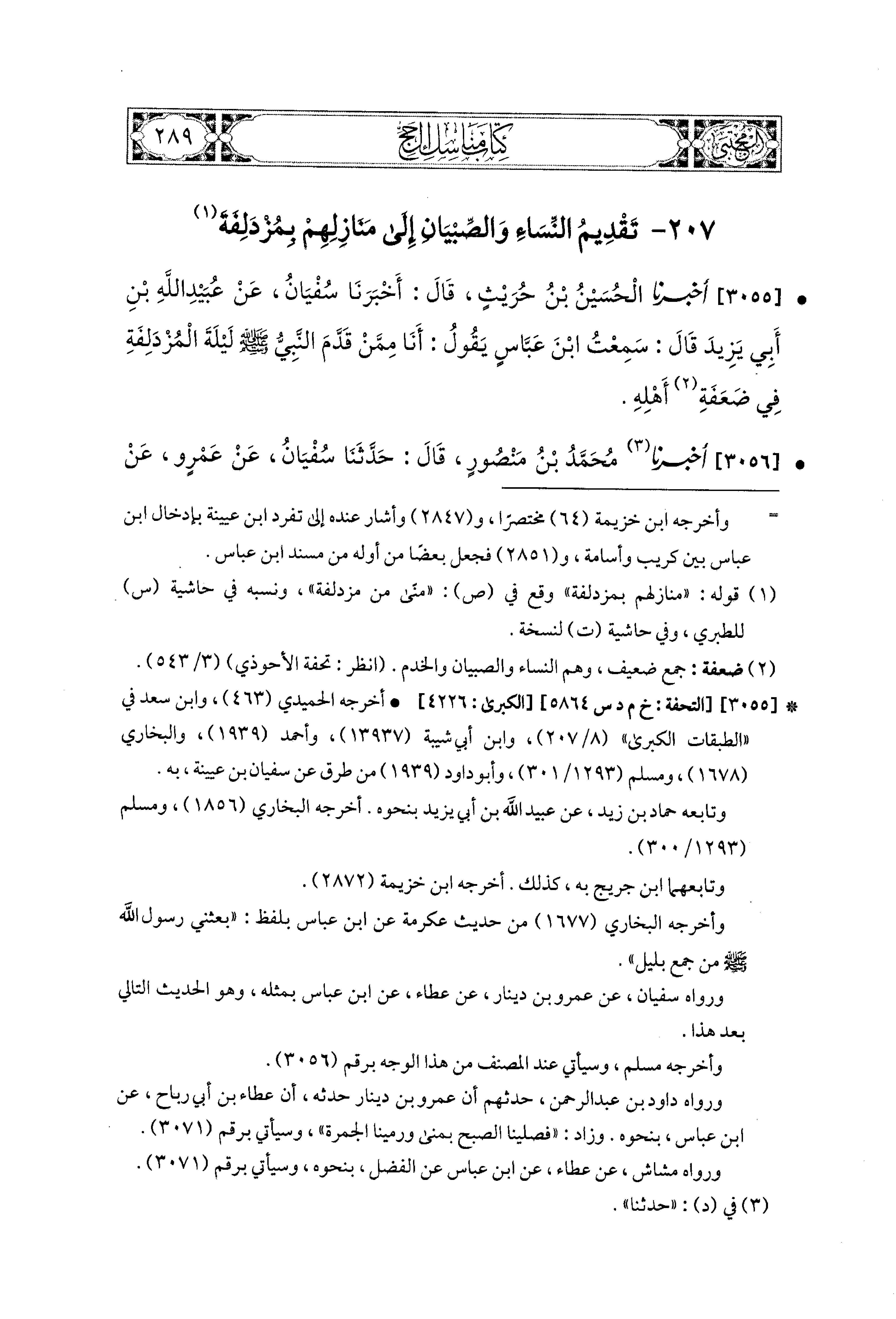 207 - تَقْدِيمُ النِّسَاءِ وَالصِّبْيَانِ إِلَى مَنَازِلِهِمْ بِمُزْدَلِفَةَ.
