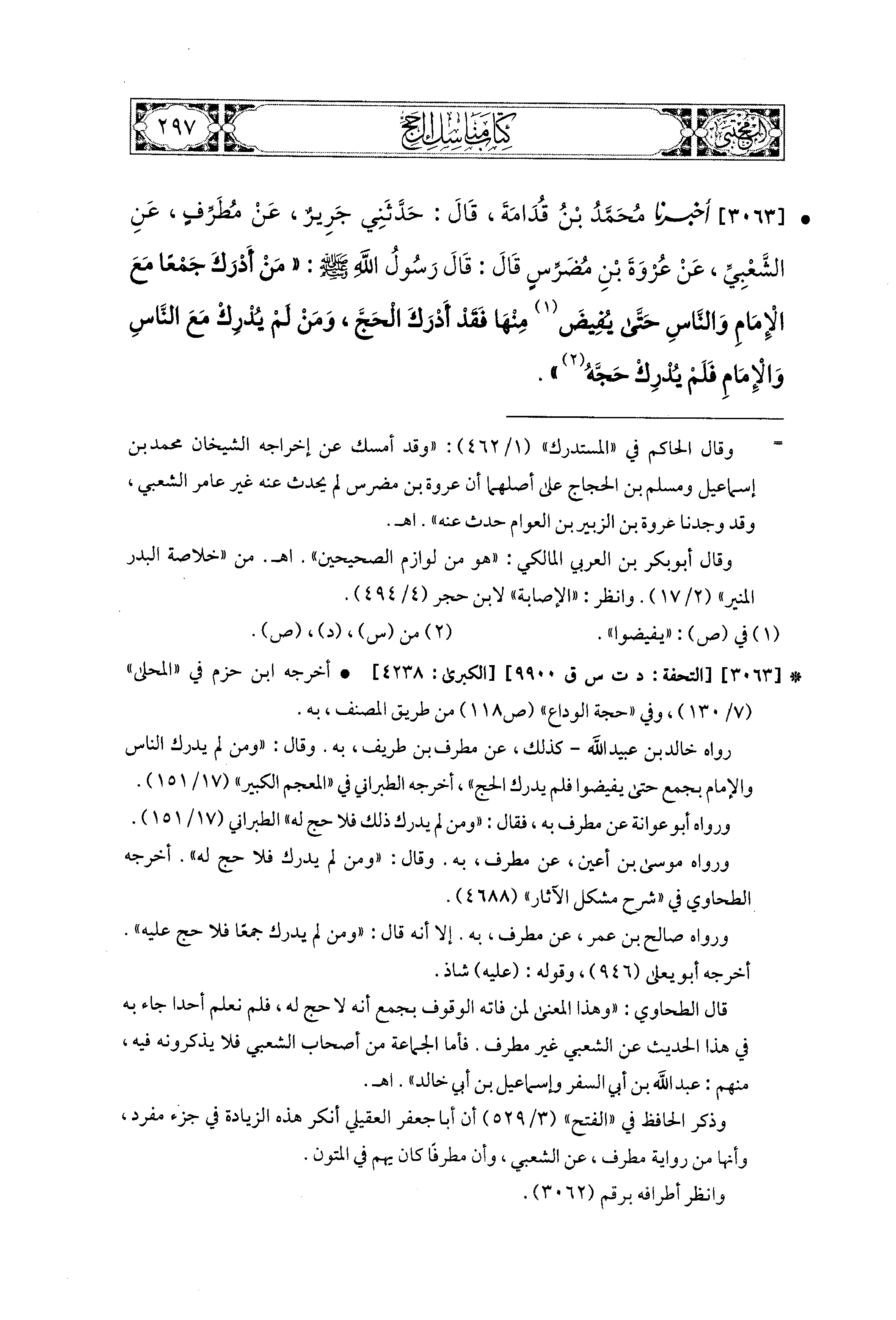 3063 - أَخبَرَنا مُحَمد بْنُ قُدَامَةَ، قَالَ: حَدَّثَني جَرِيرٌ، عَن مُطَرِّفٍ، عَنِ الشَّعْبِيِّ، عَن عُرْوَةَ بْنِ مُضَرِّسٍ، قَالَ: قَالَ رَسُولُ اللهِ صَلى الله عَليه وسَلم: مَنْ أَدْرَكَ جَمْعًا مَعَ الإِمَامِ وَالنَّاسِ حَتَّى يُفِيضَ مِنْهَا، فَقَدْ أَدْرَكَ الحَجَّ، وَمَنْ لَمْ يُدْرِكْ مَعَ النَّاسِ وَالإِمَامِ، فَلَمْ يُدْرِكْ حجه.
