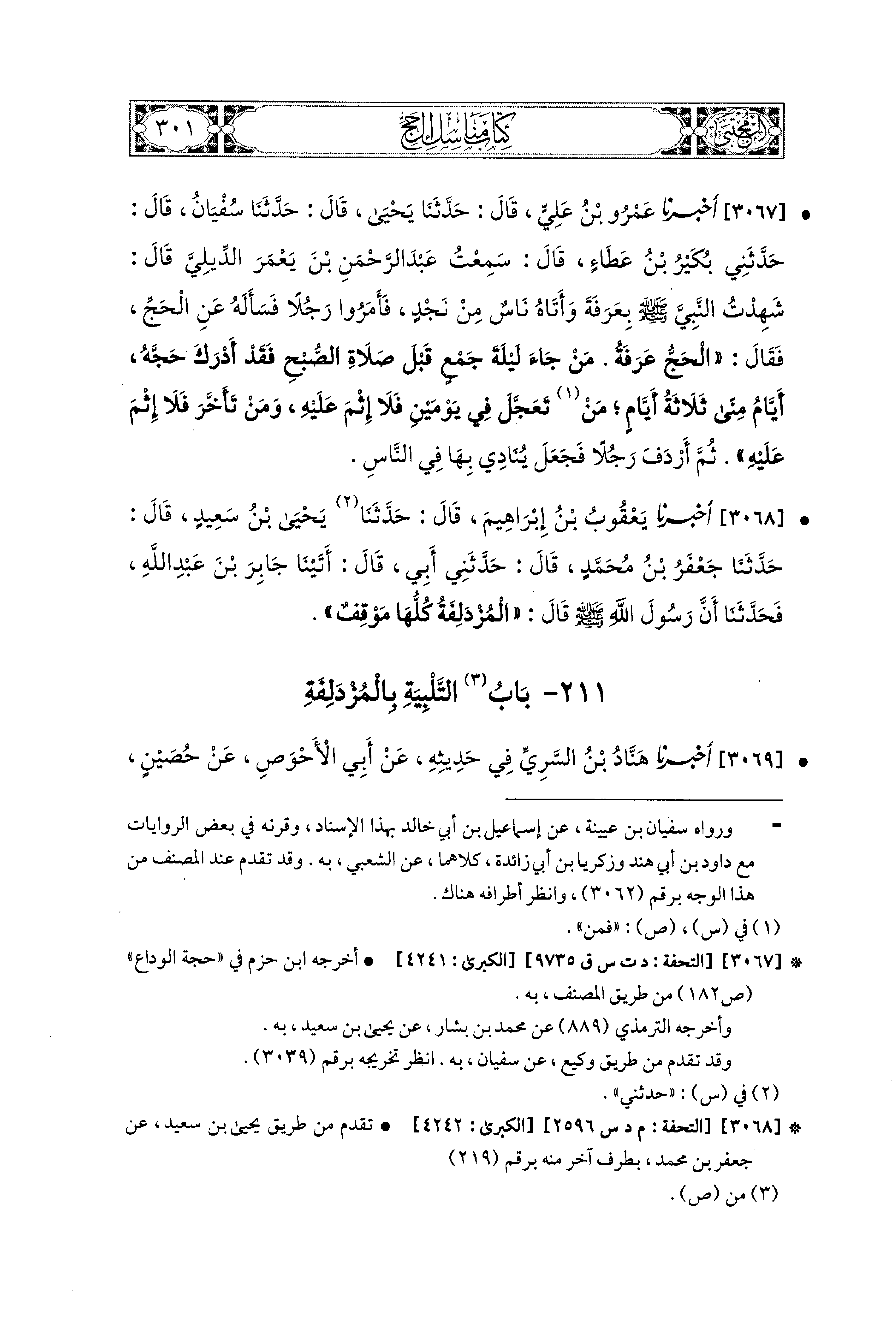 3067 - أَخبَرَنا عَمْرُو بْنُ عَلِيٍّ، قال: حَدثنا يَحيَى، قال: حَدثنا سُفيَانُ، قَالَ: حَدَّثَني بُكَيْرُ بْنُ عَطَاءٍ، قَالَ: سَمِعْتُ عَبدَ الرَّحمَنِ بْنَ يَعْمَرَ الدِّيلِيَّ، قَالَ: شَهِدْتُ النَّبيَّ صَلى الله عَليه وسَلم بِعَرَفَةَ وَأَتَاهُ نَاسٌ مِنْ نَجْدٍ، فَأَمَرُوا رَجُلاً، فَسَأَلَهُ عَنِ الحَجِّ، فَقَالَ: الحَجُّ عَرَفَةُ، مَنْ جَاءَ لَيْلَةَ جَمْعٍ قَبْلَ صَلاَةِ الصُّبْحِ فَقَدْ أَدْرَكَ حَجَّهُ، أَيَّامُ مِنًى ثَلاَثَةُ أَيَّامٍ، مَنْ تَعَجَّلَ فِي يَوْمَيْنِ فَلاَ إِثْمَ عَلَيهِ، وَمَنْ تَأَخَّرَ فَلاَ إِثْمَ عَلَيهِ، ثُمَّ أَرْدَفَ رَجُلاً فَجَعَلَ يُنَادِي بِهَا فِي النَّاسِ.