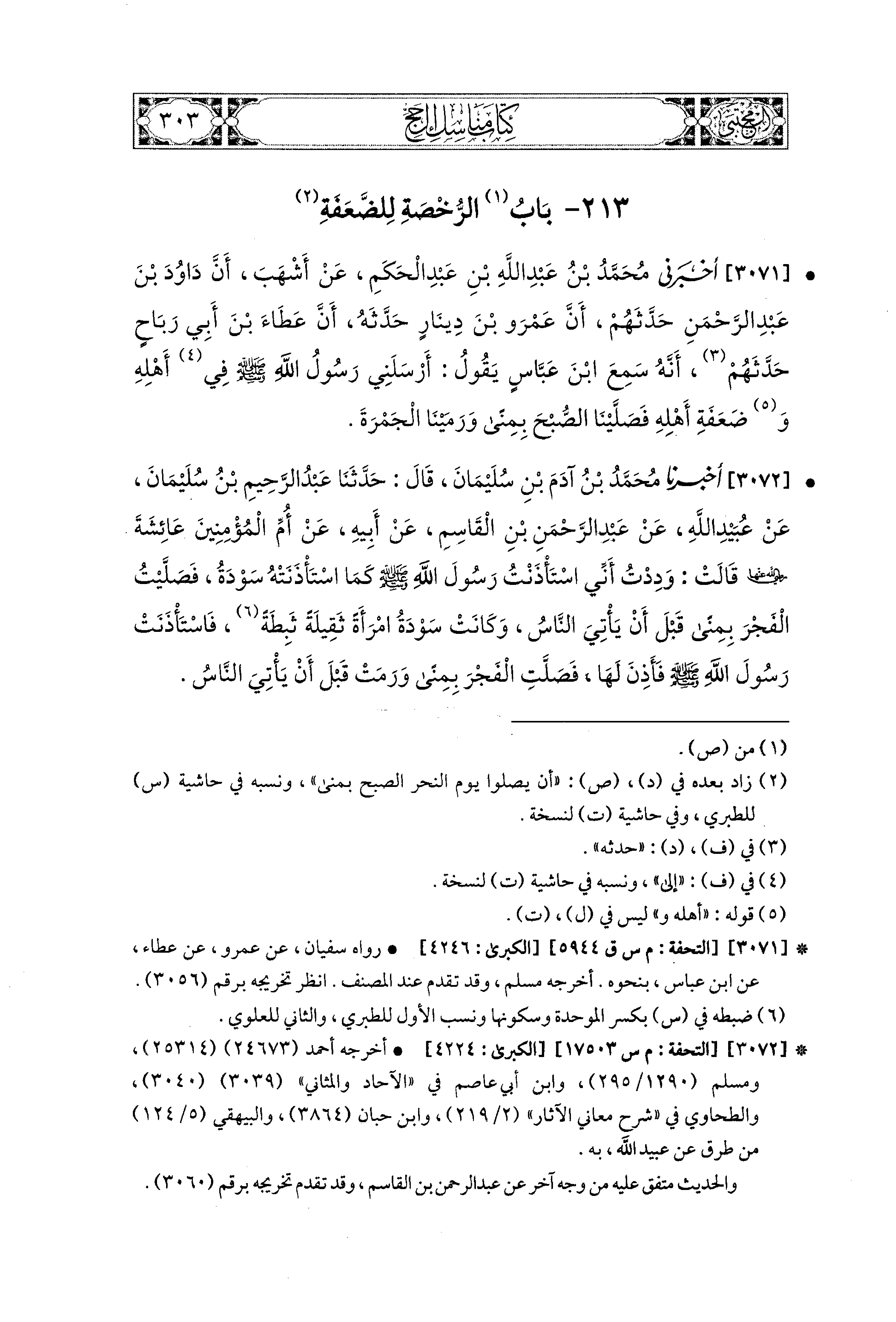 3072 - أَخبَرَنا مُحَمد بْنُ آدَمَ بْنِ سُلَيمَانَ، قال: حَدثنا عَبدُ الرَّحِيمِ بْنُ سُلَيمَانَ، عَن عُبَيدِ اللهِ، عَن عَبدِ الرَّحمَنِ بْنِ القَاسِمِ، عَن أَبيهِ، عَن أُمِّ المُؤْمِنينَ عَائِشَةَ رَضِيَ اللهُ عَنْهَا، قَالَتْ: وَدِدْتُ أَنِّي اسْتَأْذَنْتُ رَسُولَ اللهِ صَلى الله عَليه وسَلم كَمَا اسْتَأْذَنَتْهُ سَوْدَةُ، فَصَلَّيْتُ الفَجْرَ بِمِنًى قَبْلَ أَنْ يَأْتِيَ النَّاسُ، وَكَانَتْ سَوْدَةُ امْرَأَةً ثَقِيلَةً ثَبِطَةً، فَاسْتَأْذَنَتْ رَسُولَ اللهِ صَلى الله عَليه وسَلم، فَأَذِنَ لَهَا، فَصَلَّتِ الفَجْرَ بِمِنًى، وَرَمَتْ قَبْلَ أَنْ يَأْتِيَ النَّاسُ.