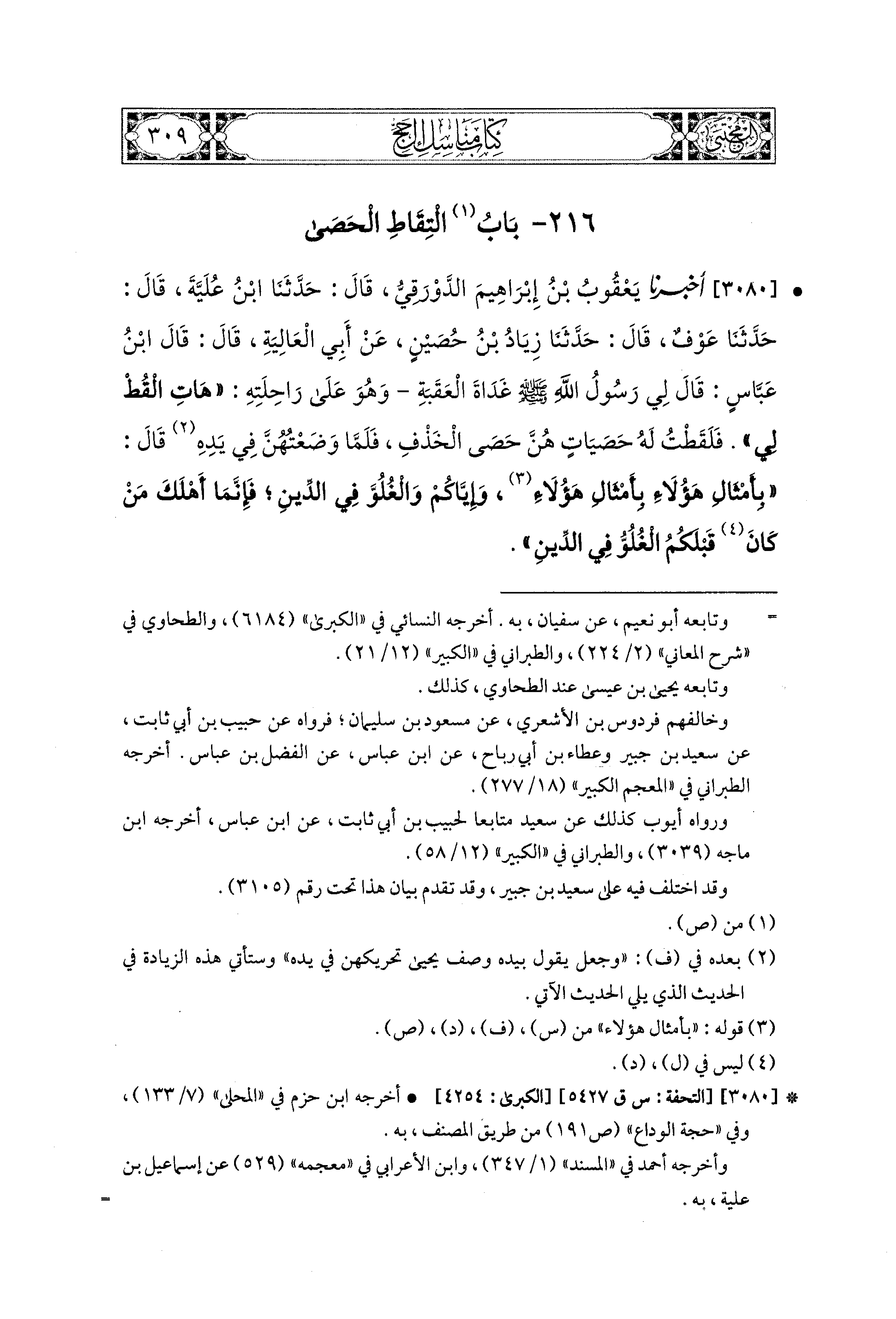 3080 - أَخبَرَنا يَعقُوبُ بْنُ إِبراهِيمَ الدَّوْرَقِيُّ، قال: حَدثنا ابنُ عُلَيَّةَ، قال: حَدثنا عَوْفٌ، قال: حَدثنا زِيَادُ بْنُ حُصَيْنٍ، عَن أَبي العَالِيَةِ، قَالَ: قَالَ ابنُ عَبَّاسٍ: قَالَ لِي رَسُولُ اللهِ صَلى الله عَليه وسَلم غَدَاةَ العَقَبَةِ وَهُوَ عَلَى رَاحِلَتِهِ: هَاتِ القُطْ لِي، فَلَقَطْتُ لَهُ حَصَيَاتٍ هُنَّ حَصَى الخَذْفِ، فَلَمَّا وَضَعْتُهُنَّ فِي يَدِهِ، قَالَ: بِأَمْثَالِ هَؤُلاَءِ، بِأَمْثَالِ هَؤُلاَءِ، وَإِيَّاكُمْ وَالغُلُوَّ فِي الدِّينِ، فَإِنَّمَا أَهْلَكَ مَنْ كَانَ قَبْلَكُمُ الغُلُوُّ فِي الدِّينِ.