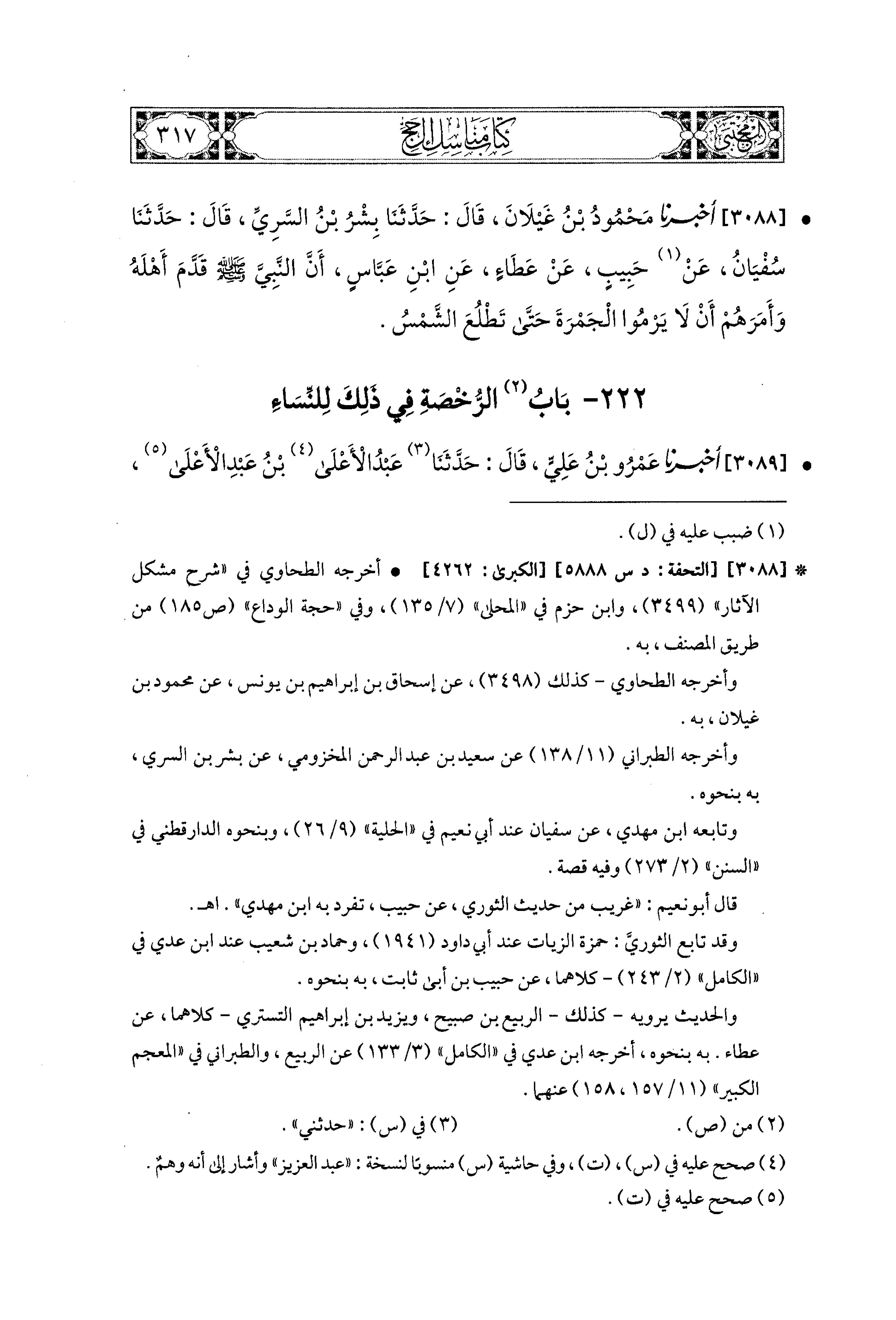 3088 - أَخبَرَنا مَحْمُودُ بْنُ غَيْلاَنَ، قال: حَدثنا بِشْرُ بْنُ السَّرِيِّ، قال: حَدثنا سُفيَانُ، عَن حَبِيبٍ، عَن عَطَاءٍ، عَنِ ابنِ عَبَّاسٍ أَنَّ النَّبيَّ صَلى الله عَليه وسَلم قَدَّمَ أَهْلَهُ، وَأَمَرَهُمْ أَنْ لاَ يَرْمُوا الجَمْرَةَ حَتَّى تَطْلُعَ الشَّمْسُ.