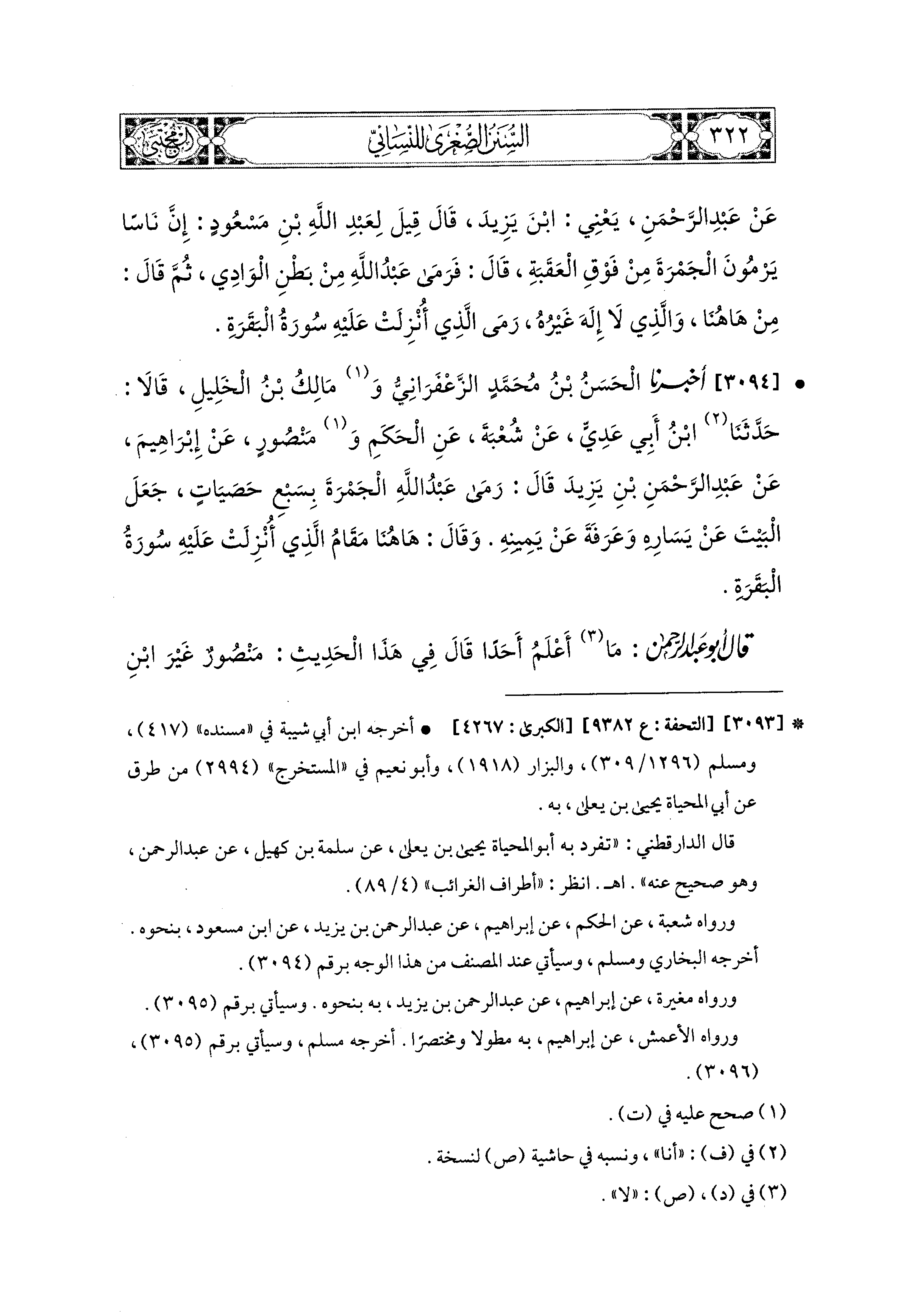 3094 - أَخبَرَنا الحَسَنُ بْنُ مُحَمدٍ الزَّعْفَرَانيُّ، وَمَالِكُ بْنُ الخَلِيلِ، قَالاَ: حَدَّثَنَا ابنُ أَبي عَدِيٍّ، عَن شُعبَةَ، عَنِ الحَكَمِ، وَمَنْصُورٌ، عَن إِبراهِيمَ، عَن عَبدِ الرَّحمَنِ بْنِ يَزِيدَ، قَالَ: رَمَى عَبدُ اللهِ الجَمْرَةَ بِسَبْعِ حَصَيَاتٍ، جَعَلَ البَيْتَ عَن يَسَارِهِ، وَعَرَفَةَ عَن يَمينِهِ، وَقَالَ: هَاهُنَا مَقَامُ الَّذِي أُنْزِلَتْ عَلَيهِ سُورَةُ البَقَرَةِ.