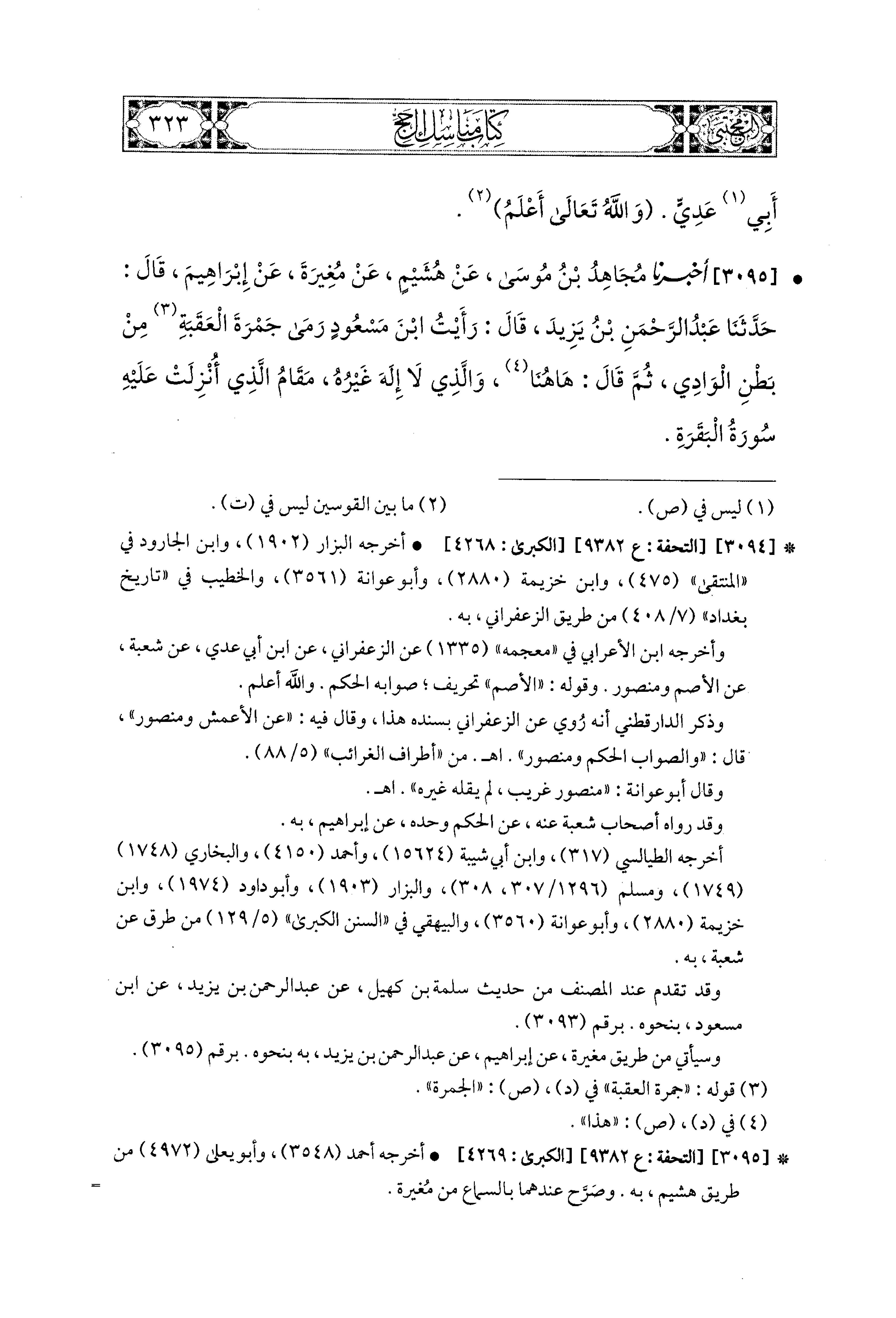3095 - أَخبَرَنا مُجَاهِدُ بْنُ مُوسَى، عَن هُشَيْمٍ، عَن مُغِيرَةَ، عَن إِبراهِيمَ، قال: حَدثنا عَبدُ الرَّحمَنِ بْنُ يَزِيدَ، قَالَ: رَأَيْتُ ابنَ مَسْعُودٍ رَمَى جَمْرَةَ العَقَبَةِ مِنْ بَطْنِ الوَادِي، ثُمَّ قَالَ: هَاهُنَا، وَالَّذِي لاَ إِلَهَ غَيْرُهُ مَقَامُ الَّذِي أُنْزِلَتْ عَلَيهِ سُورَةُ البَقَرَةِ.